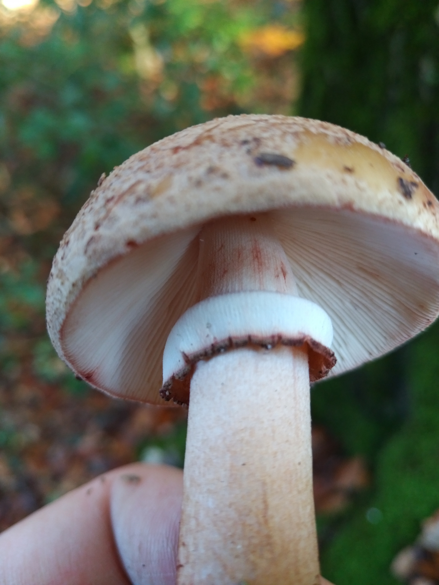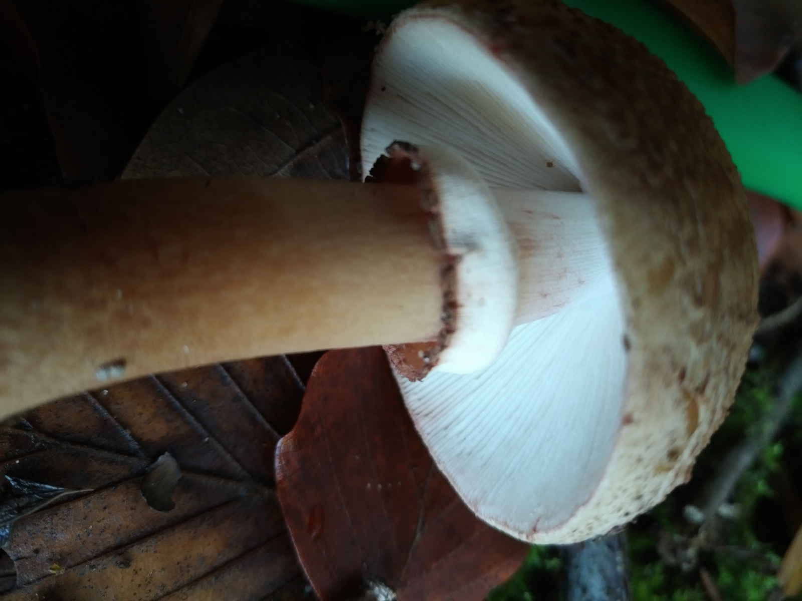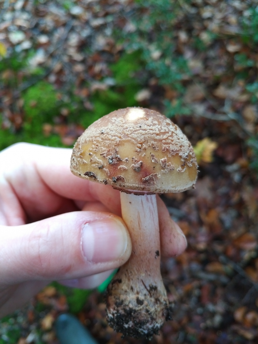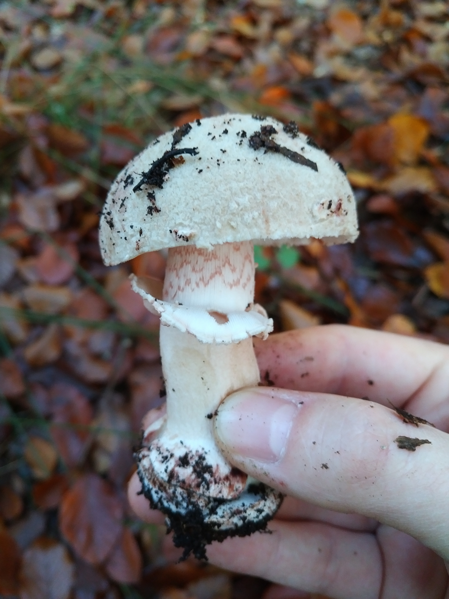 Fruchtkörper Nr. 2 - Da die Velumreste auf der Huthaut noch nicht zu Flocken auseinandergerissen sind, bin ich mir etwas unsicher, ob das definitiv ein Perlpilz ist. Habe bisher noch nicht viele so junge Fruchtkörper gesehen.