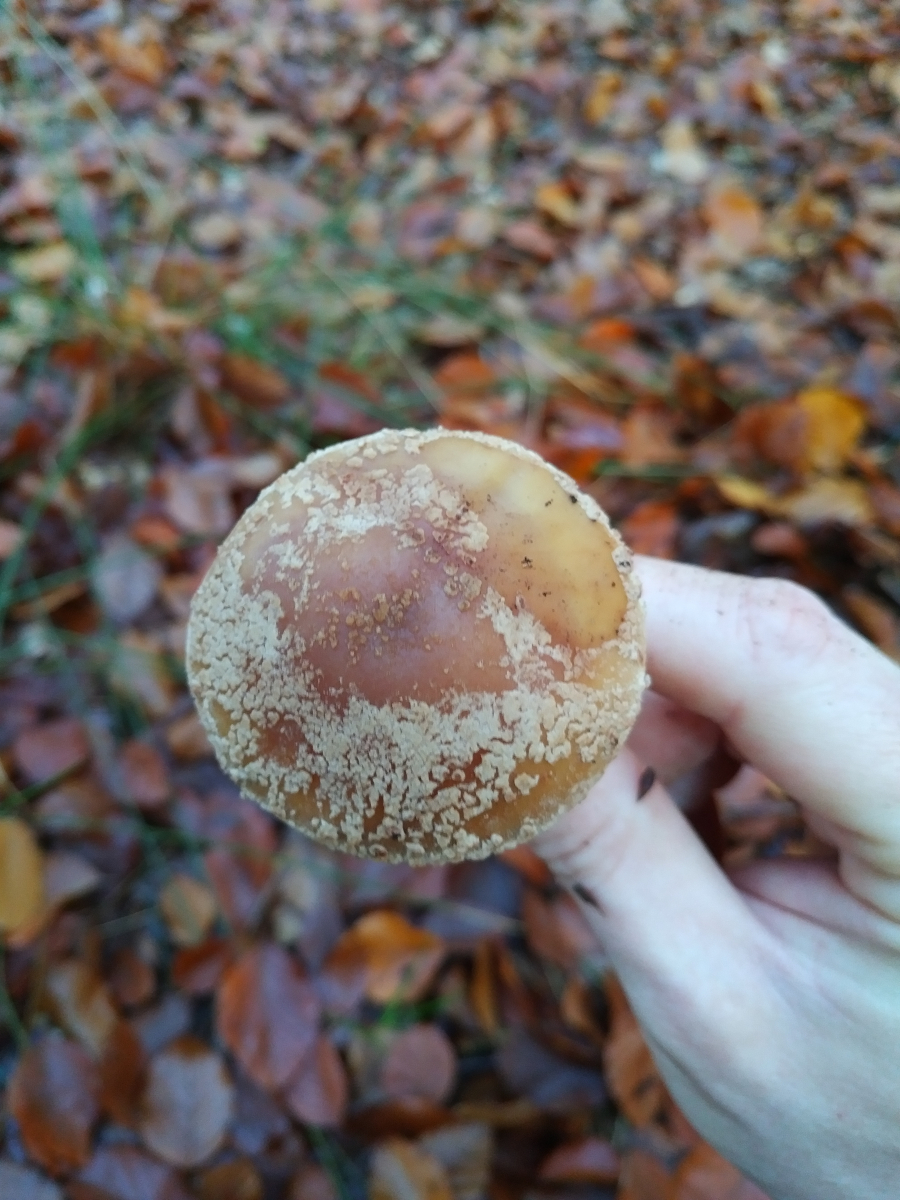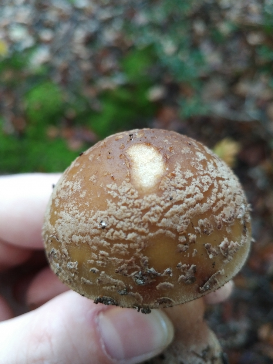 Fruchtkörper Nr. 2 - Da die Velumreste auf der Huthaut noch nicht zu Flocken auseinandergerissen sind, bin ich mir etwas unsicher, ob das definitiv ein Perlpilz ist. Habe bisher noch nicht viele so junge Fruchtkörper gesehen.