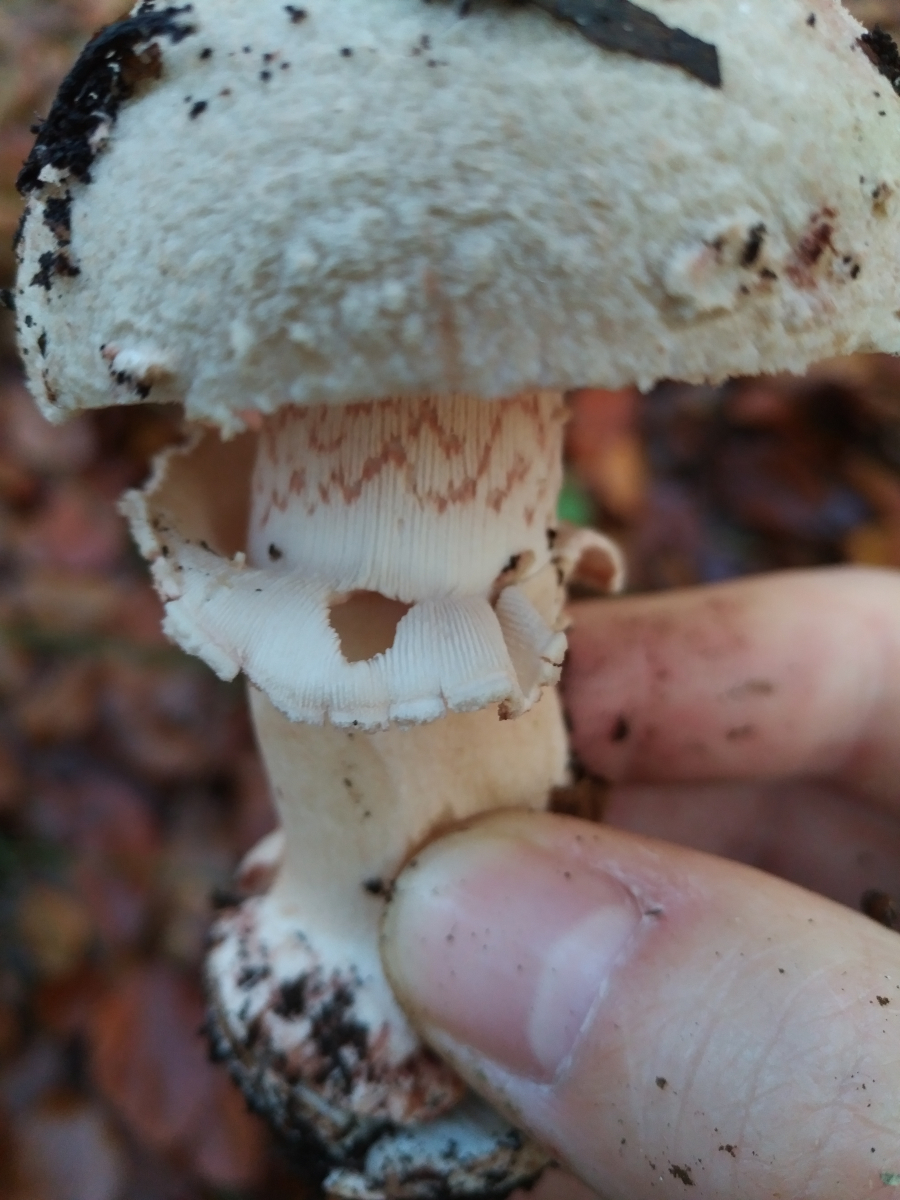 Wenn man rötende Stellen sieht und geriefte Manschette , kann man von Perlpilz ausgehen.