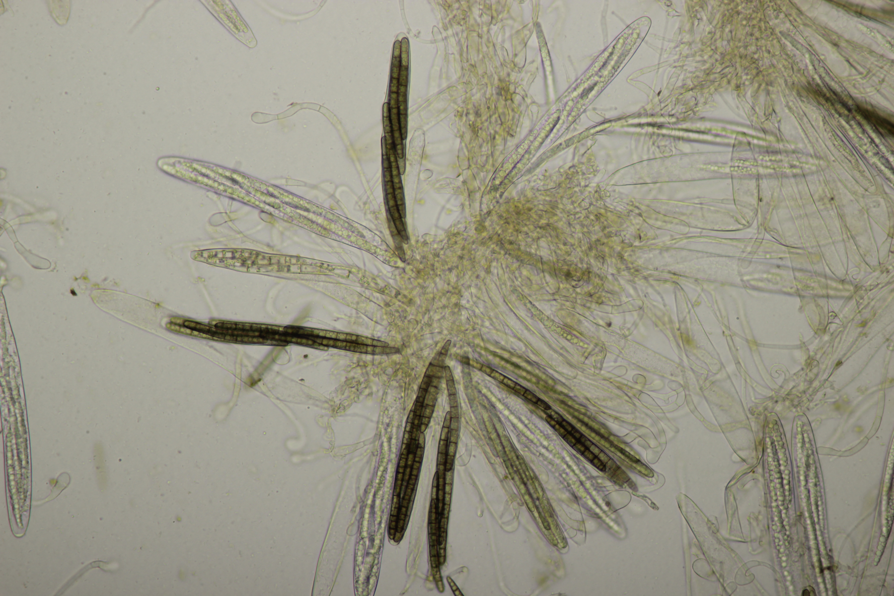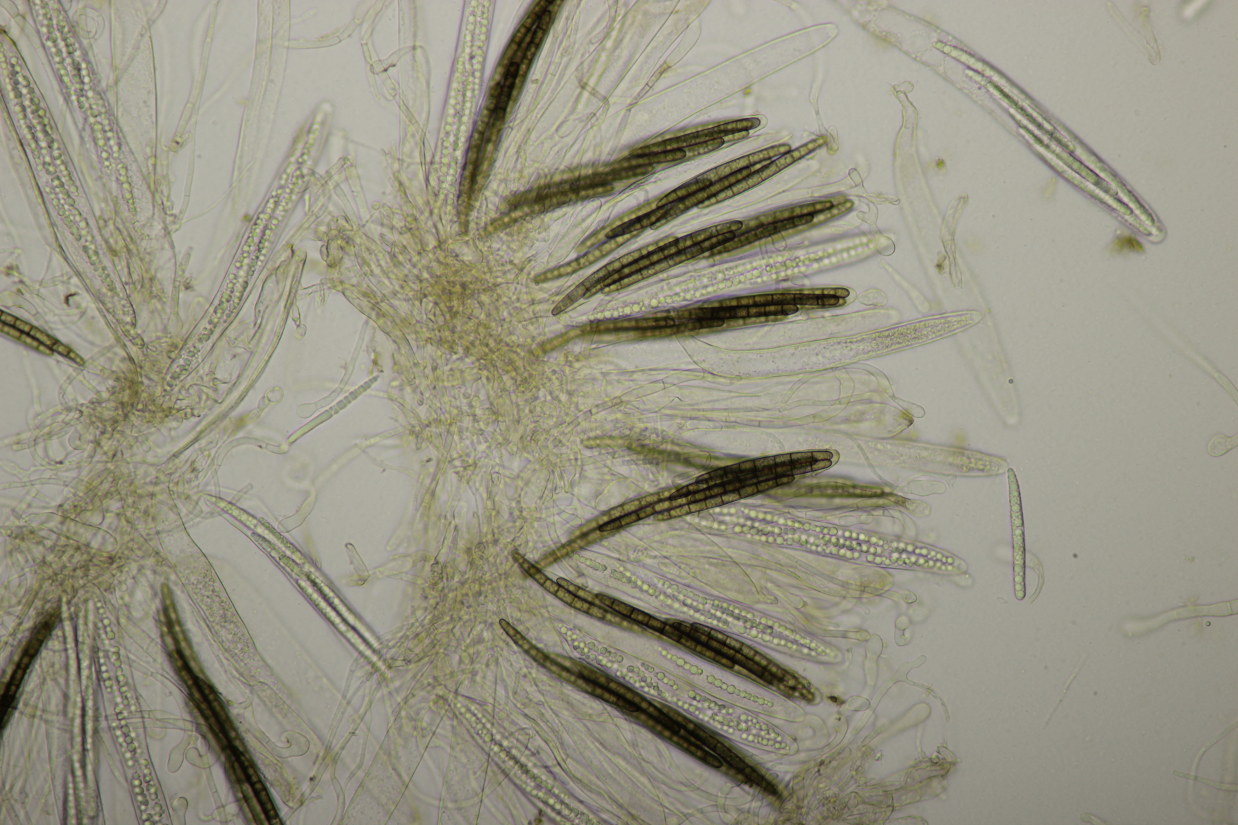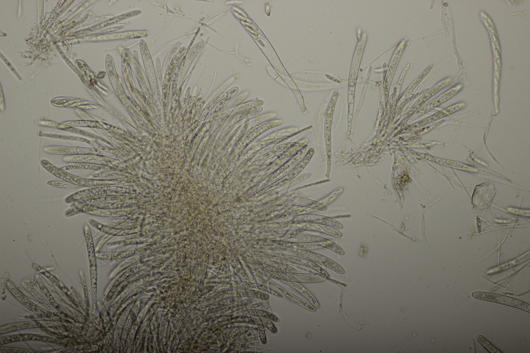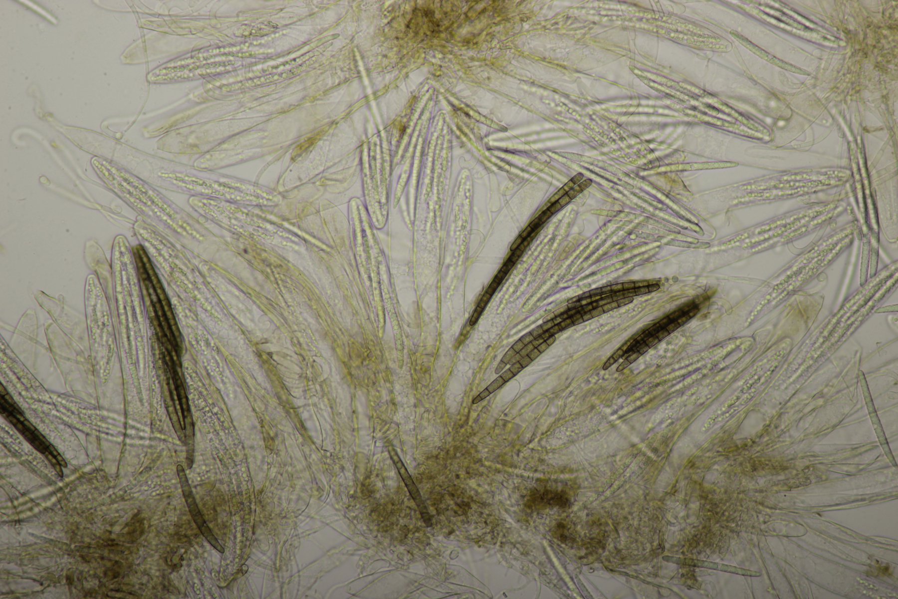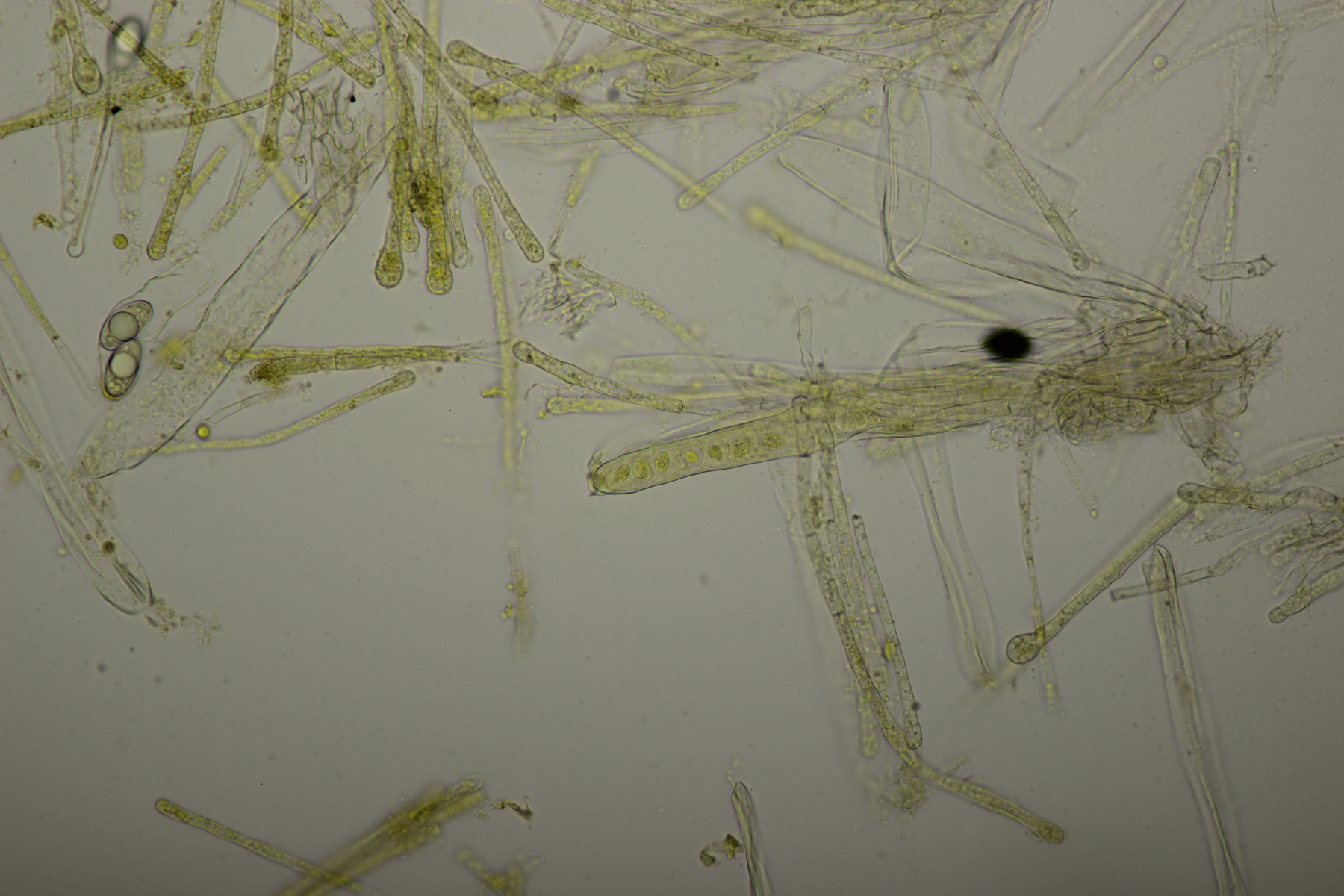 1. Geoglossum elongatum. Zunächst war ich irritiert, daß die Sporen im Abwurf alle ihre Septen verloren hatten. Dann hat Karl mich aber aufgeklärt, daß das ein Charakteristikum von von G. fallax und G. elongatum ist. Mit Sporenlängen im Bereich von 60-70 µm war G. fallax dann rasch ausgeschlossen.