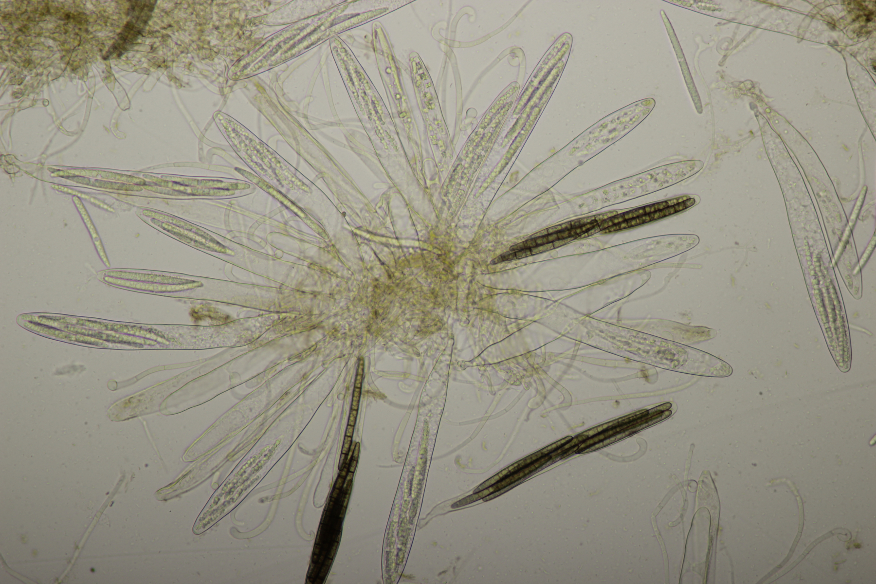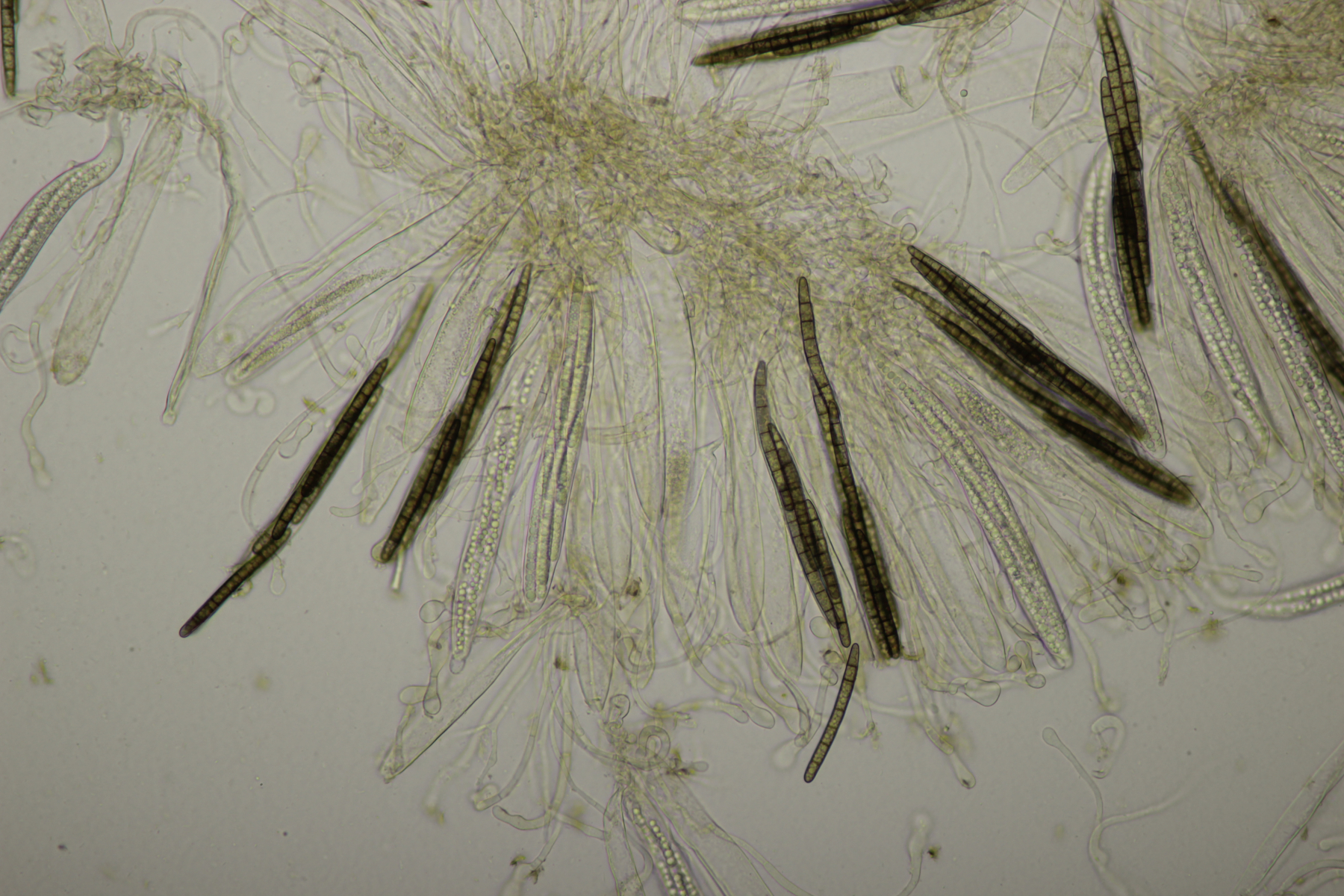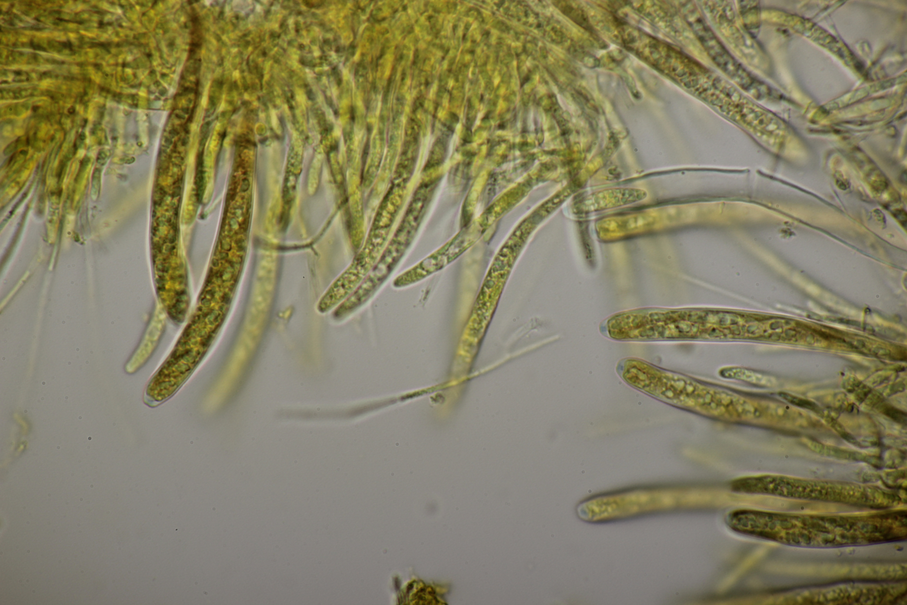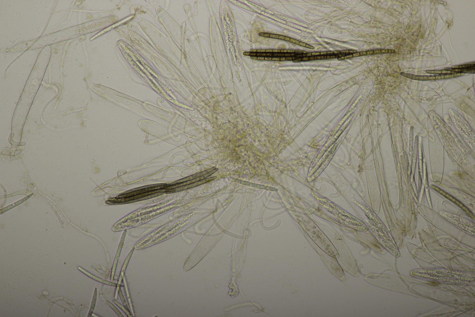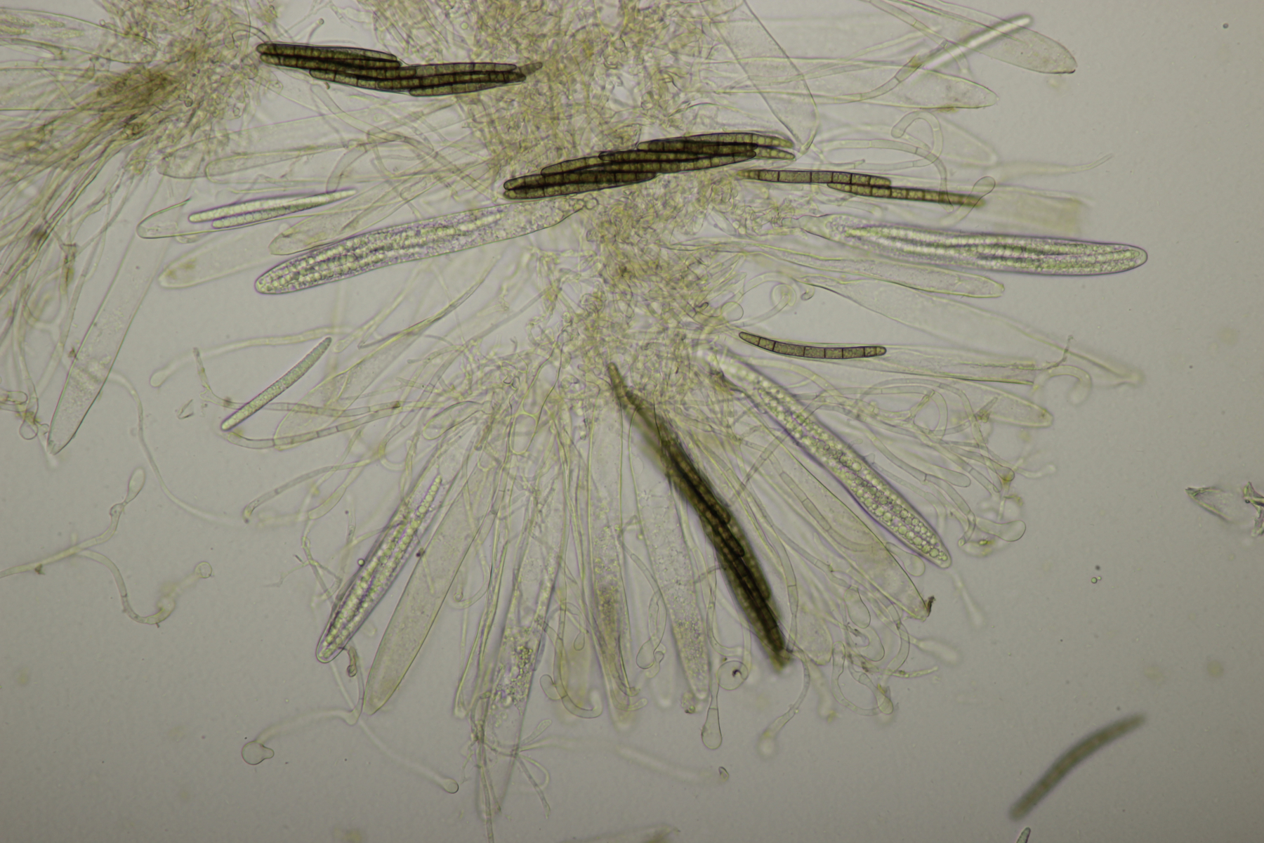 1. Geoglossum elongatum. Zunächst war ich irritiert, daß die Sporen im Abwurf alle ihre Septen verloren hatten. Dann hat Karl mich aber aufgeklärt, daß das ein Charakteristikum von von G. fallax und G. elongatum ist. Mit Sporenlängen im Bereich von 60-70 µm war G. fallax dann rasch ausgeschlossen.