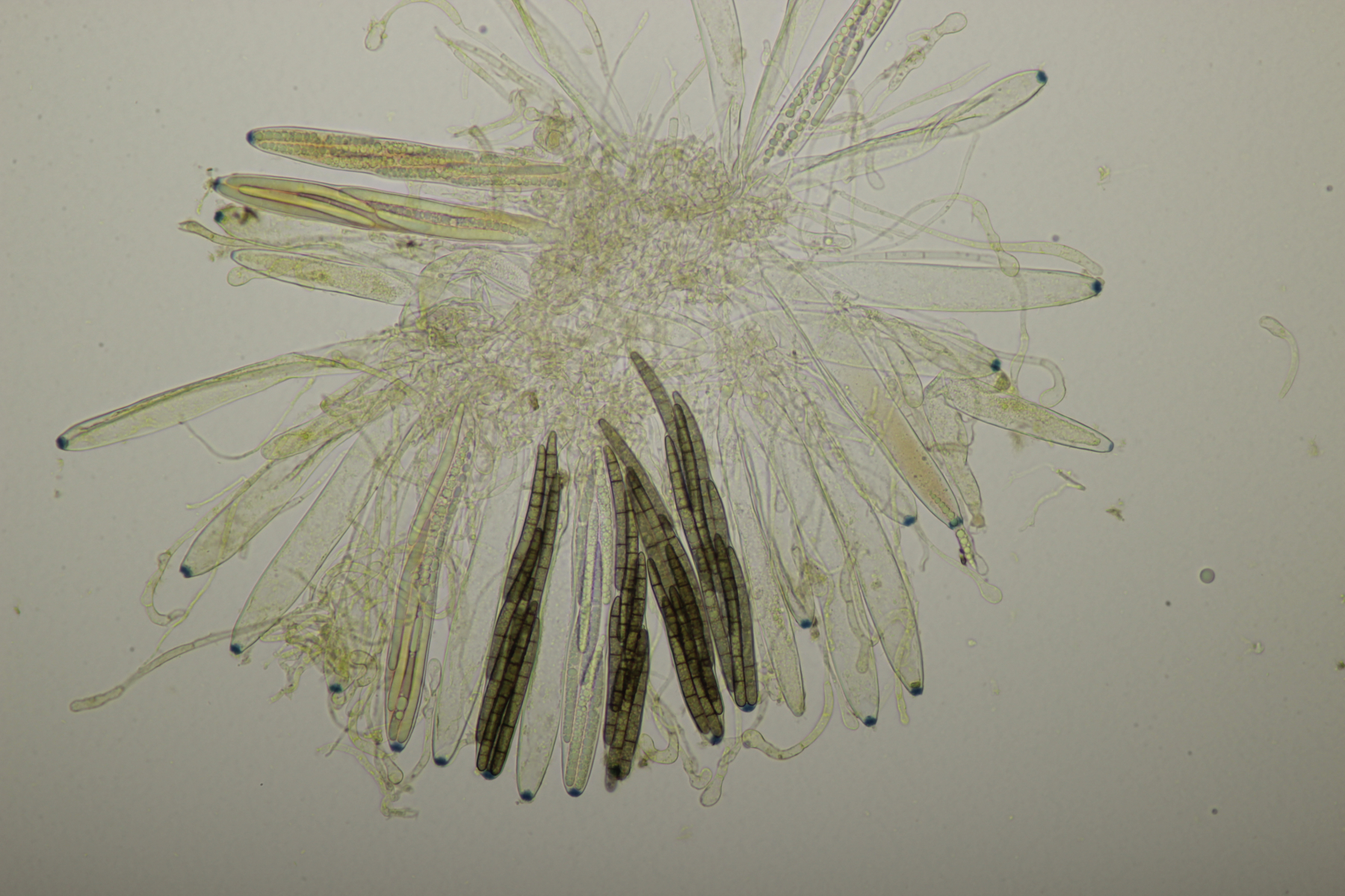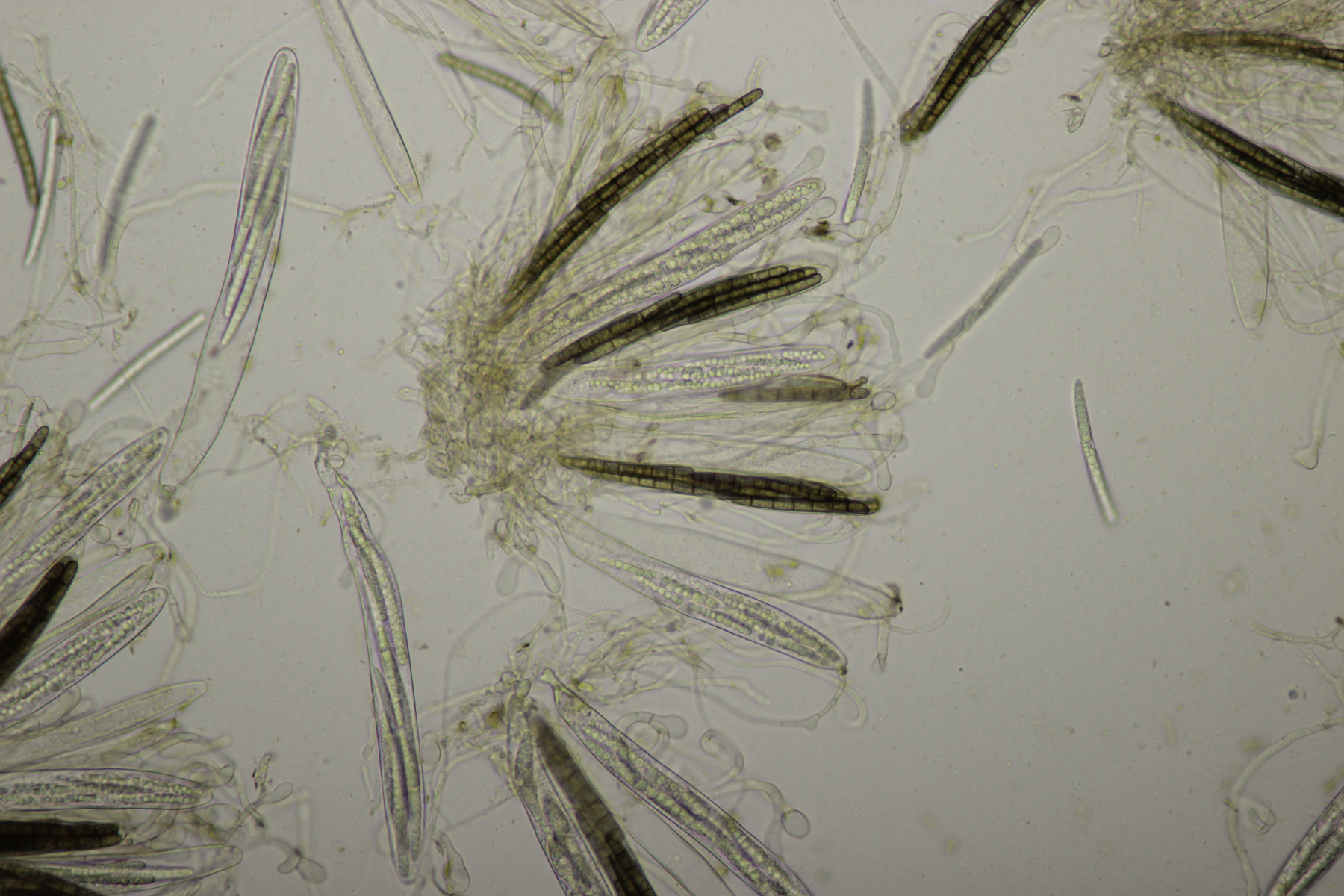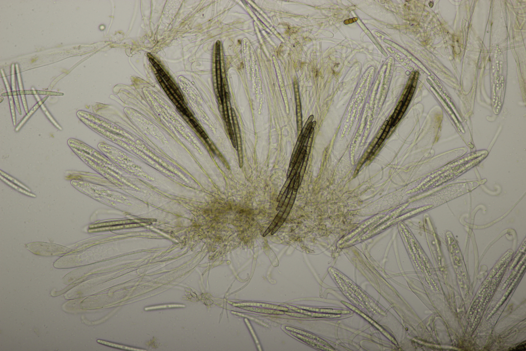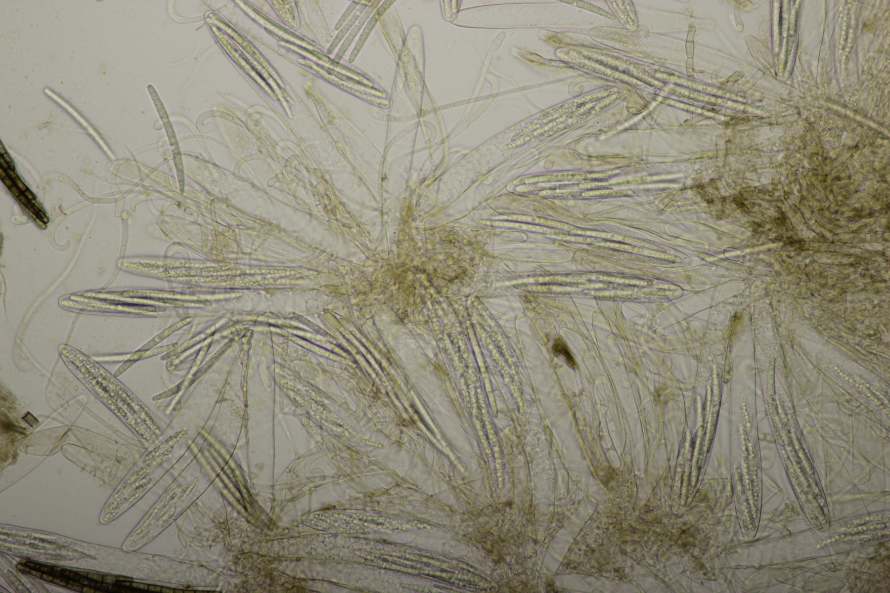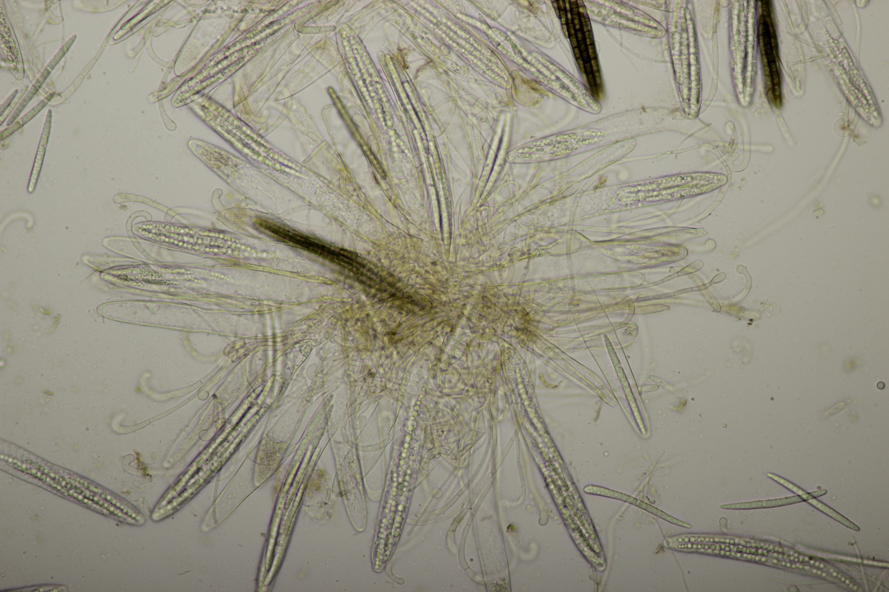 1. Geoglossum elongatum. Zunächst war ich irritiert, daß die Sporen im Abwurf alle ihre Septen verloren hatten. Dann hat Karl mich aber aufgeklärt, daß das ein Charakteristikum von von G. fallax und G. elongatum ist. Mit Sporenlängen im Bereich von 60-70 µm war G. fallax dann rasch ausgeschlossen.