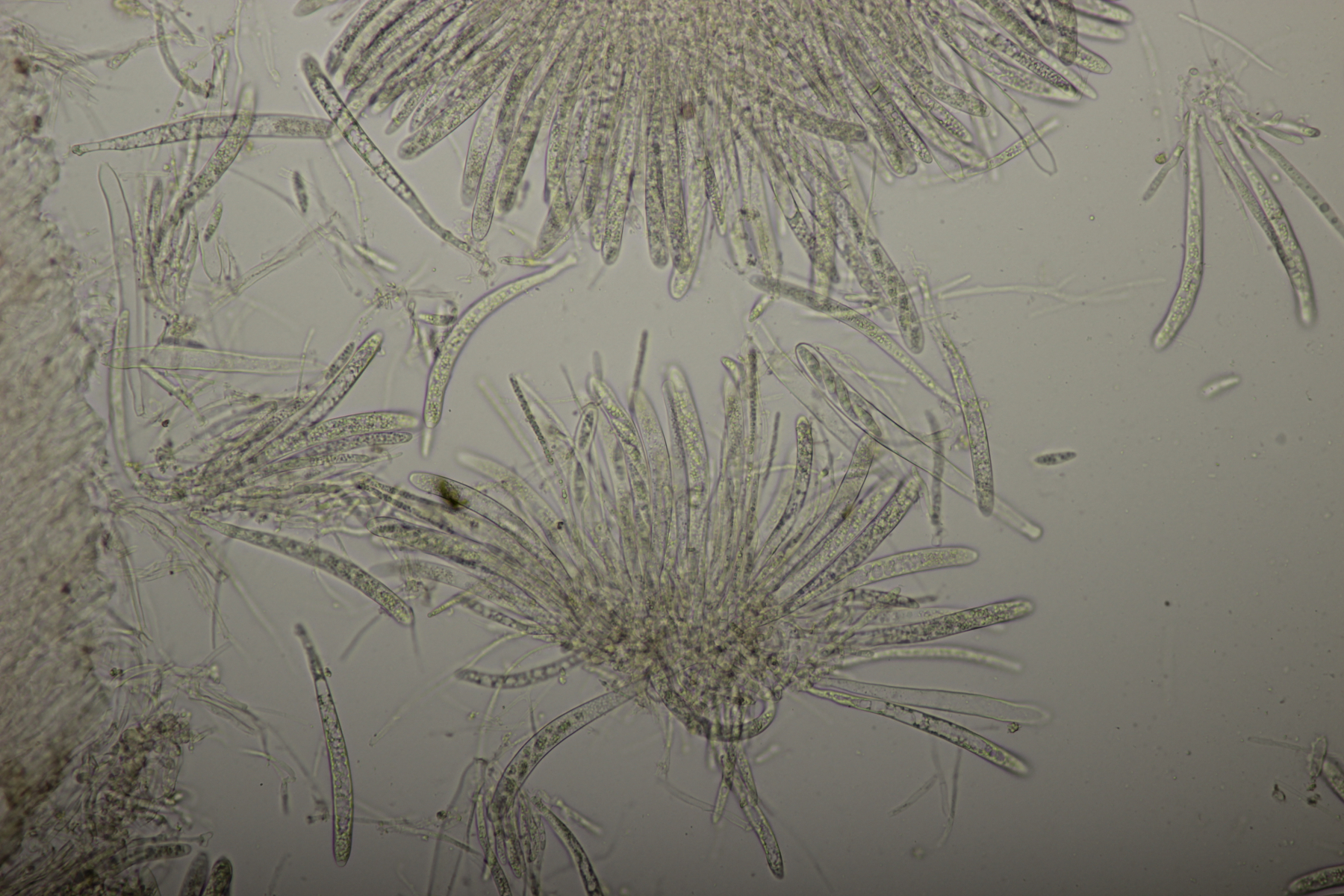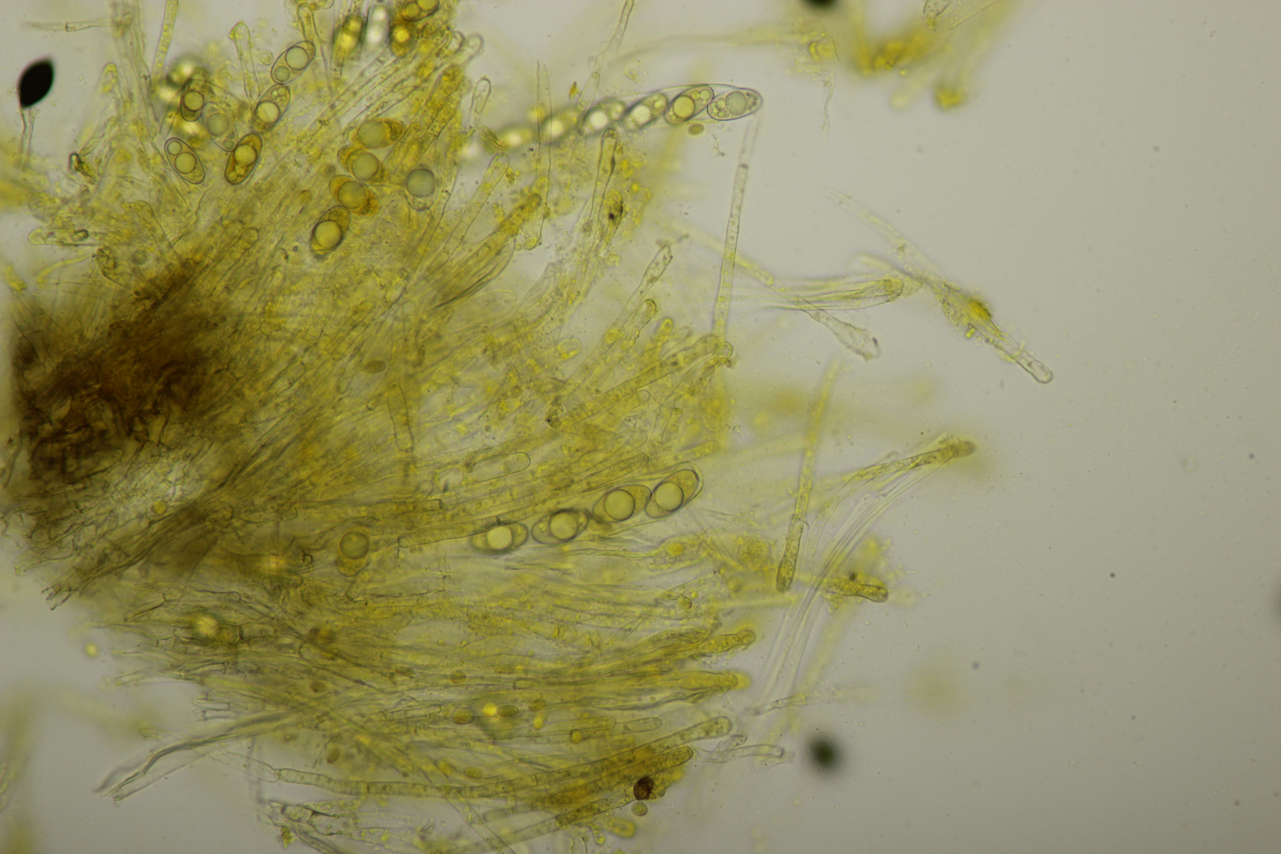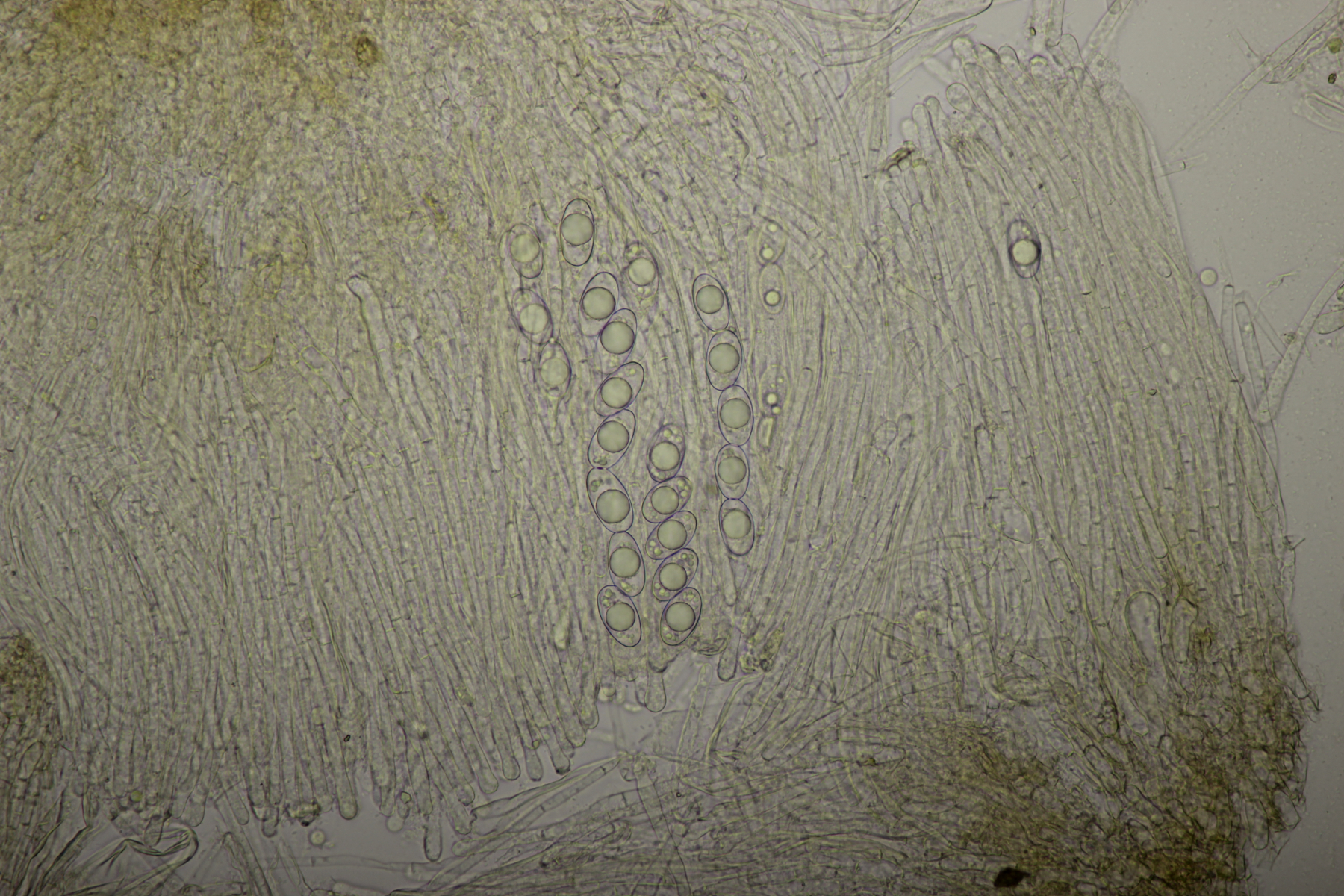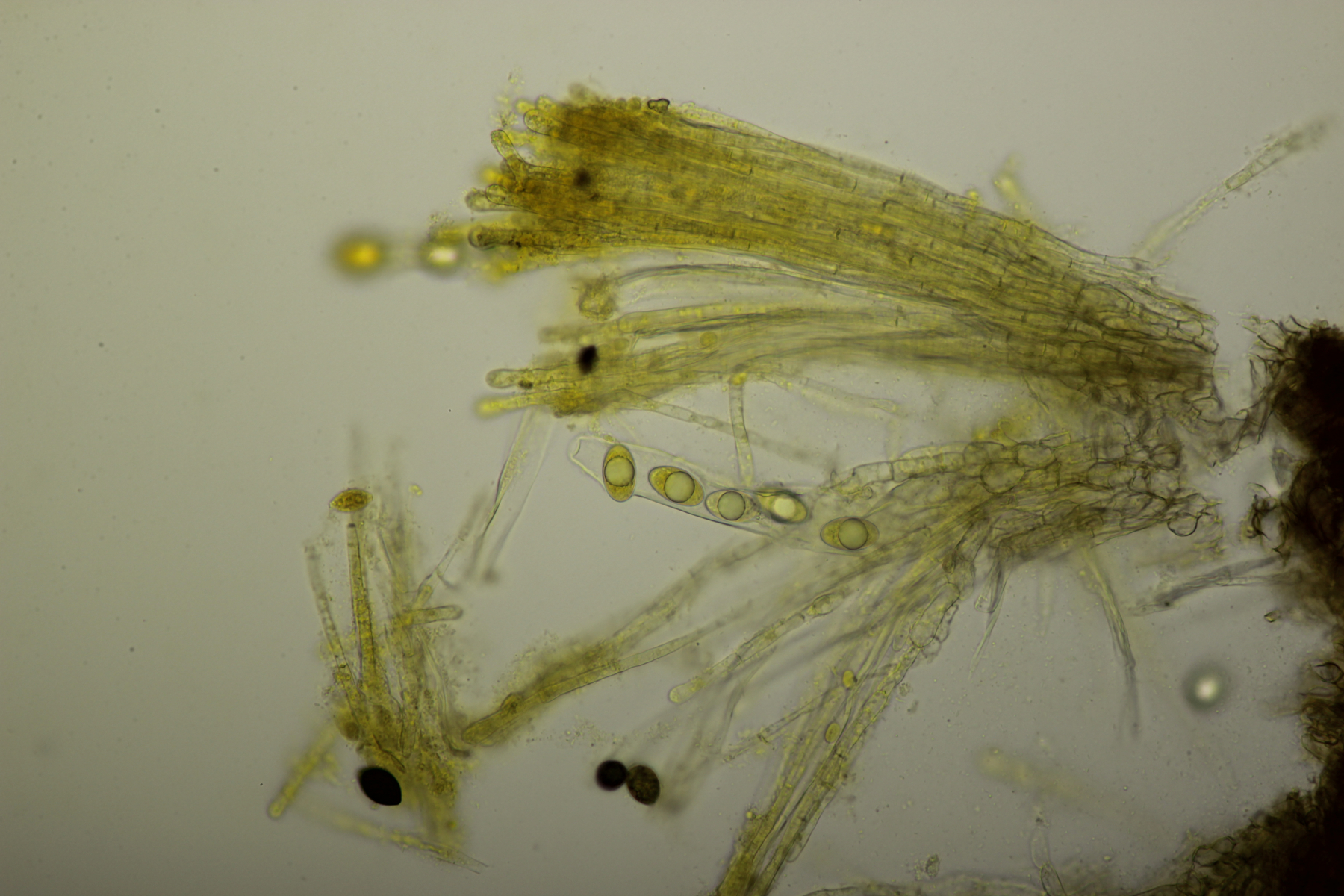 1. Geoglossum elongatum. Zunächst war ich irritiert, daß die Sporen im Abwurf alle ihre Septen verloren hatten. Dann hat Karl mich aber aufgeklärt, daß das ein Charakteristikum von von G. fallax und G. elongatum ist. Mit Sporenlängen im Bereich von 60-70 µm war G. fallax dann rasch ausgeschlossen.