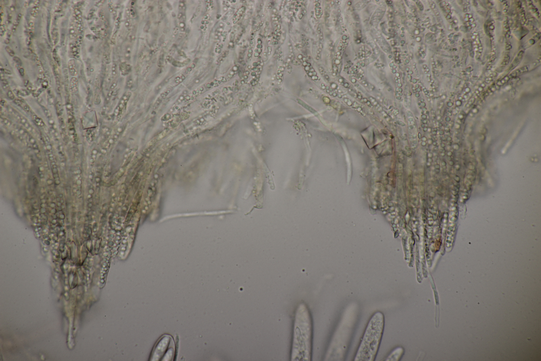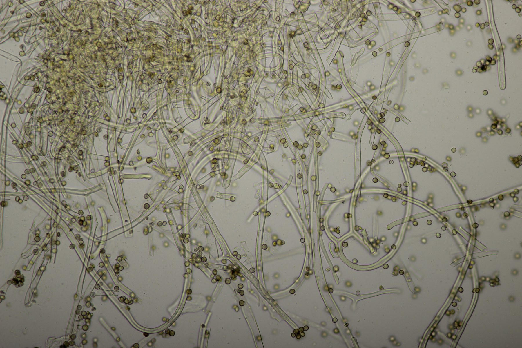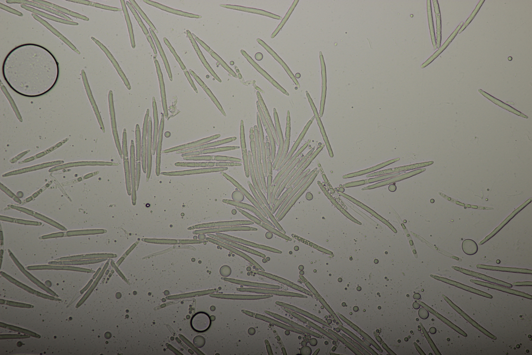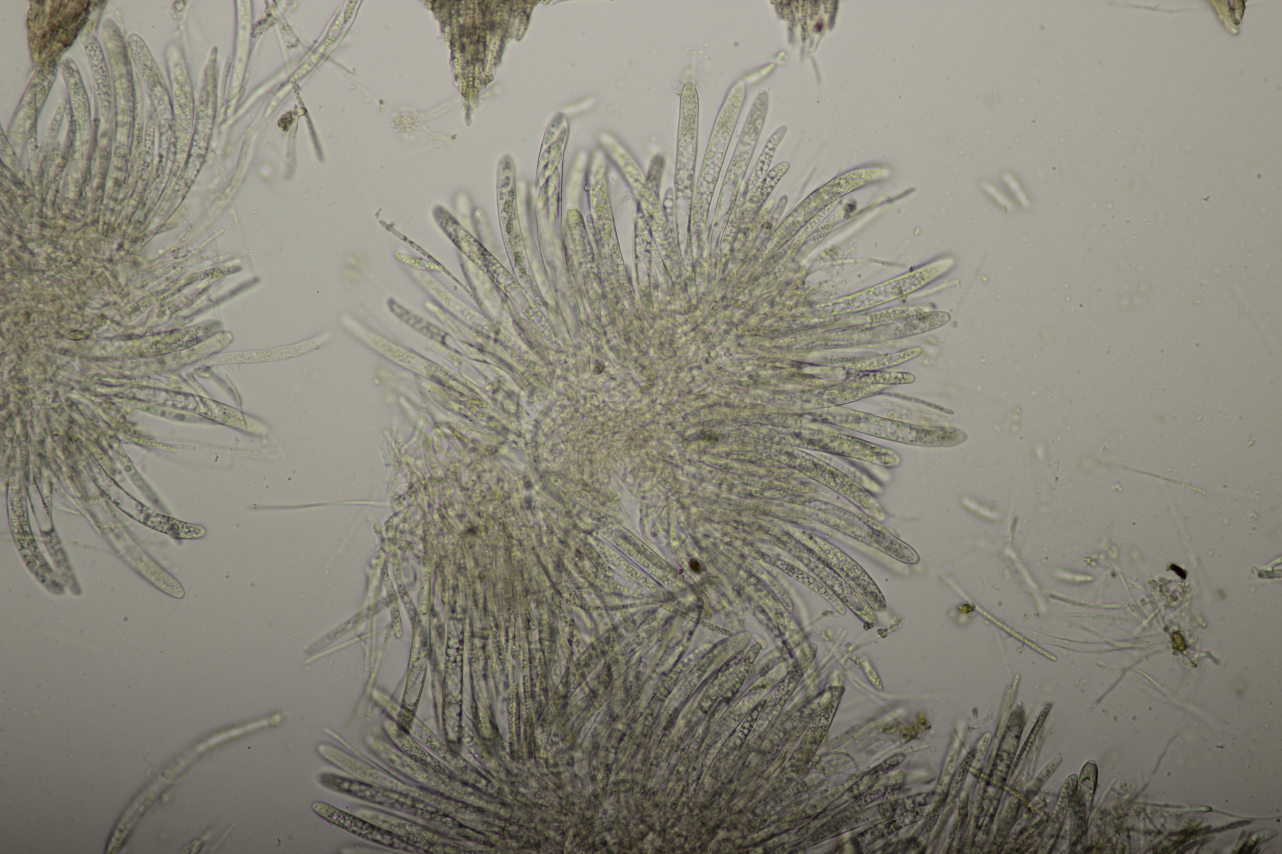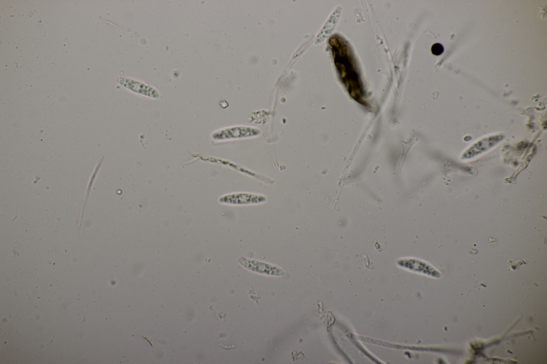 1. Geoglossum elongatum. Zunächst war ich irritiert, daß die Sporen im Abwurf alle ihre Septen verloren hatten. Dann hat Karl mich aber aufgeklärt, daß das ein Charakteristikum von von G. fallax und G. elongatum ist. Mit Sporenlängen im Bereich von 60-70 µm war G. fallax dann rasch ausgeschlossen.