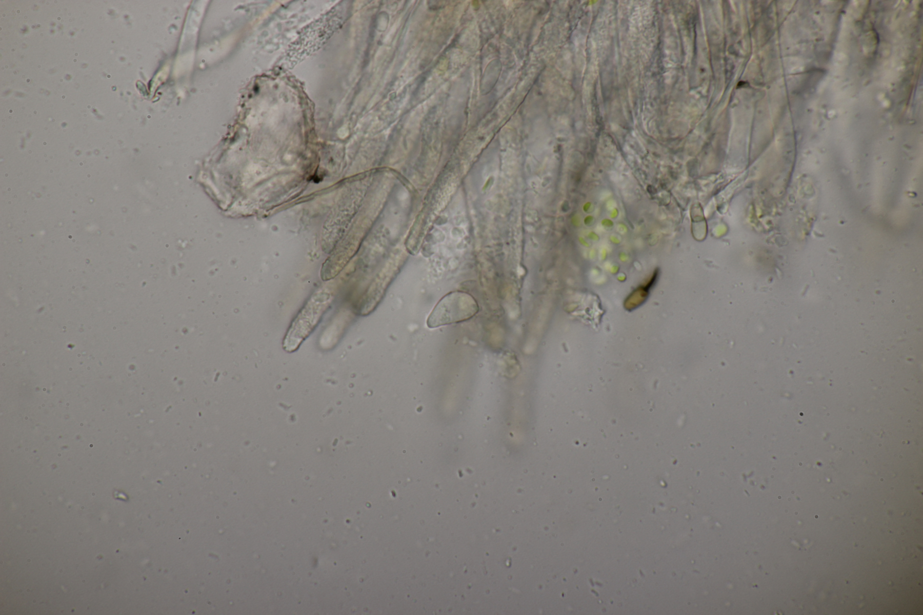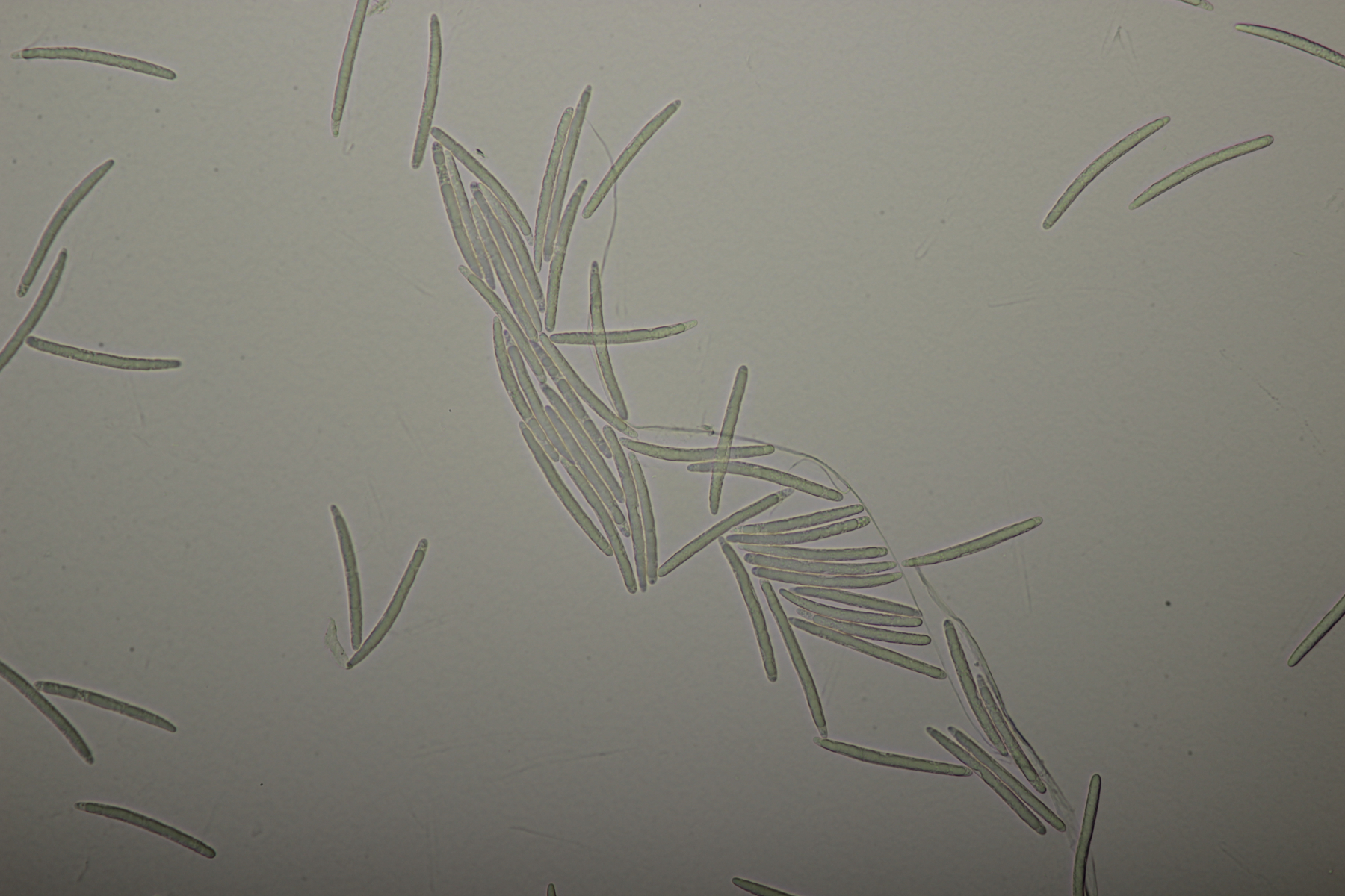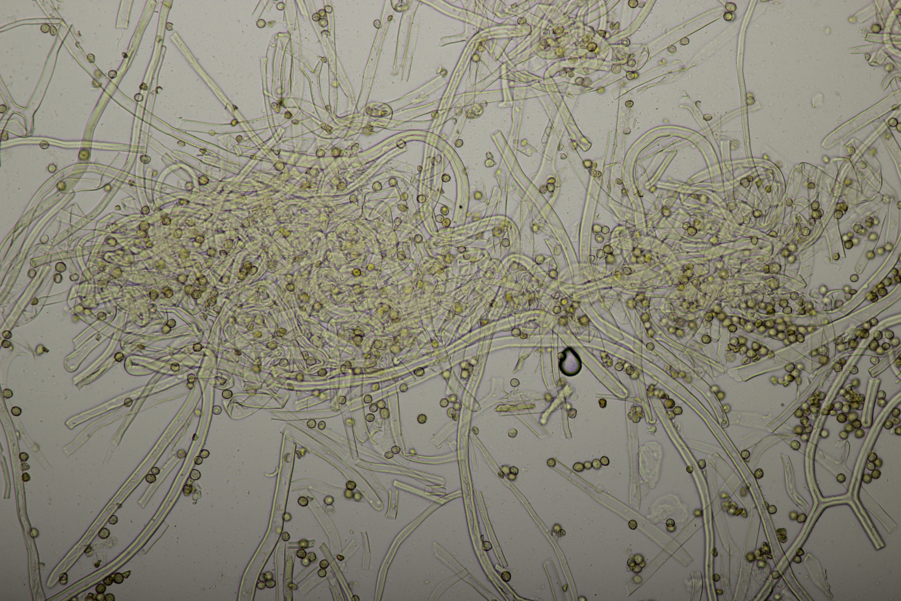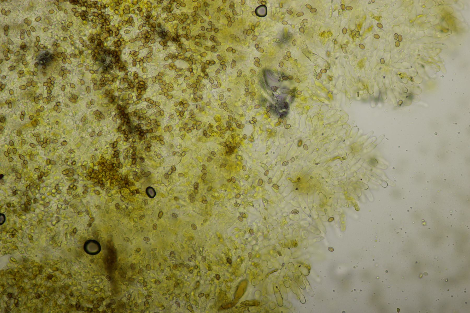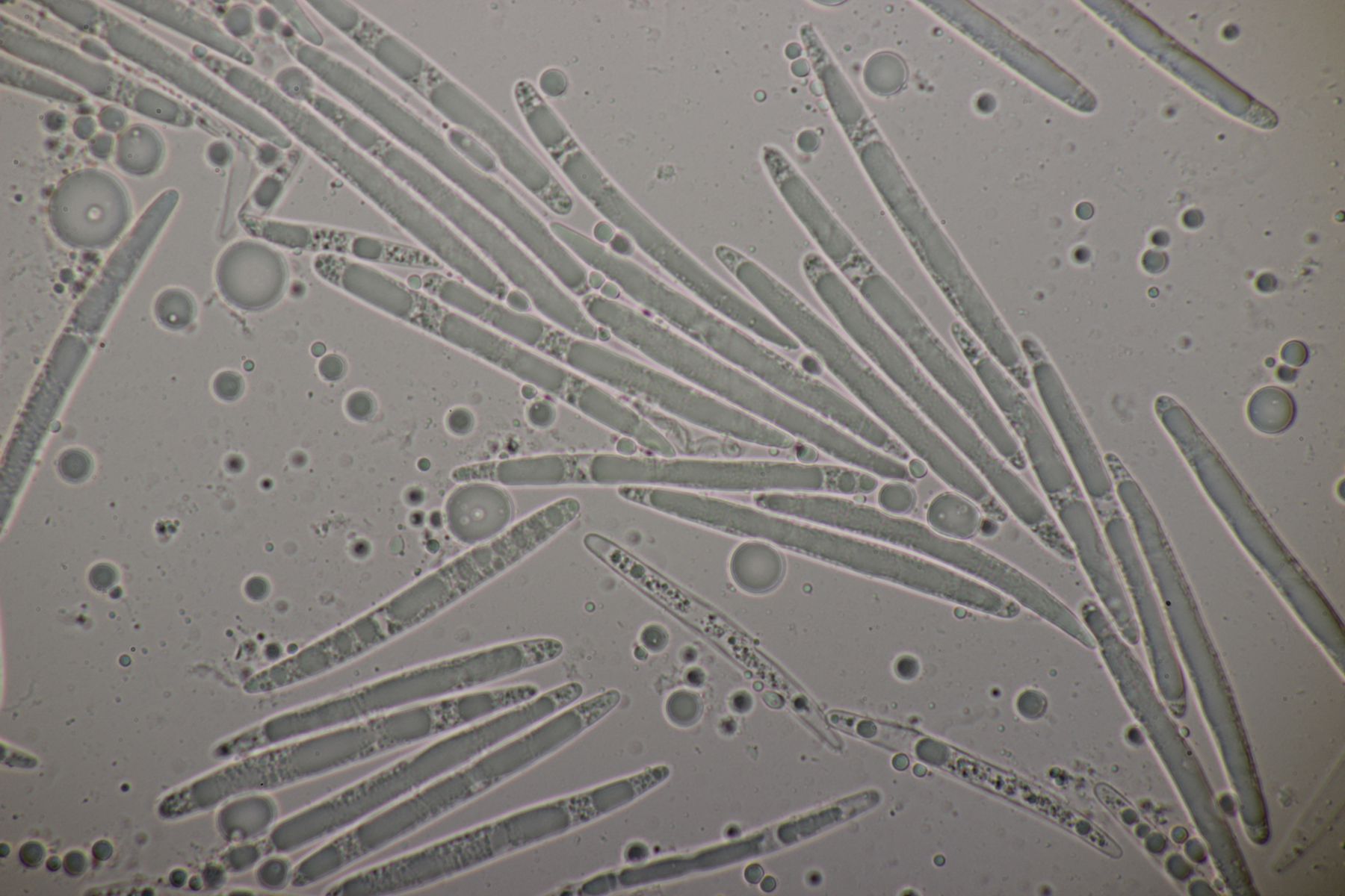 1. Geoglossum elongatum. Zunächst war ich irritiert, daß die Sporen im Abwurf alle ihre Septen verloren hatten. Dann hat Karl mich aber aufgeklärt, daß das ein Charakteristikum von von G. fallax und G. elongatum ist. Mit Sporenlängen im Bereich von 60-70 µm war G. fallax dann rasch ausgeschlossen.
