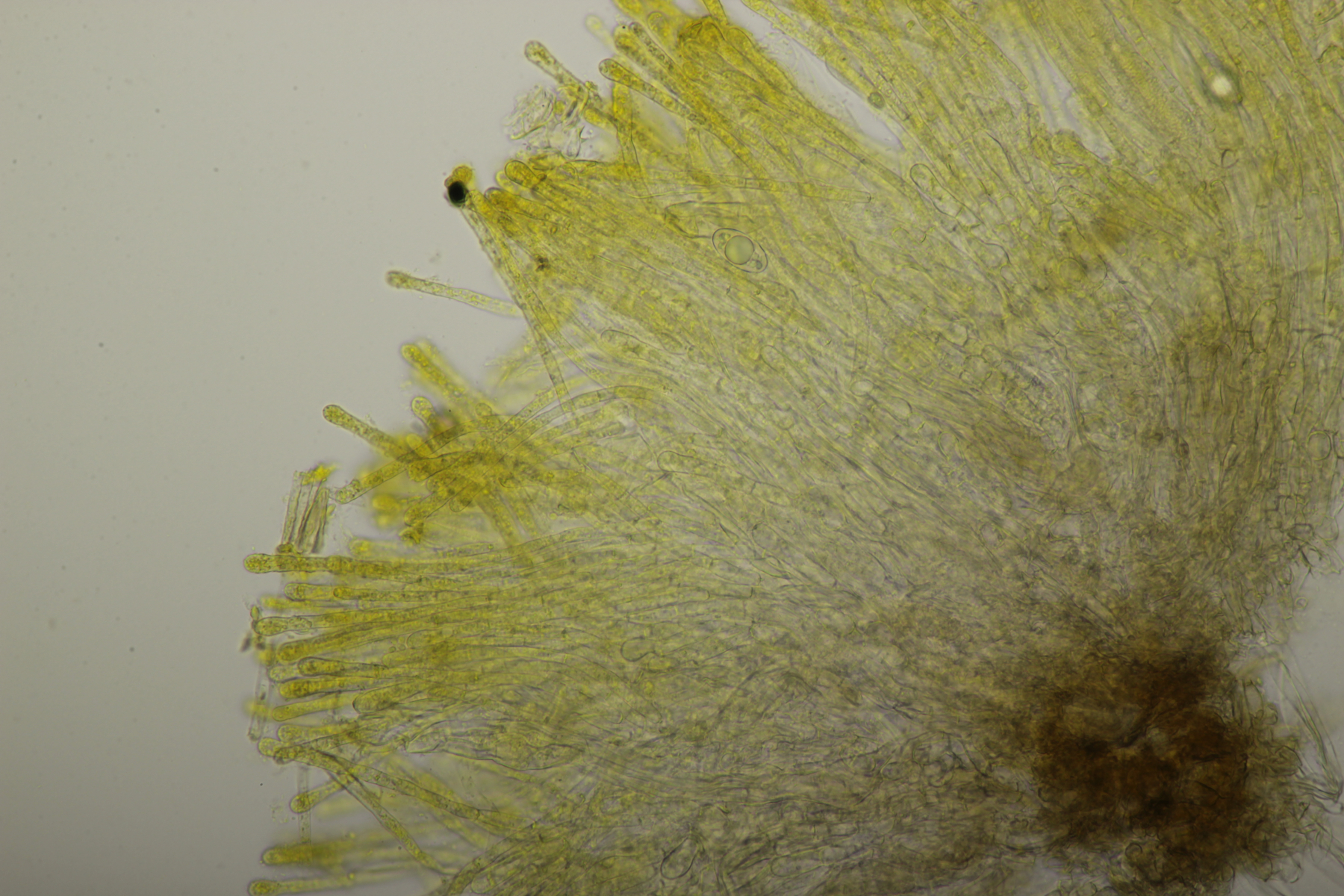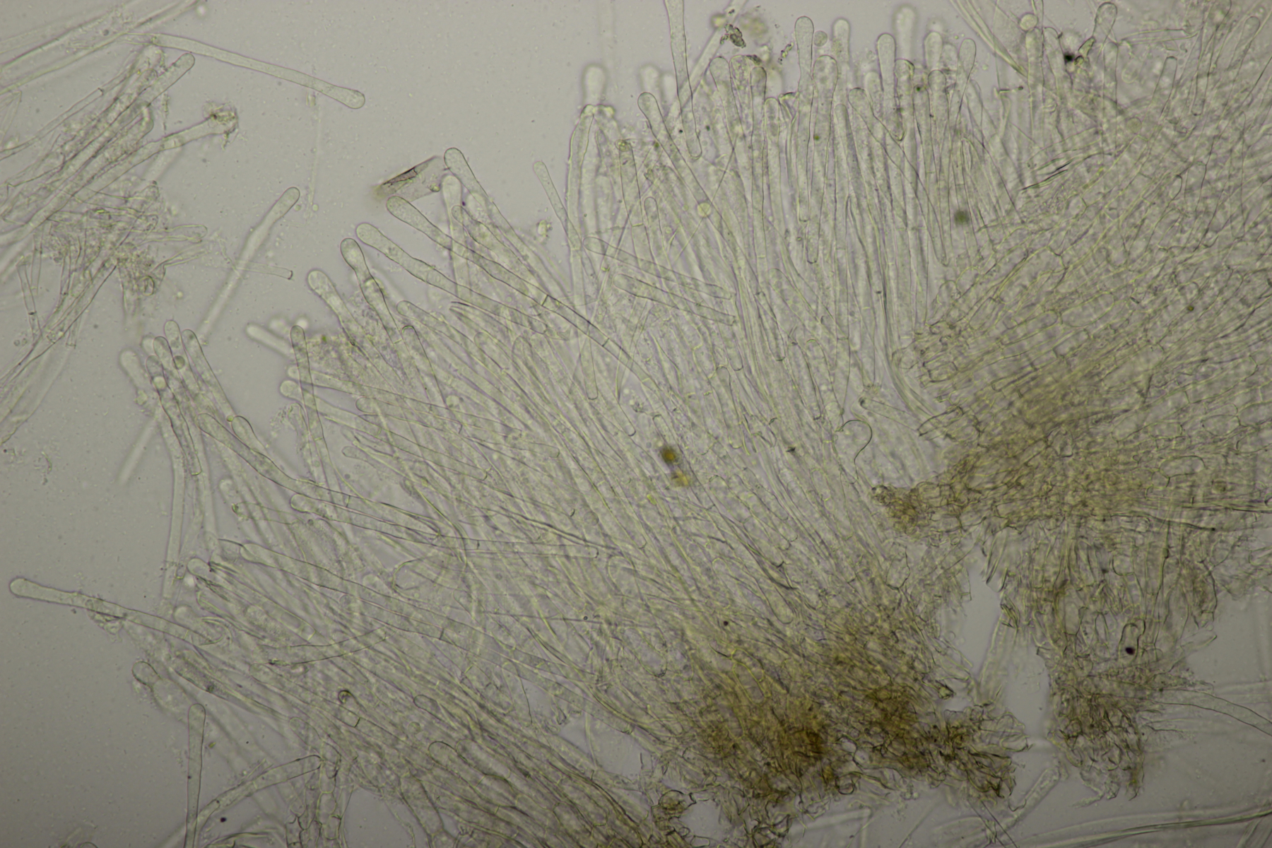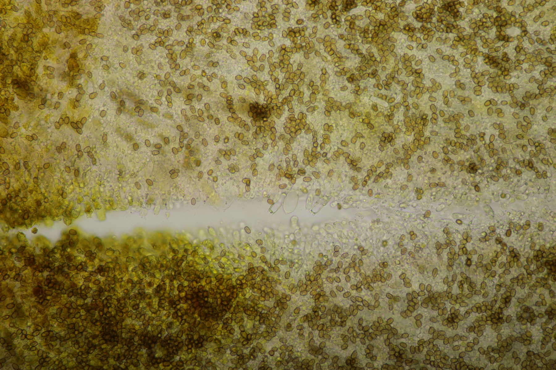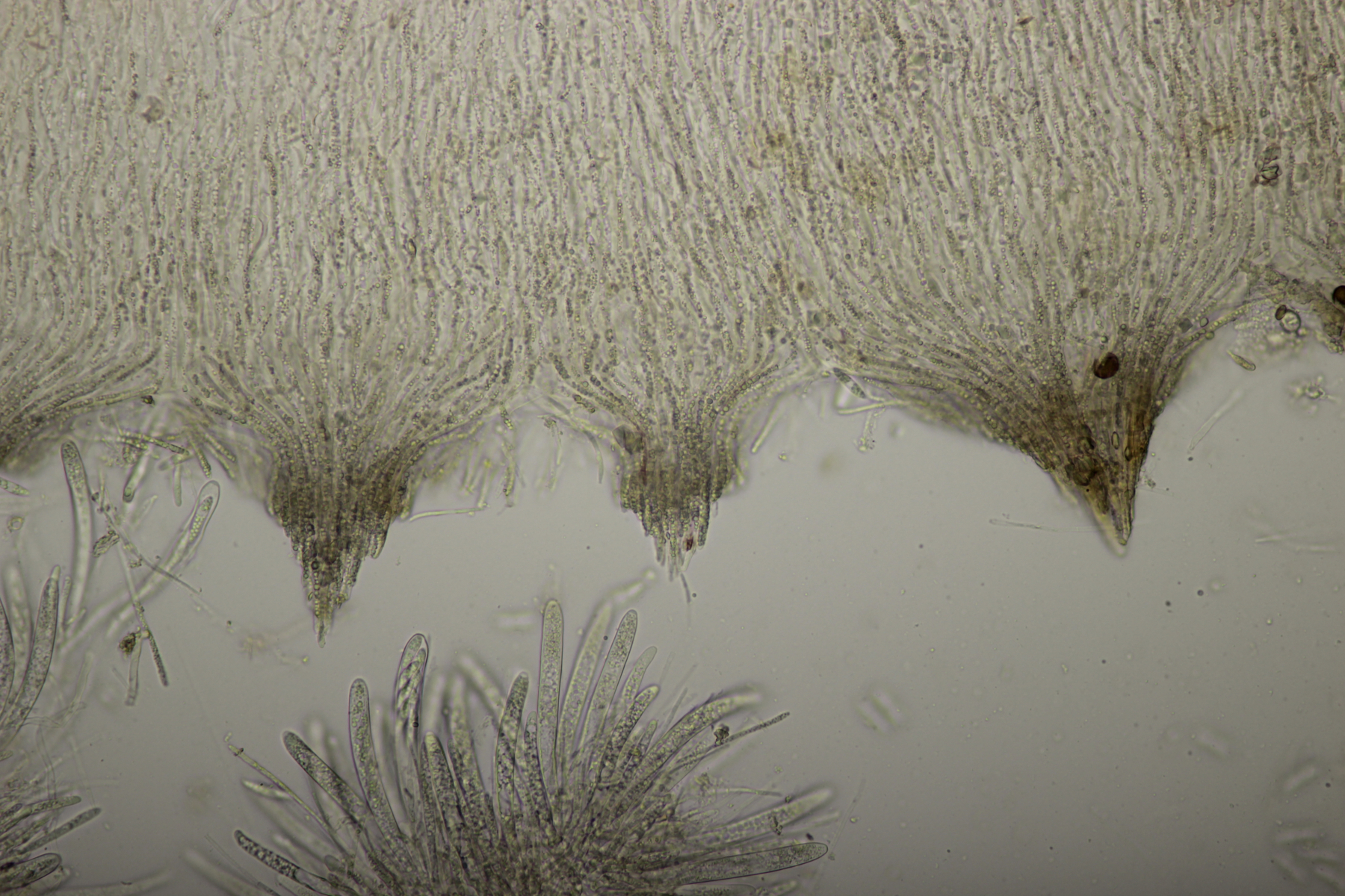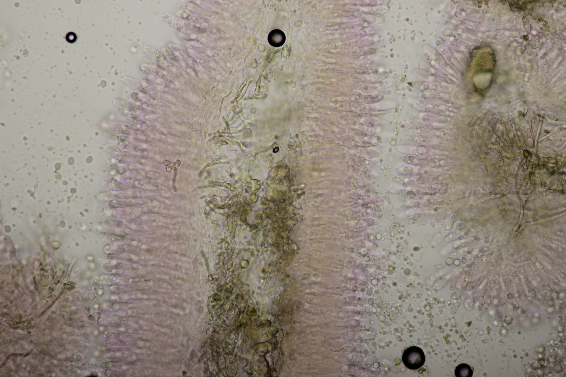 1. Geoglossum elongatum. Zunächst war ich irritiert, daß die Sporen im Abwurf alle ihre Septen verloren hatten. Dann hat Karl mich aber aufgeklärt, daß das ein Charakteristikum von von G. fallax und G. elongatum ist. Mit Sporenlängen im Bereich von 60-70 µm war G. fallax dann rasch ausgeschlossen.