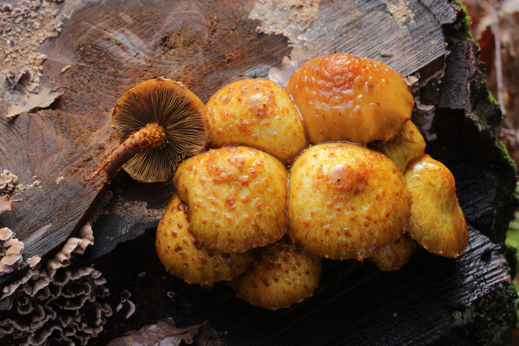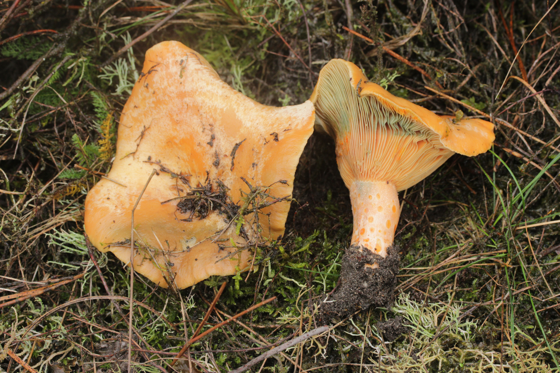 5. Lactarius deliciosus. Die grüne Färbung ist zwar ungewöhnlich, er färbte im Schnitt aber nicht weinrot. Außerdem haben die Exemplare wohl schon Frost abbekommen.