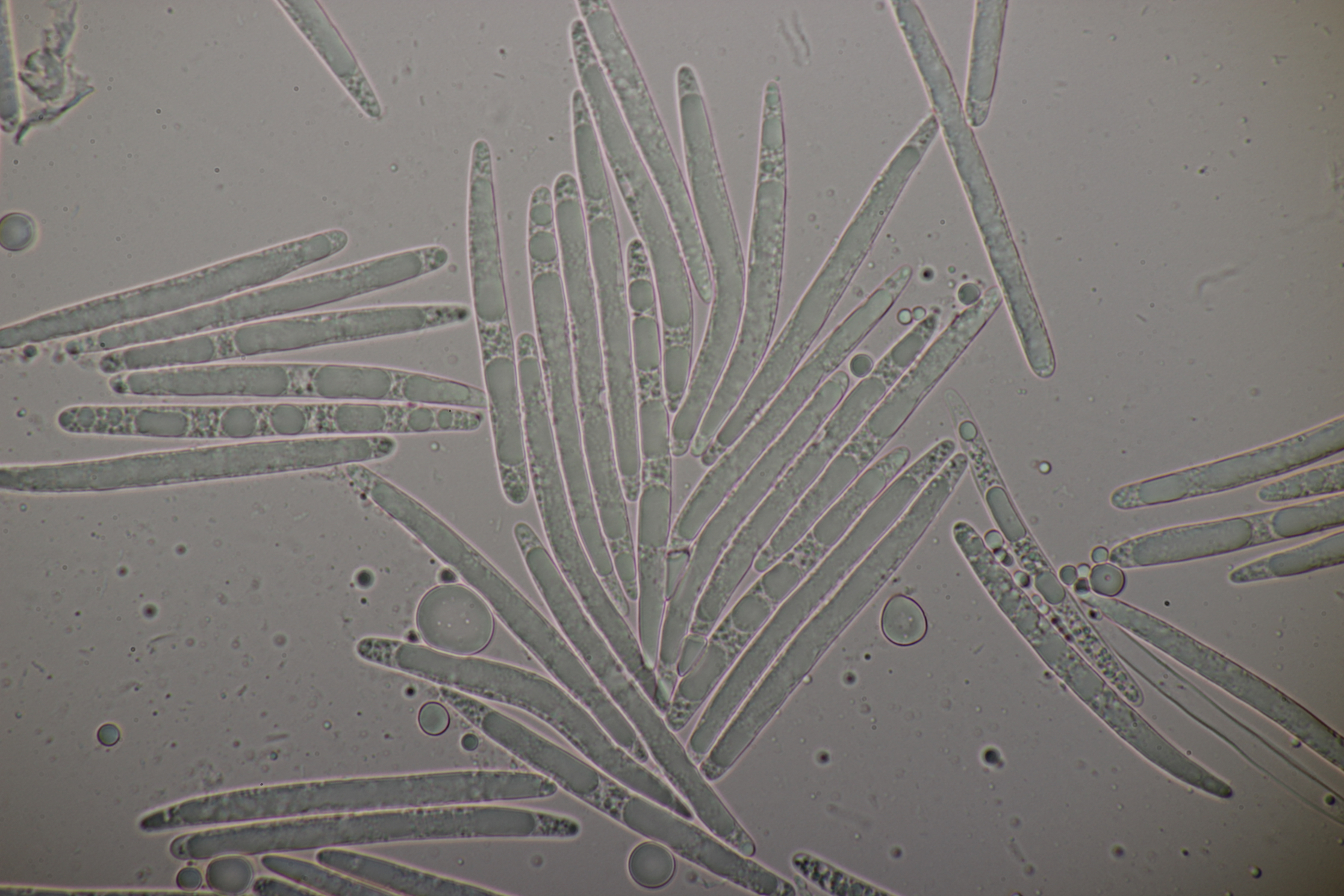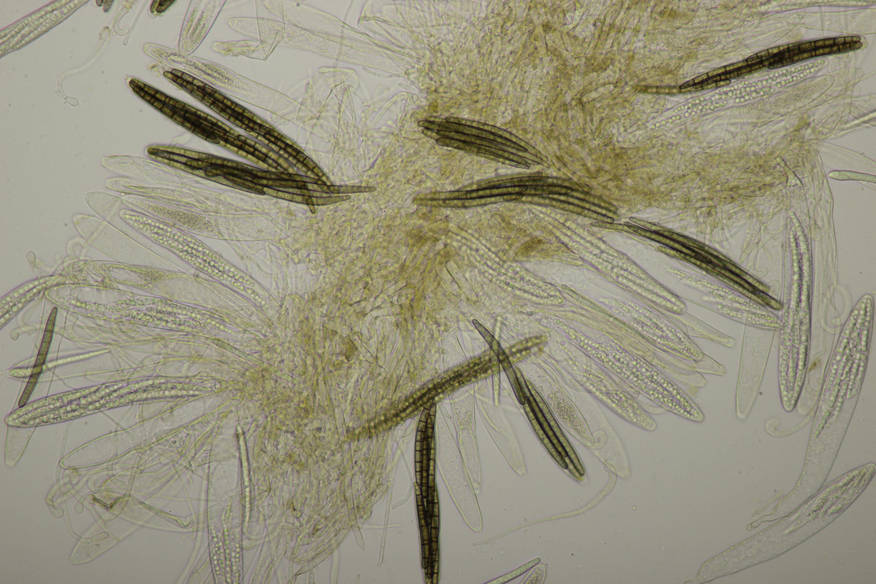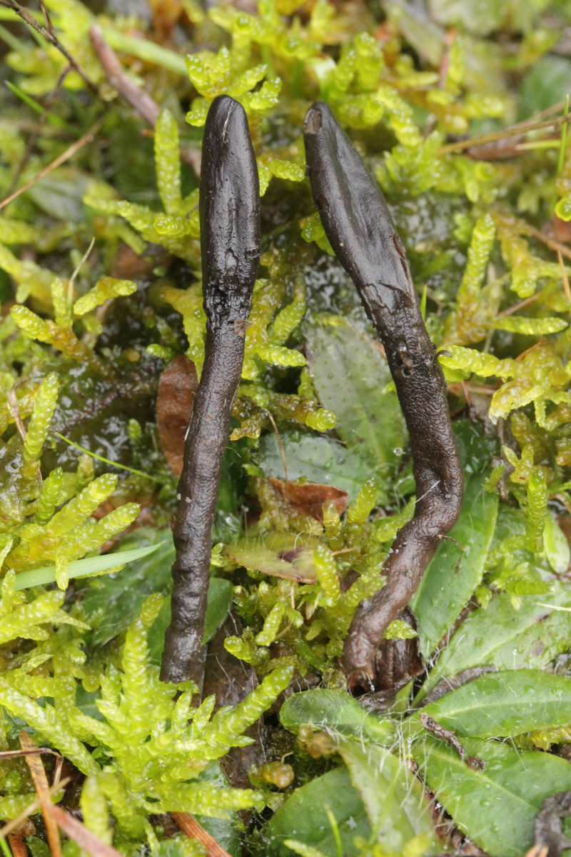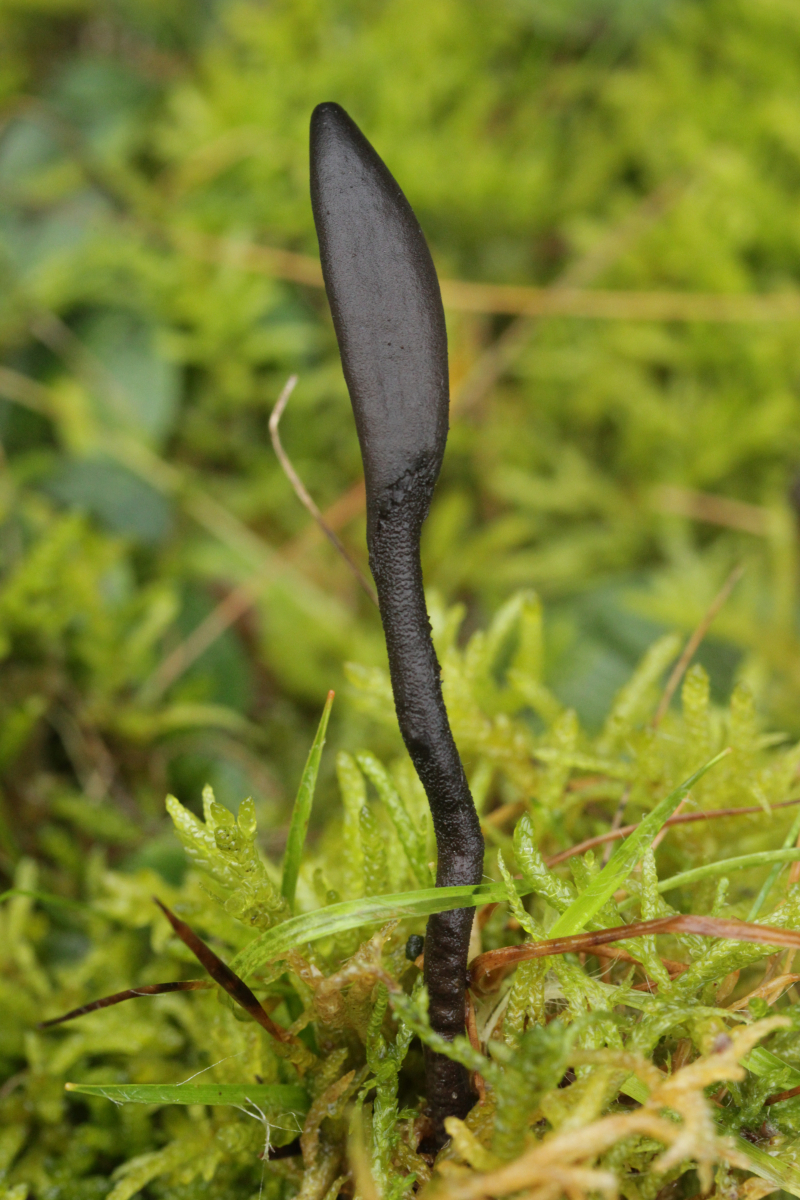 1. Geoglossum elongatum. Zunächst war ich irritiert, daß die Sporen im Abwurf alle ihre Septen verloren hatten. Dann hat Karl mich aber aufgeklärt, daß das ein Charakteristikum von von G. fallax und G. elongatum ist. Mit Sporenlängen im Bereich von 60-70 µm war G. fallax dann rasch ausgeschlossen.