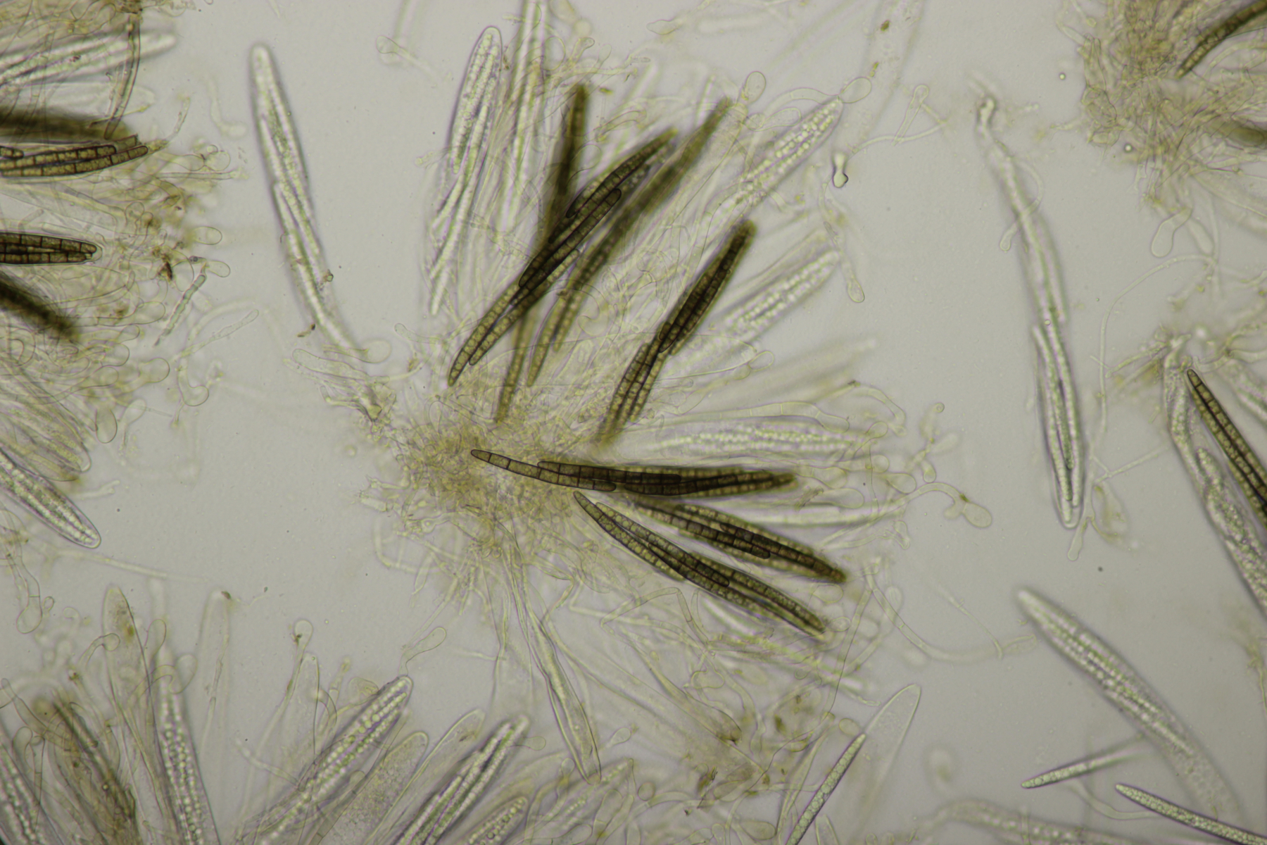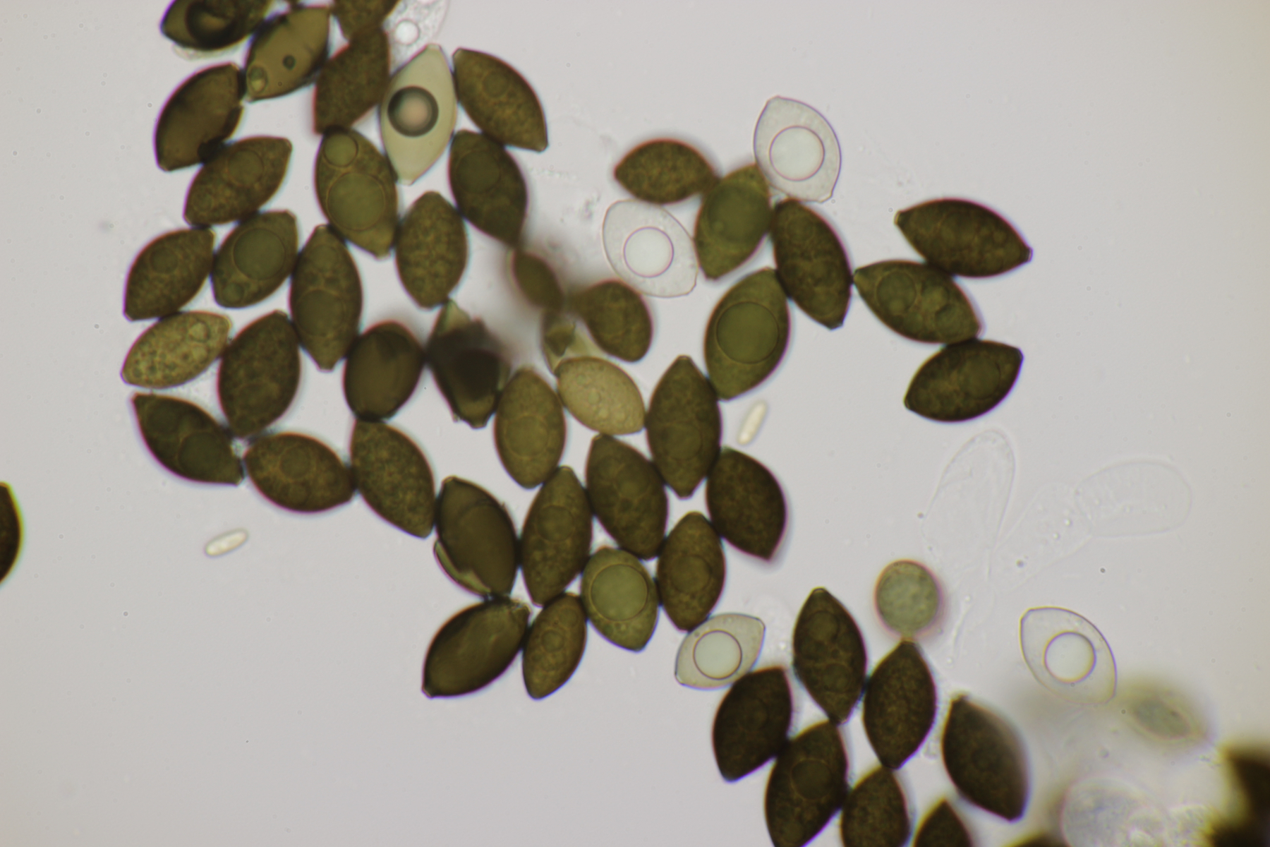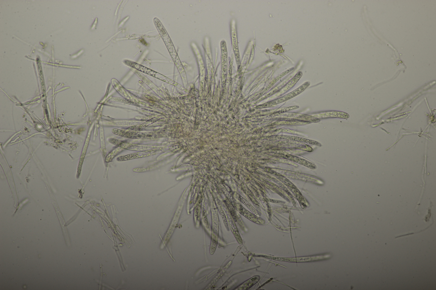 1. Geoglossum elongatum. Zunächst war ich irritiert, daß die Sporen im Abwurf alle ihre Septen verloren hatten. Dann hat Karl mich aber aufgeklärt, daß das ein Charakteristikum von von G. fallax und G. elongatum ist. Mit Sporenlängen im Bereich von 60-70 µm war G. fallax dann rasch ausgeschlossen.