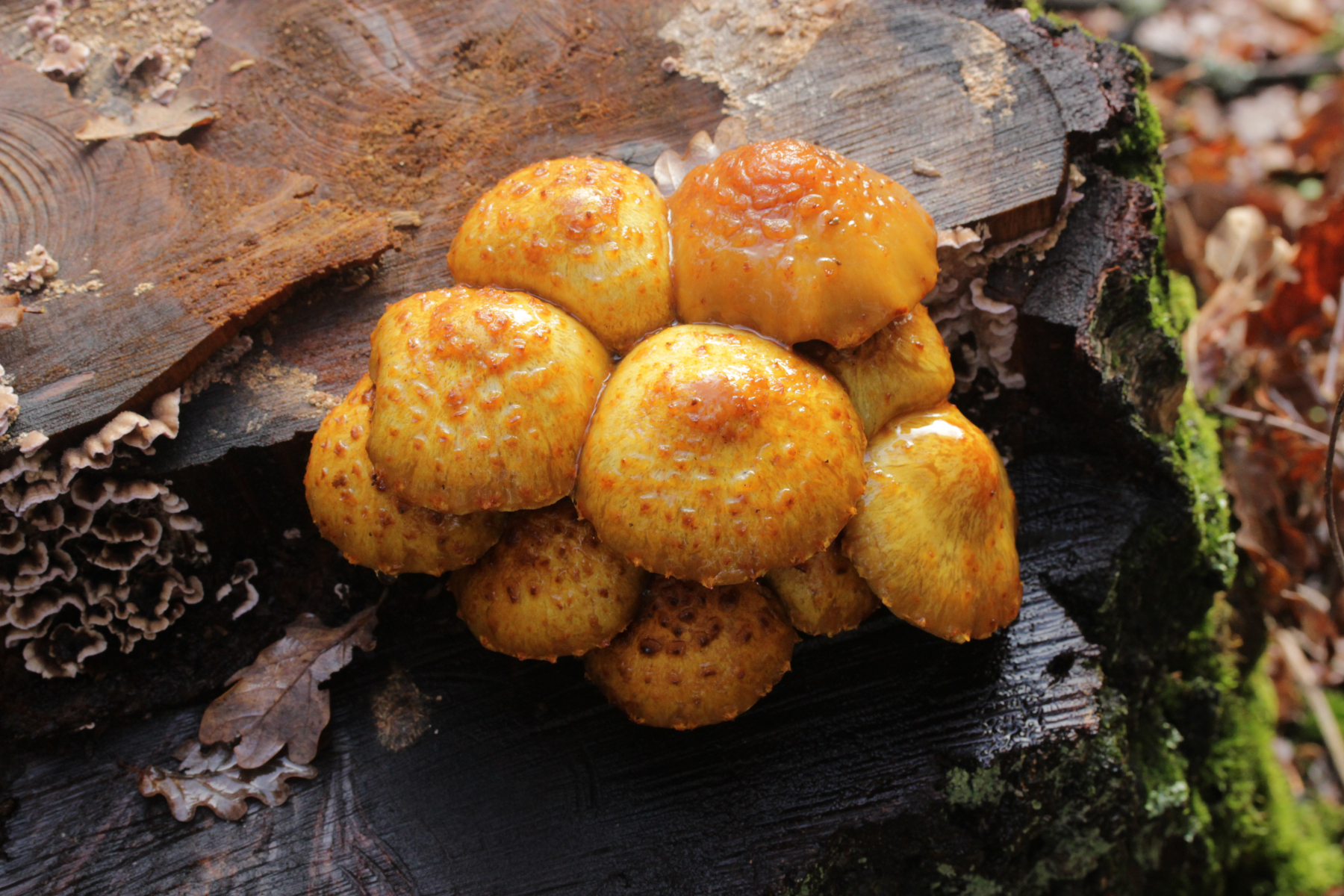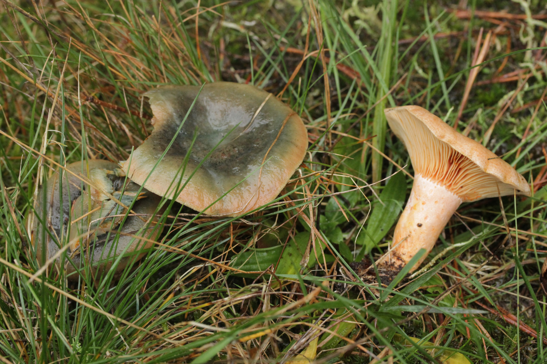 5. Lactarius deliciosus. Die grüne Färbung ist zwar ungewöhnlich, er färbte im Schnitt aber nicht weinrot. Außerdem haben die Exemplare wohl schon Frost abbekommen.