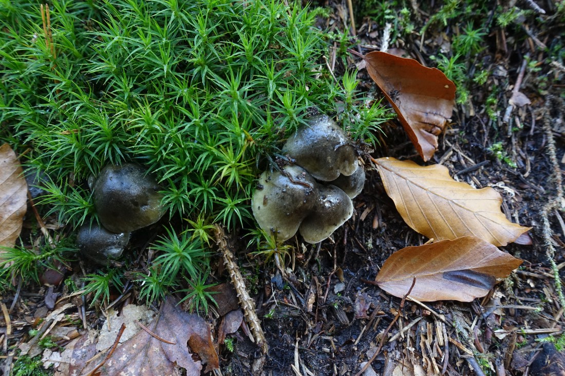 Ebenfalls häufig konnten wir im Buchenlaub diesen Becherling finden, der von anderen Wissenden im Vorbeigehen den Namen Buchenwaldbecherling (Pezizza Arvenensis) erhielt. Hier ein Bild in jung und in sehr alt (dafür dann Handteller-groß):