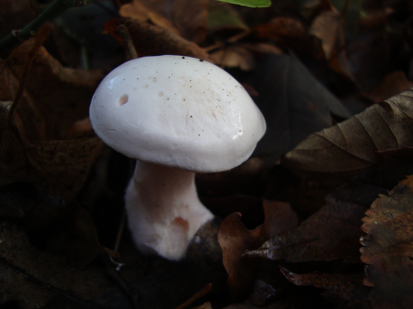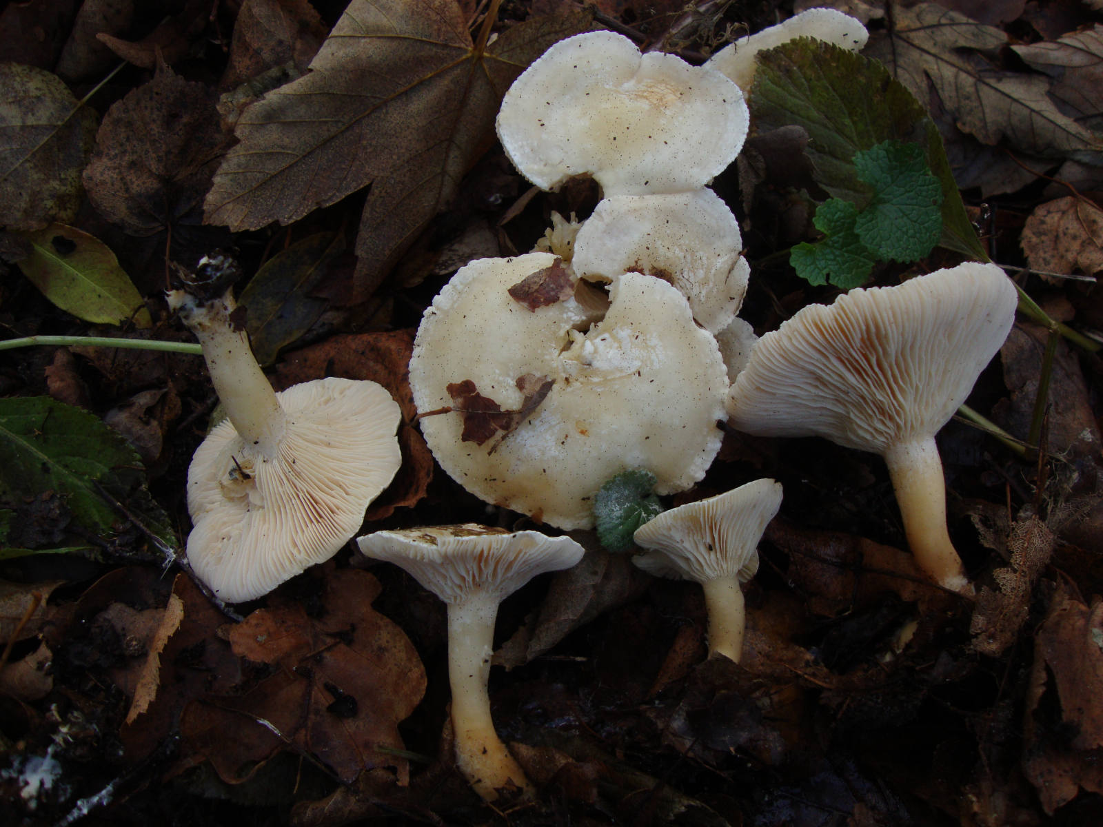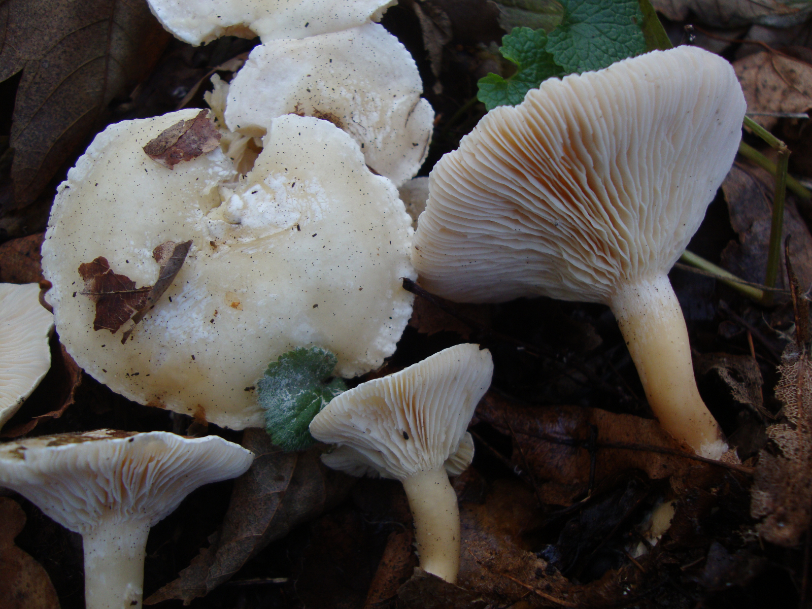 Vielleicht ist es doch irgendein Trichterling? Zur Sicherheit zeige ich hier mal die (unbestimmten) Trichterlinge, die in größerer Zahl in der Nähe standen (und vielleicht erkennt die ja auch jemand im Vorbeigehen; sie waren gar nicht trichterförmig und haben auch weiß gesport):