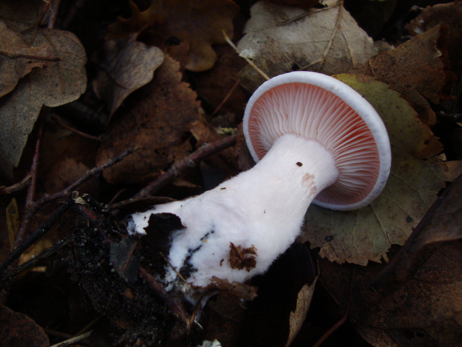 Im Moment tendiere ich - auch aufgrund der auffällig knorpeligen Konsistenz - am ehesten zu einem Weißen Rasling (Leucocybe connata). Allerdings wuchs er definitiv nicht büschelig und hat auch definitiv keine verschiebbaren Lamellen, und ob der so auffällig rosa Lamellen haben darf, ist mir auch unklar.