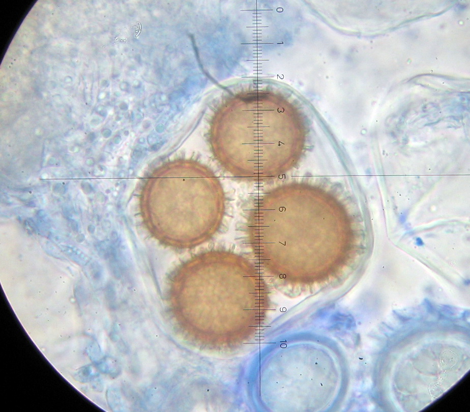 Sporen; rundlich-oval,11-13µ, hyalin-bräunlich, mit sternförmig angeordneten, pyramidenförmigen ( wie gefaltet)