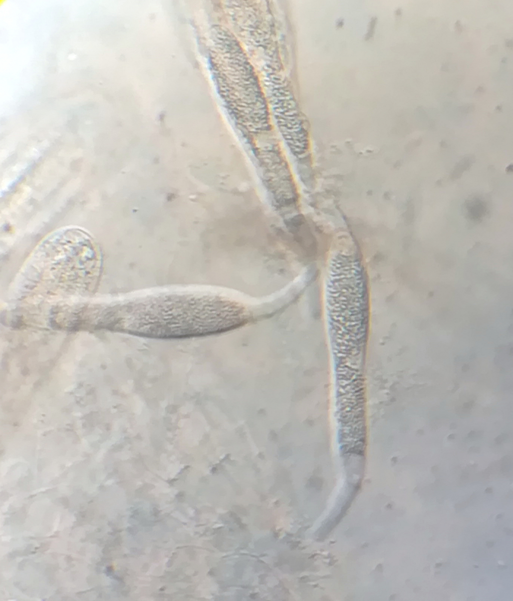 auf dem Heidschnuckendung aus der Krelinger Heide habe ich einen Pilz gefunden, den ich in die Gattung Zopfiella stecken würde. Leider habe ich nicht wirklich viele Merkmale notieren können, der Zustand war wohl nicht mehr der Allerbeste. Auffällig waren auf jeden Fall die langen Haare am Cleistothecium, die sich über mehrer 100 µm, wenn nicht sogar Millimeter erstrecken, bräunlich und stark septiert, sowie um die 4 µm breit sind. Die Sporen selbst bestehen aus einem im Alter dunkelbraun gefärbten Teil, sowie einem hyalinen Teil, der im Alter kollabiert. Bei jüngeren Sporen ist dieser Teil grün-oliv eingefärbt. Auf der gegenüberliegenden Seite findet sich ein Keimporus. Spannend ist, dass der dunkelbraune Sporenteil einmal septiert ist, wodurch (nicht mittig). Die Sporen habe ich mit 24 - 25 x 12 - 13,5 µm gemessen (dunkler Teil), der hyaline Part ist 20 - 24 µm lang. Hat jemand eine Idee zu diesem Fund? Oder liege ich bei der Gattung daneben? Anbei ein paar Bilder: