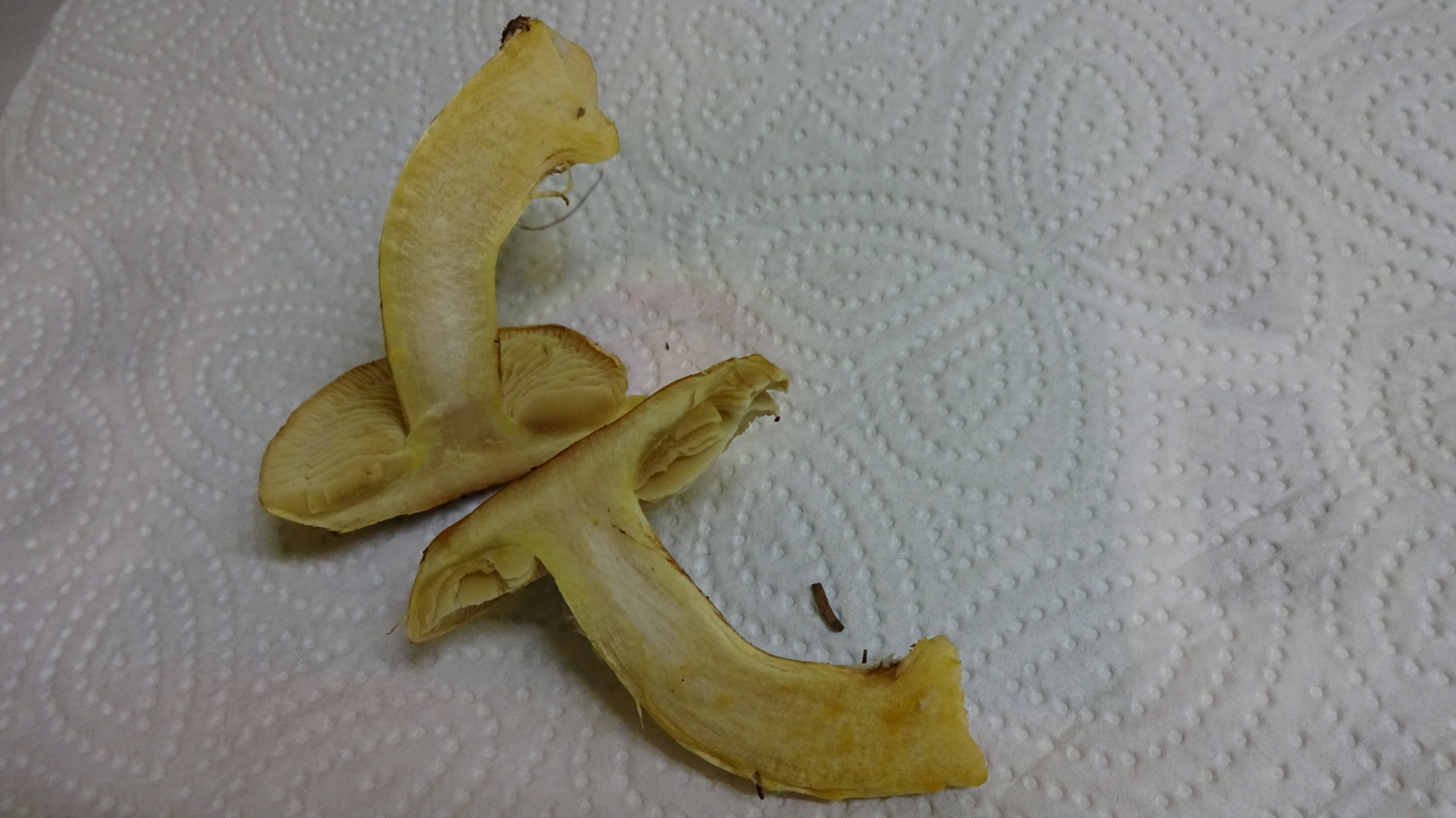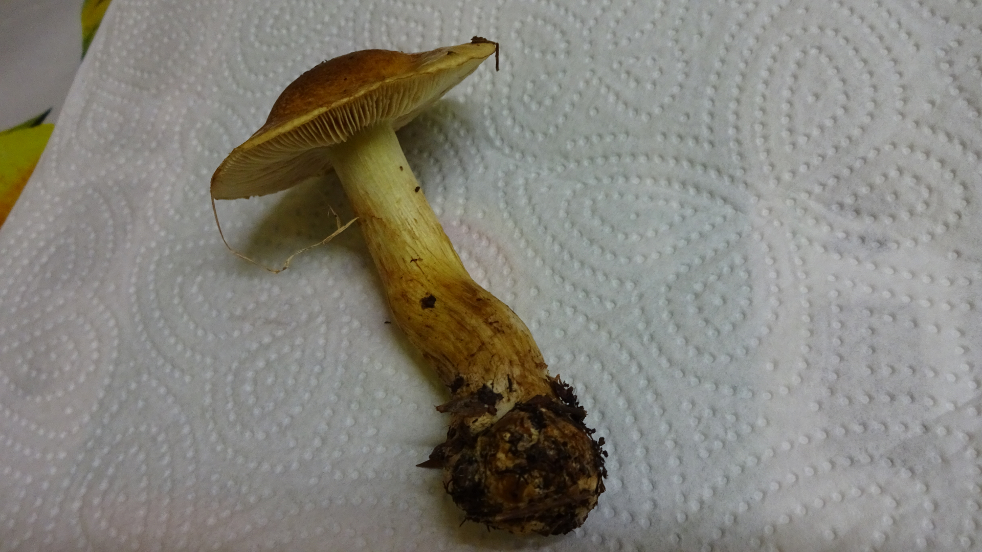 Auf dem Hut kleben noch Nadeln, das gelbliche Fleisch und der minimal gerandet knollige Stiel deuten daraufhin