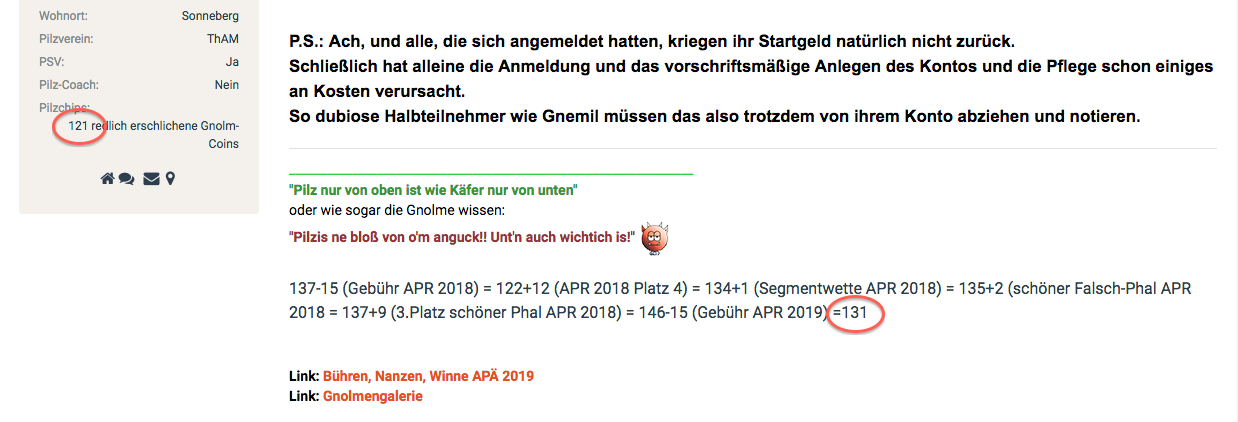 Pilz-Chips: 90+8 für Nobis Pilz-Cover-Rätsel=98, +2 Interne Tribünen-Punkte-Wette APR 2022=100, +4 PhalschPhal-Gedicht APR = 104 +5 Rätselgedicht = 109, 3 als Rätselprämie an Lupus = 106, Gnolm-Kreativpreis APR 2024 +3 = 109