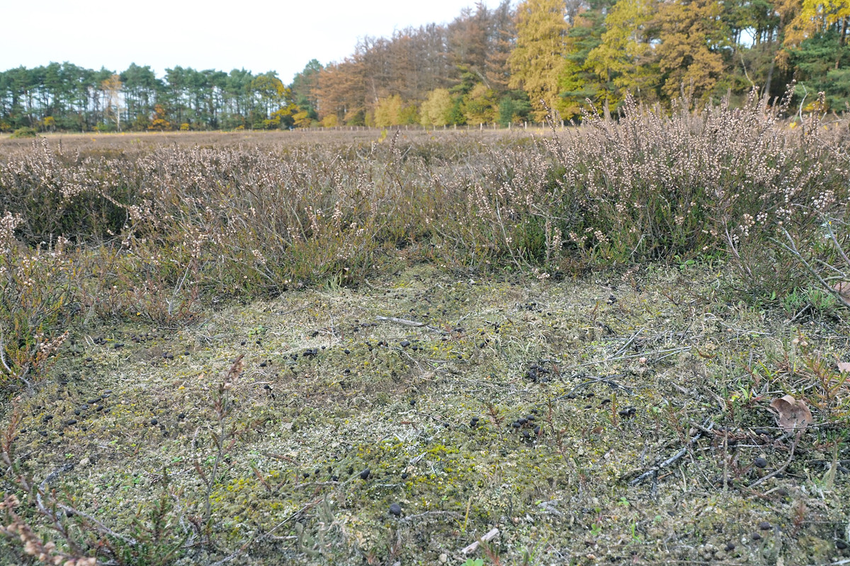 Hier der Fundort, ein noch sehr junger und lückiger Heidekraut-Bestand (man beachte die kleinen schwarzen Köpfchen auf der freien Fläche im Vordergrund