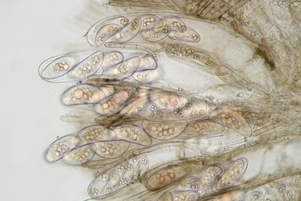 Auffällig das zitronengelbe Exsudat an der Außenseite und die mit lichtbrechendem Inhalt gefüllten Paraphysen. (Foto: Maren).