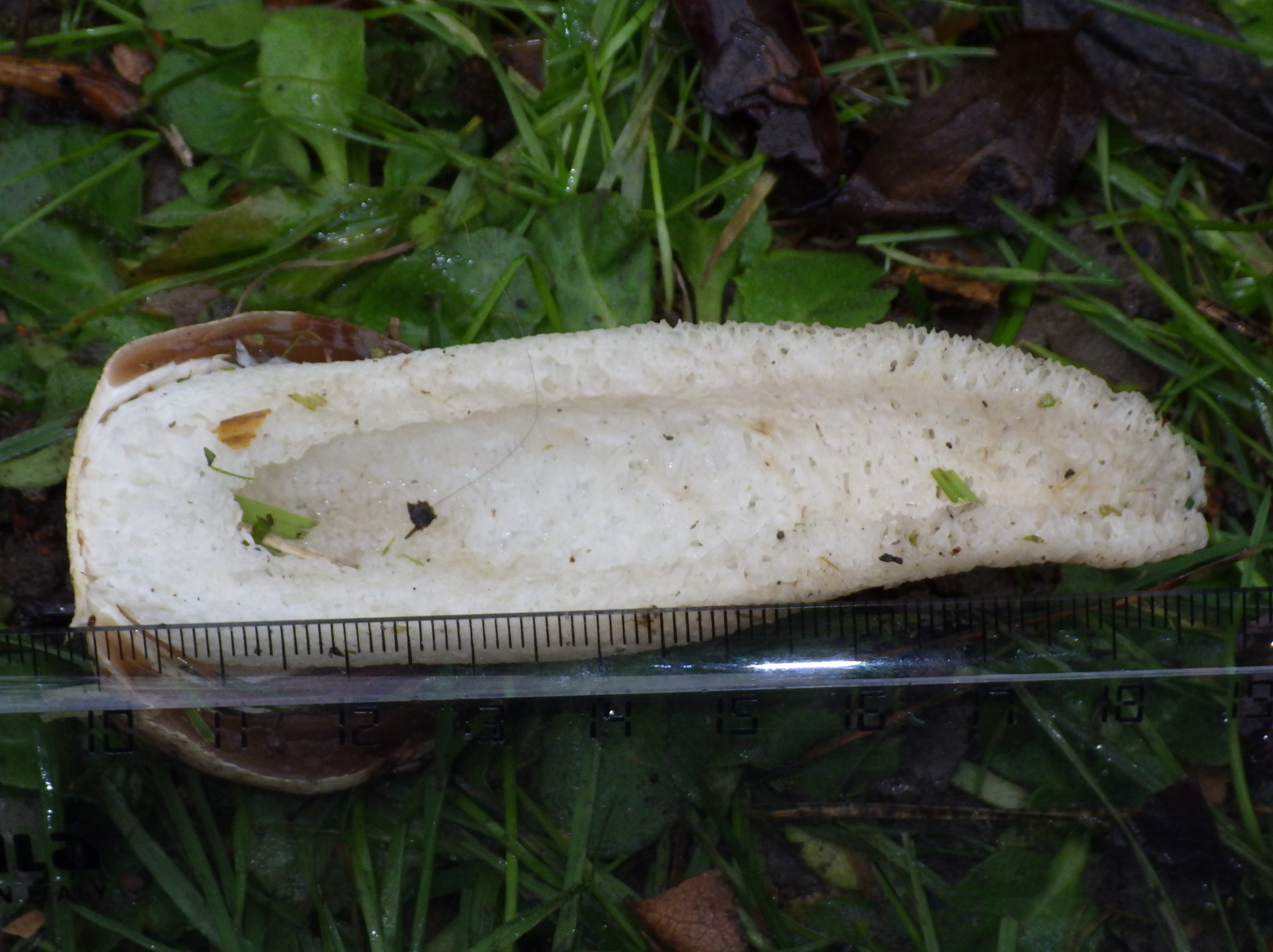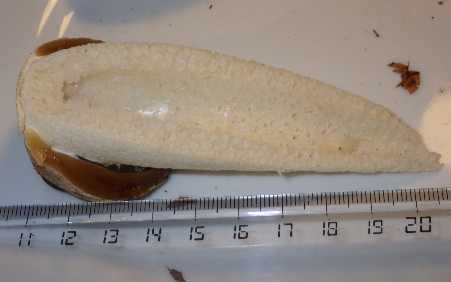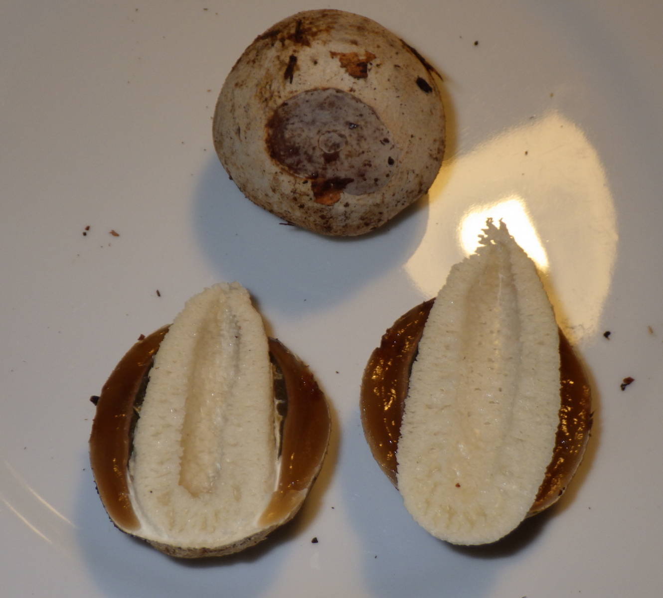 1. Schneidet man ein junges Hexenei auf, welches noch fest ist, verändert sich die Form und Grösse des unter der Peridie (= weisse derbe Hülle) befindlichen bereits angelegten Receptaculum (= stark gekammerter schaumstoffartig zusammengepresster Pilzstiel) überhaupt nicht. Auch wenn man dieses Ei in Scheiben schneidet geschieht auch nach 10 Minuten und später nicht viel.