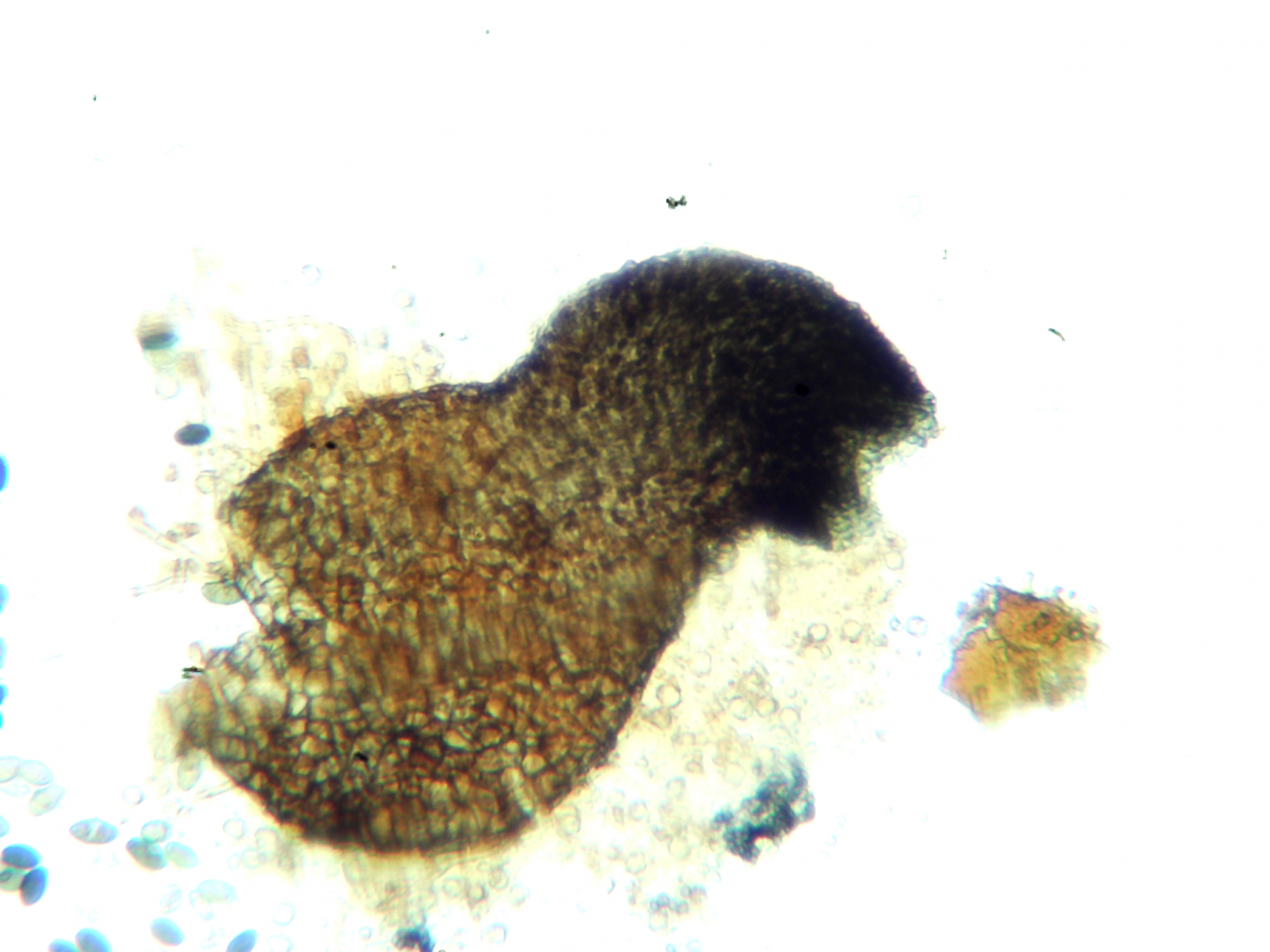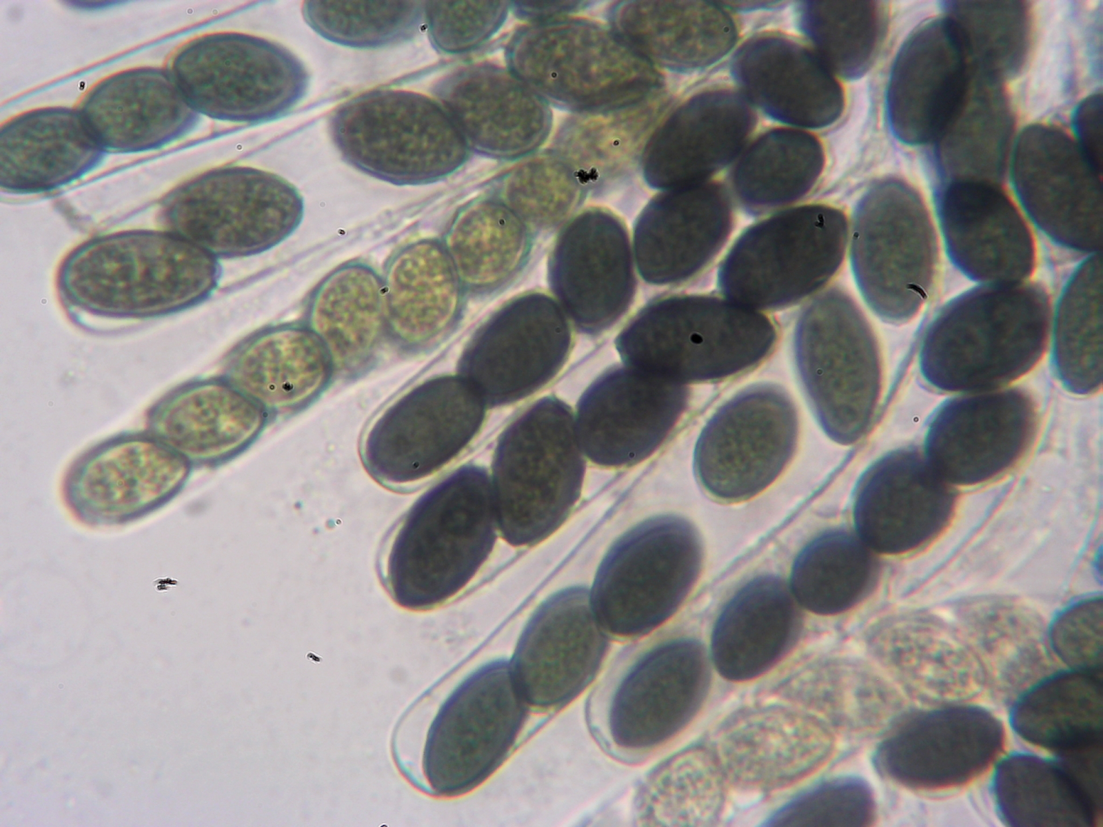 Perithecien ohne Borsten, Asci 8-sporig, Sporen 19-21 x 9-10 µm mit kleinem apicalen Keimporus und dicker Schleimhülle. Erst dachte ich in meinem jugendlichen Überschwang, es sei eine Sordaria alcina - weil die Sporen 2 x so lang wie breit waren. Aber das Bild bei Lundqvist sah dann doch ganz anders aus. Am Ende bin ich dann bei S. fimicola herausgekommen.