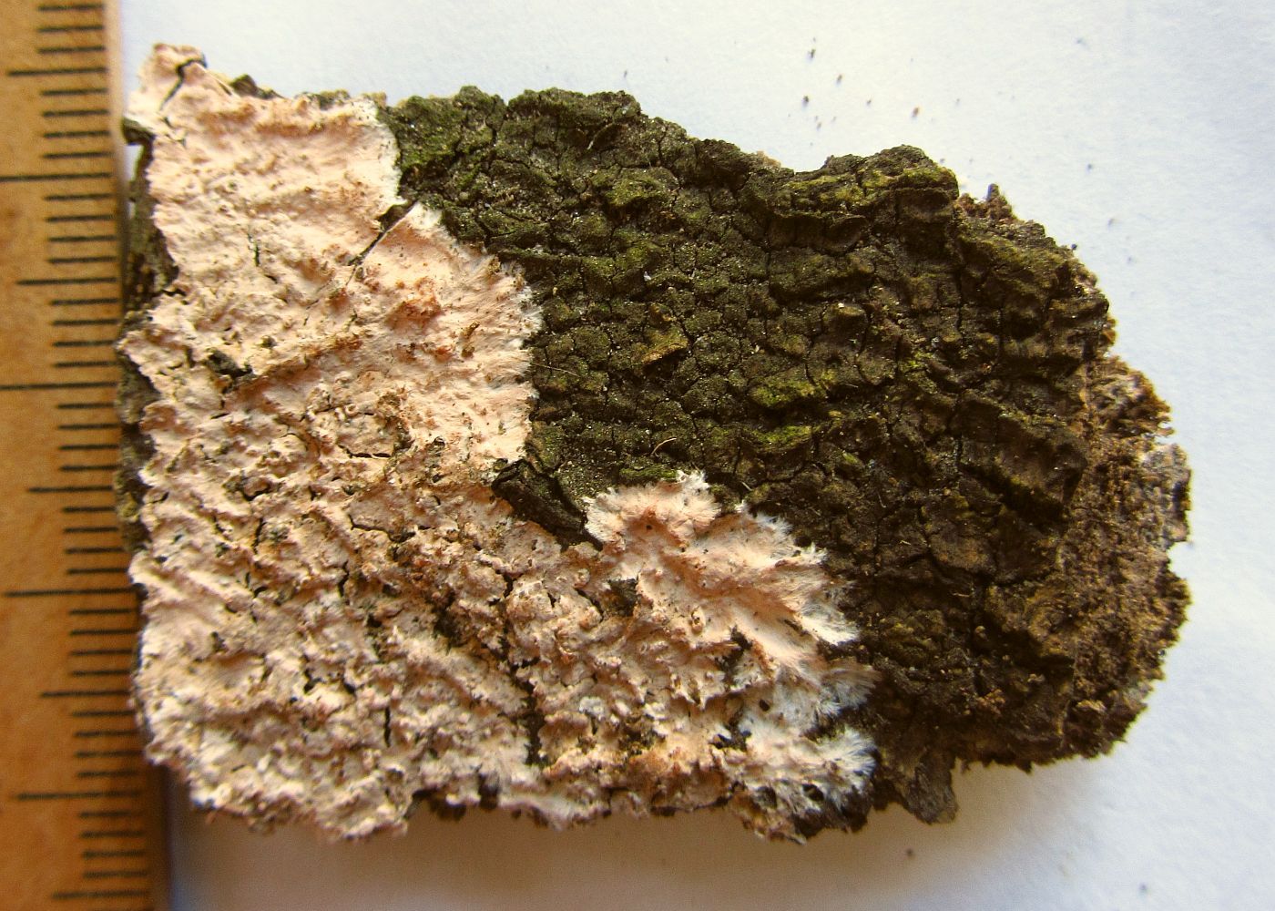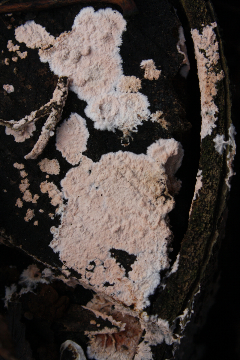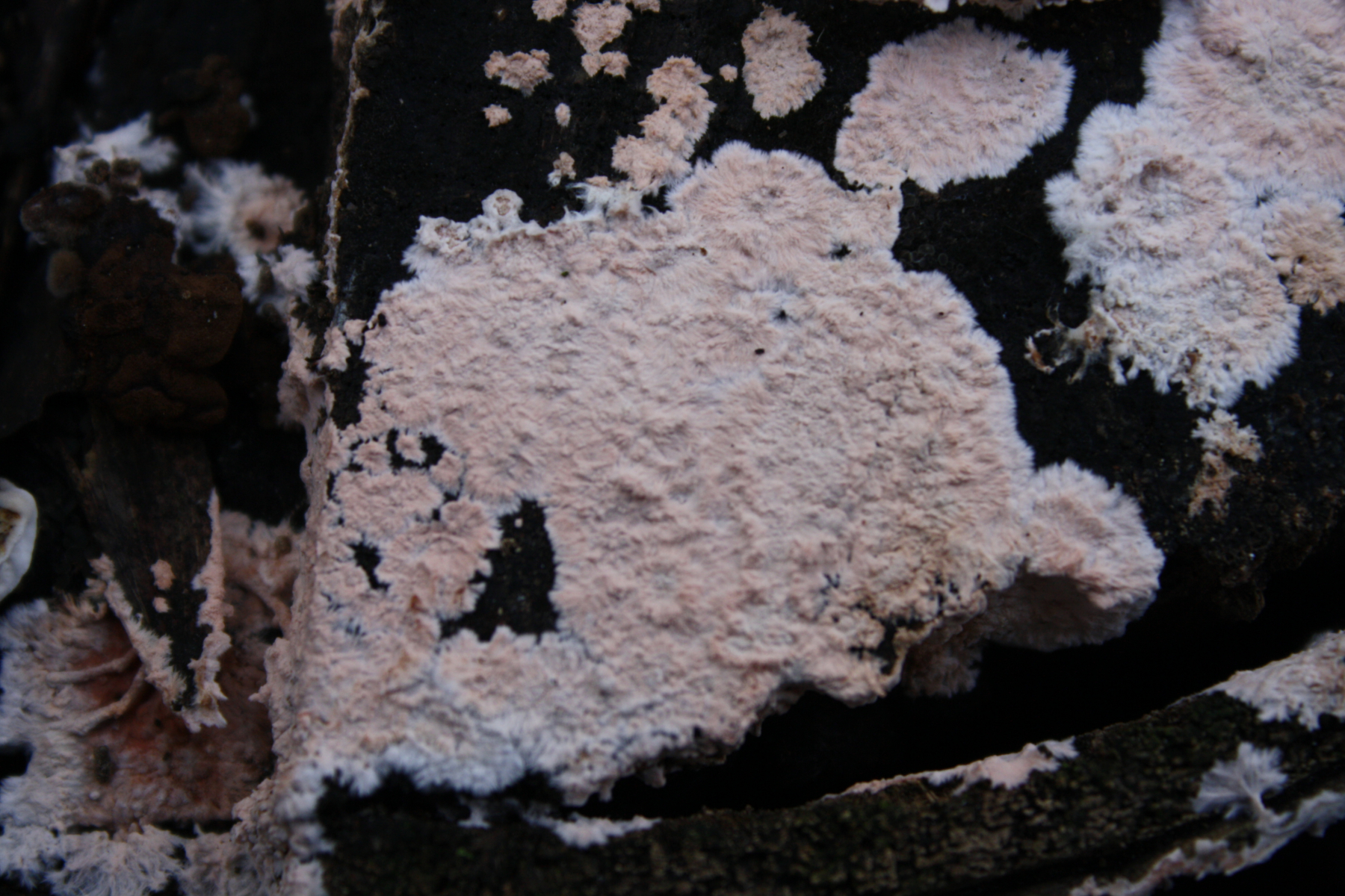 1. Der erste Rindenpilz hat rosa Farbe und wächst an mir unbekanntem Laubholz. Er erinnert mich entfernt an Peniophora incarnata, aber das ist natürlich nur eine Vermutung.