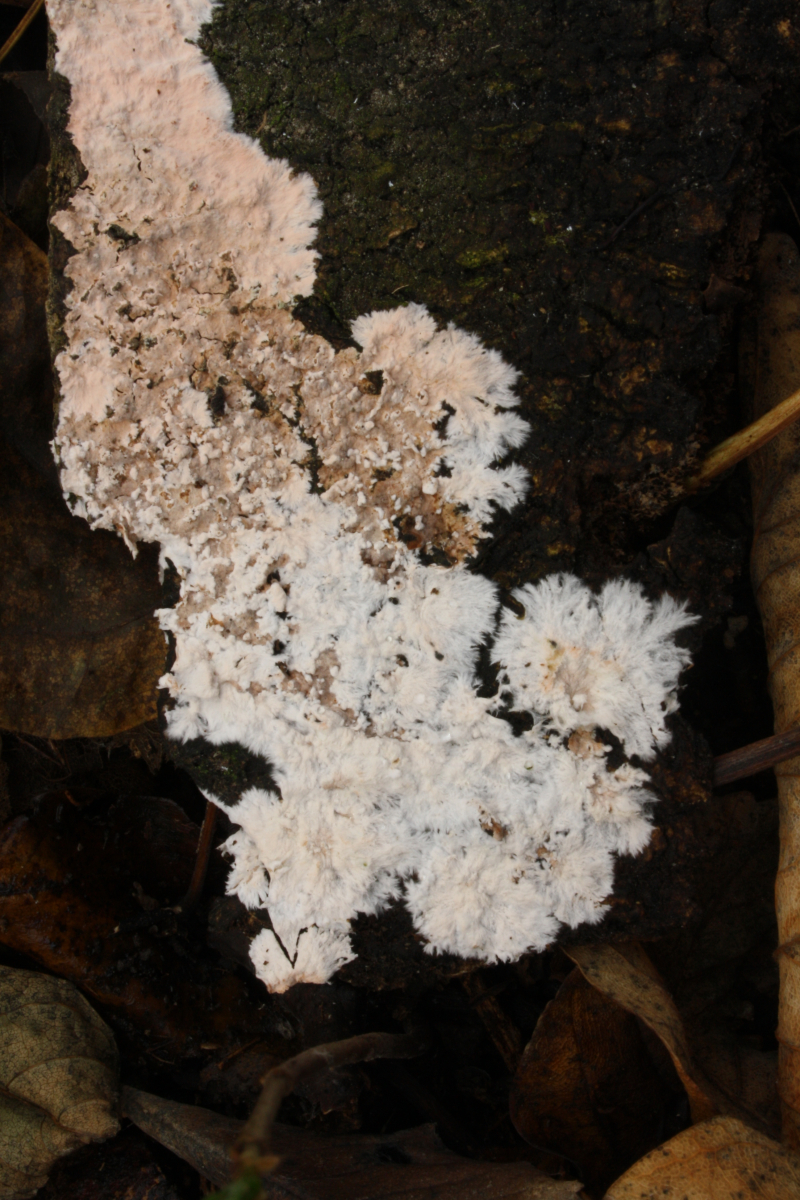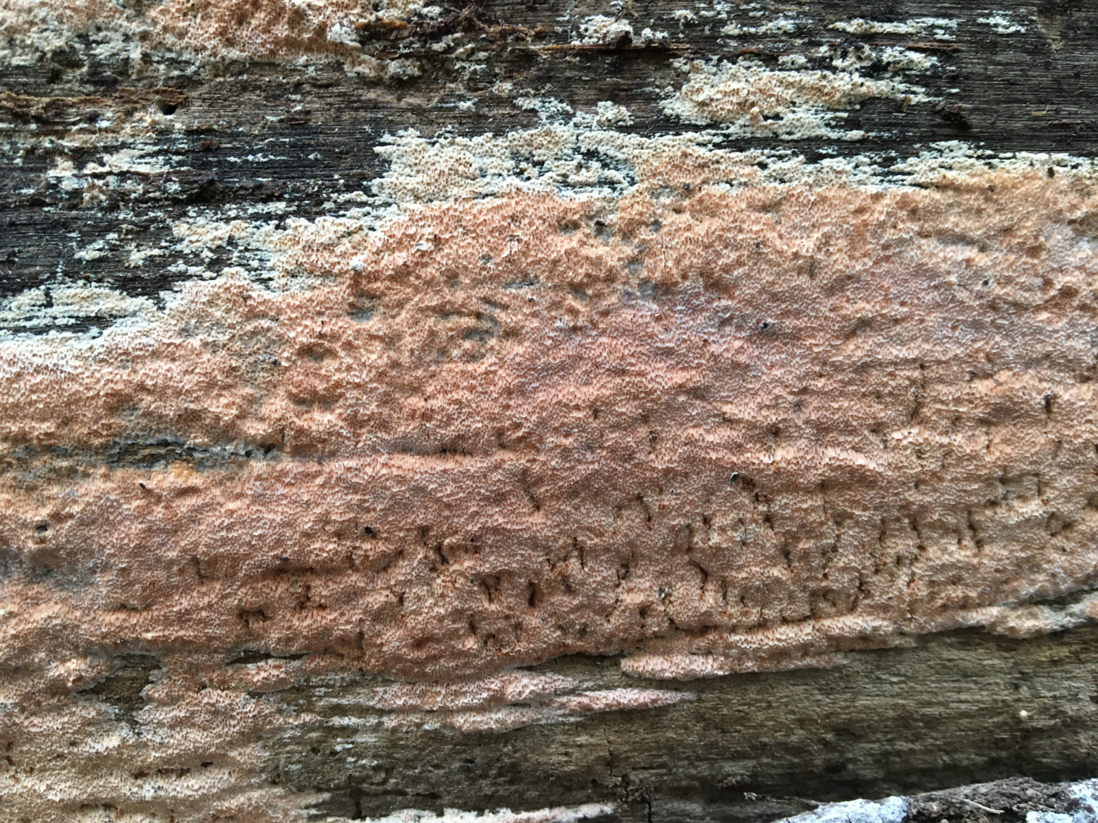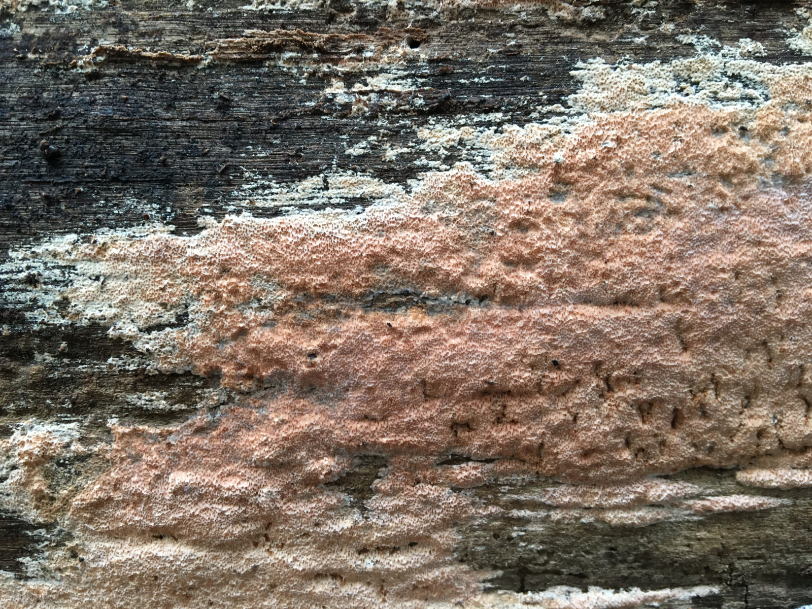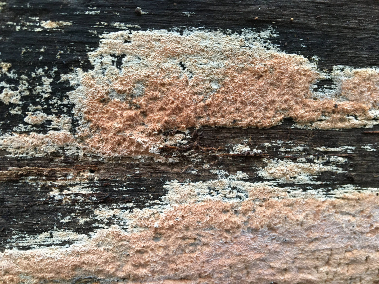 1. Der erste Rindenpilz hat rosa Farbe und wächst an mir unbekanntem Laubholz. Er erinnert mich entfernt an Peniophora incarnata, aber das ist natürlich nur eine Vermutung.