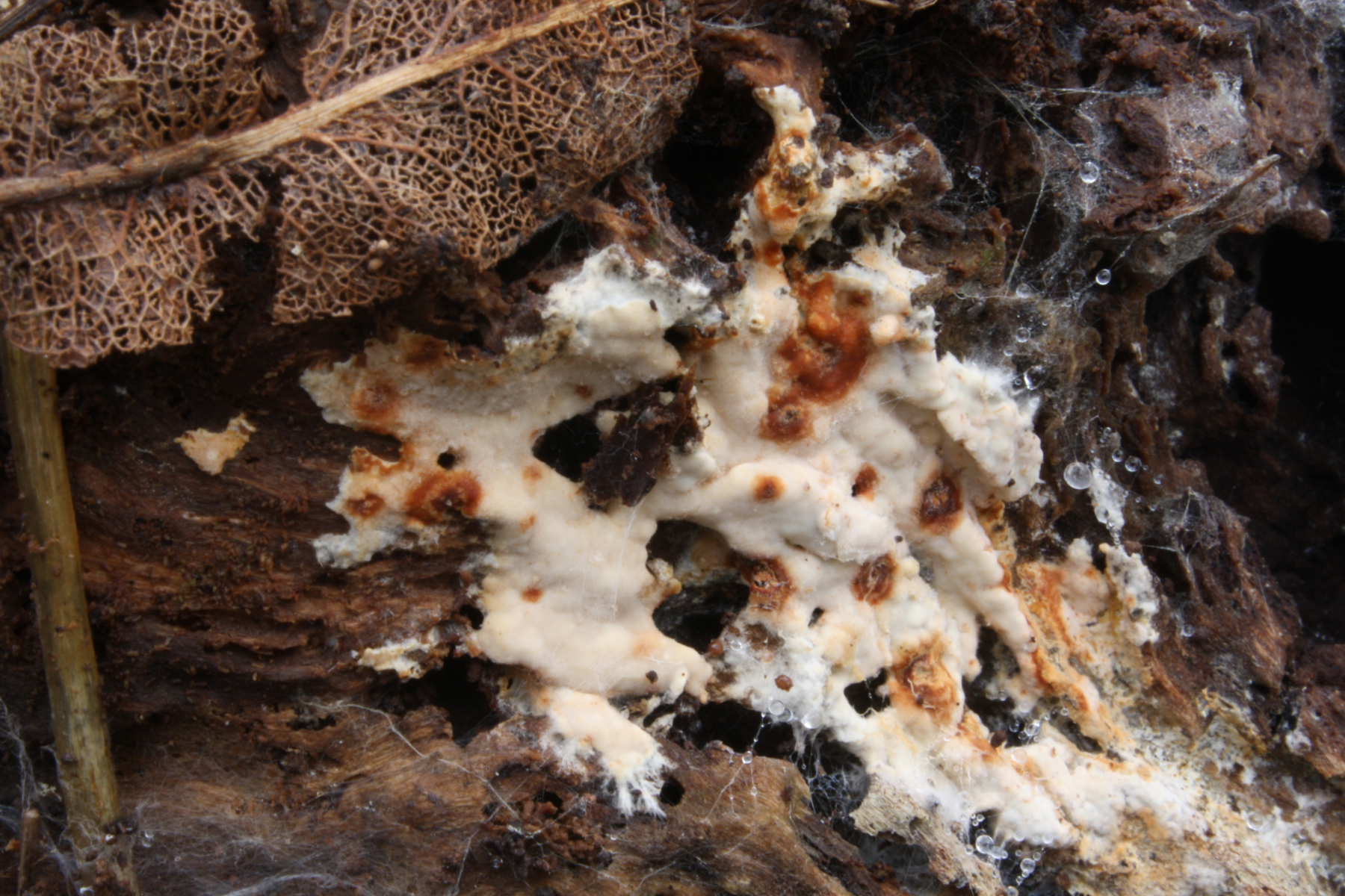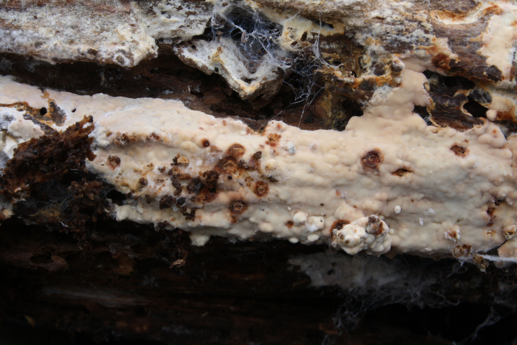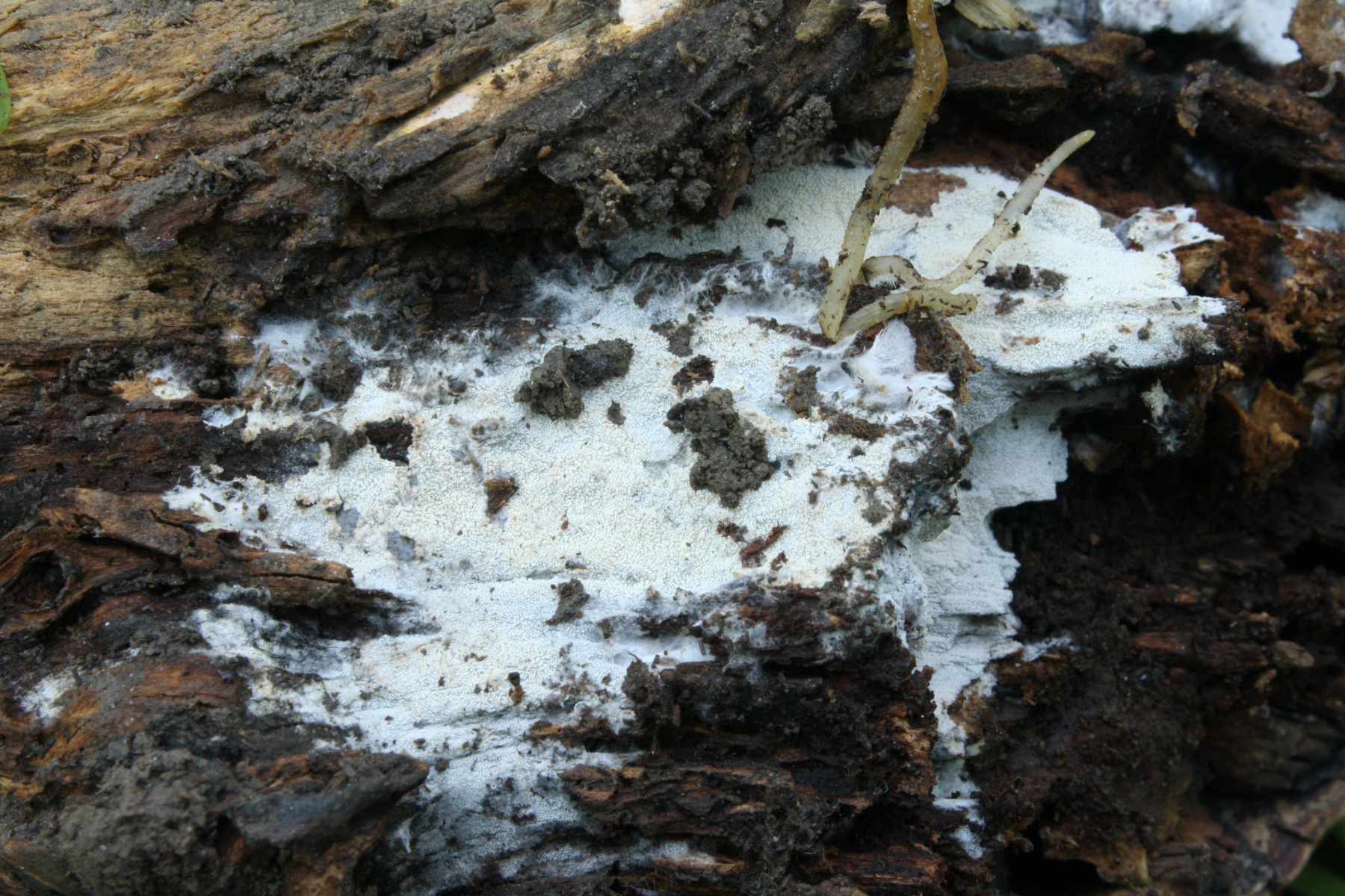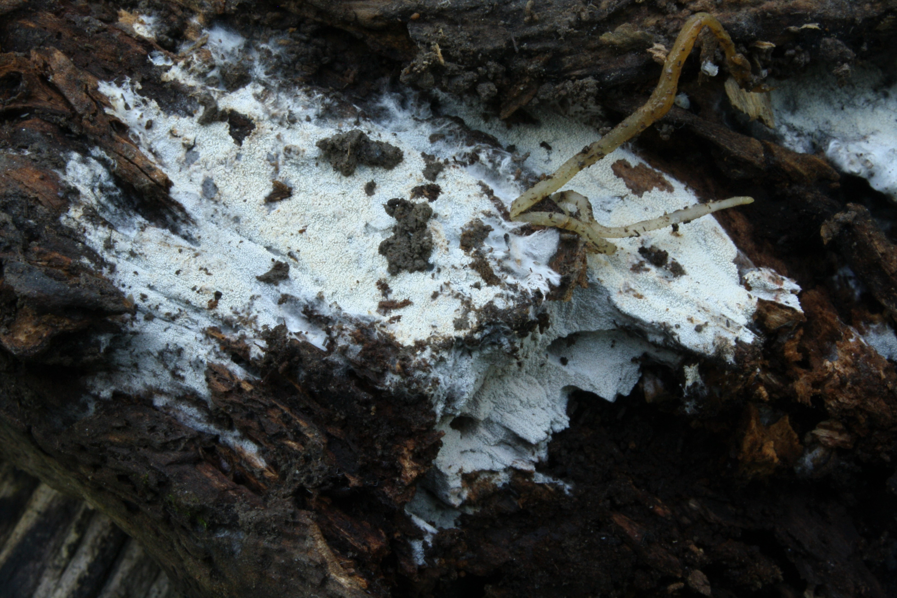 2. Den zweiten Rindenpilz fand ich auf der Unterseite eines sehr morschen Holzstückes, er sieht spinnwebartig aus und sagt mir gar nichs.