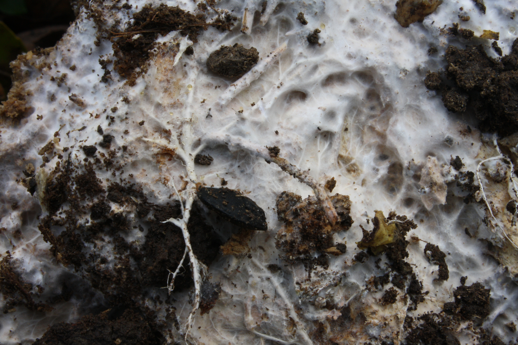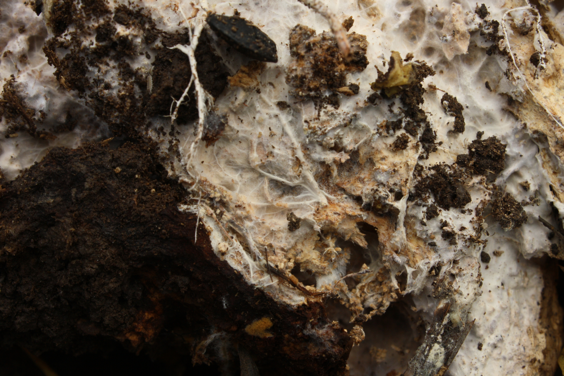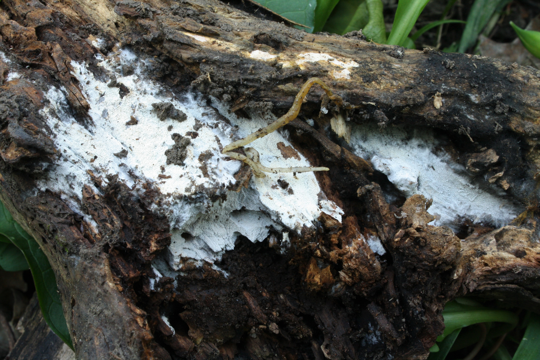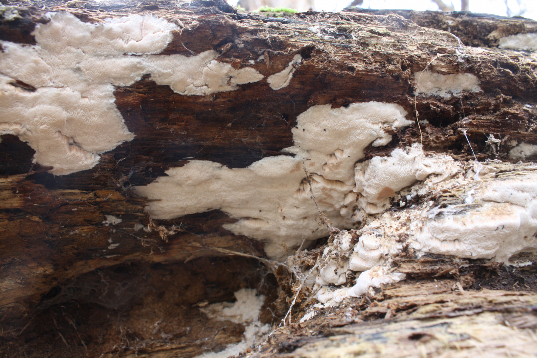 2. Den zweiten Rindenpilz fand ich auf der Unterseite eines sehr morschen Holzstückes, er sieht spinnwebartig aus und sagt mir gar nichs.