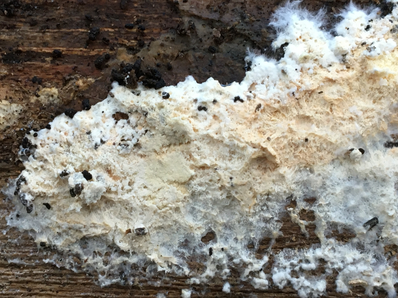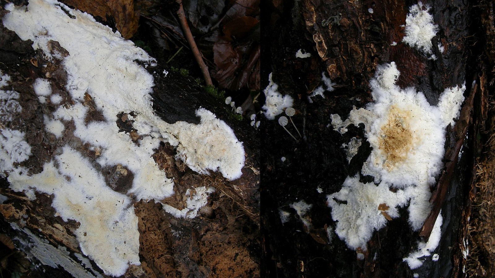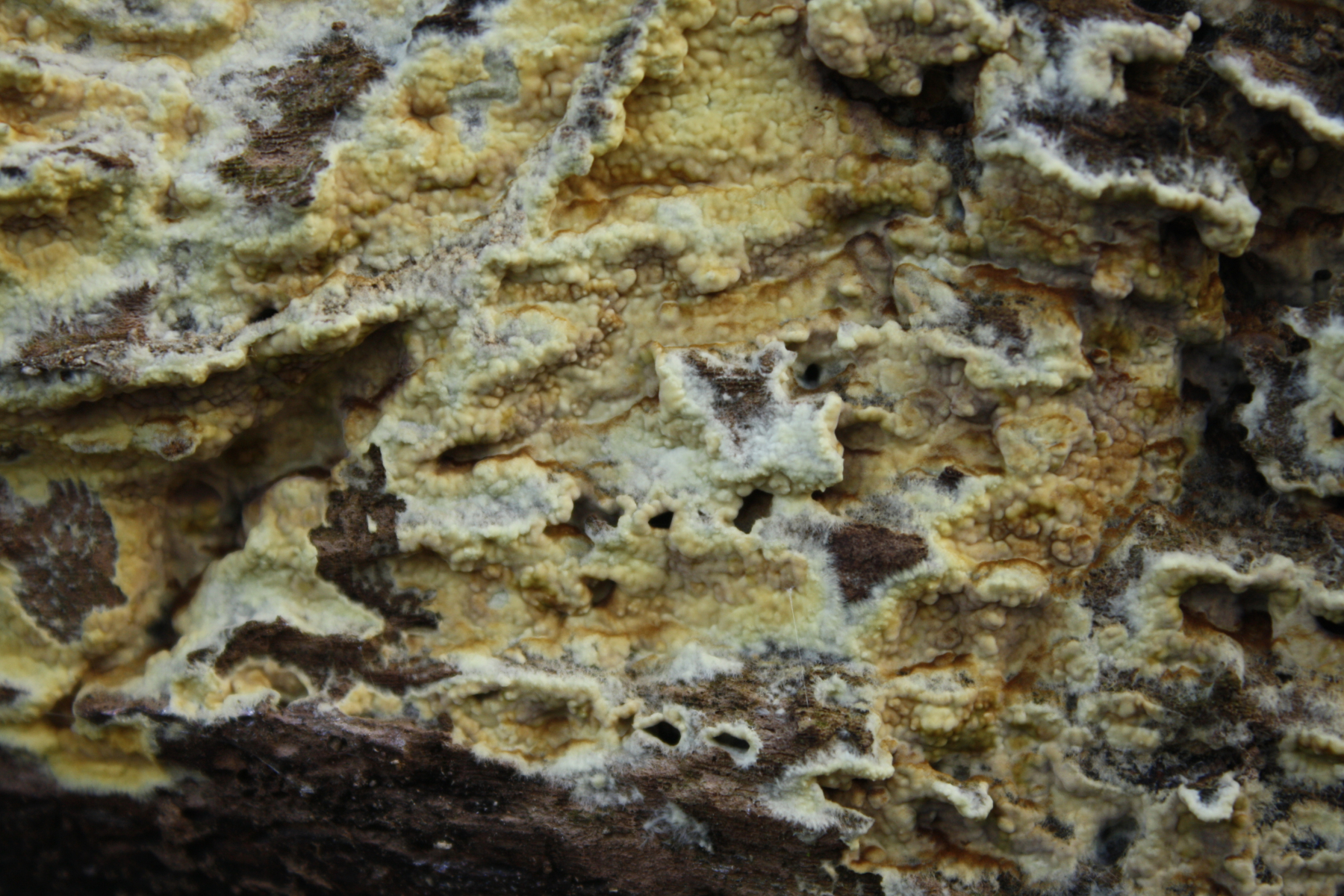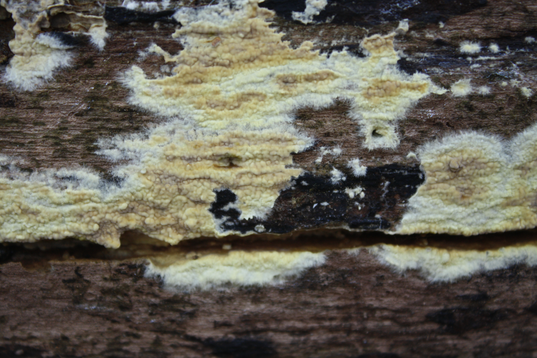 5. Dann fand ich noch einen gelblichen Rindenpilz, der mich an Coniophora puteana erinnert, weil er sich älter nach graubraun verfärbt.