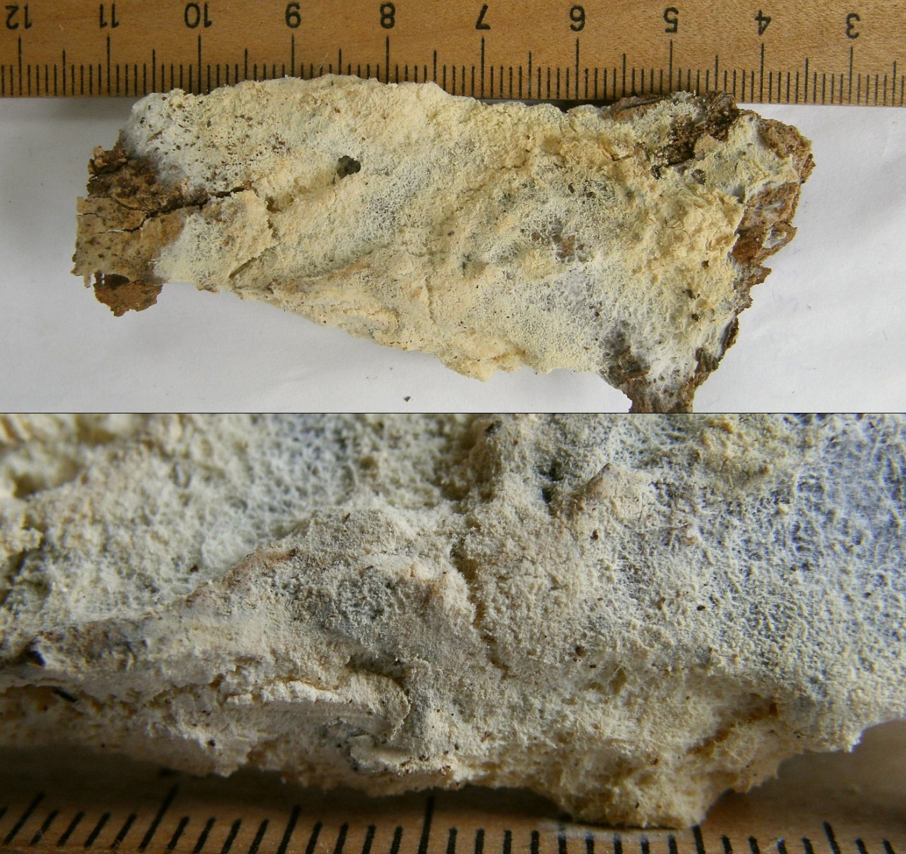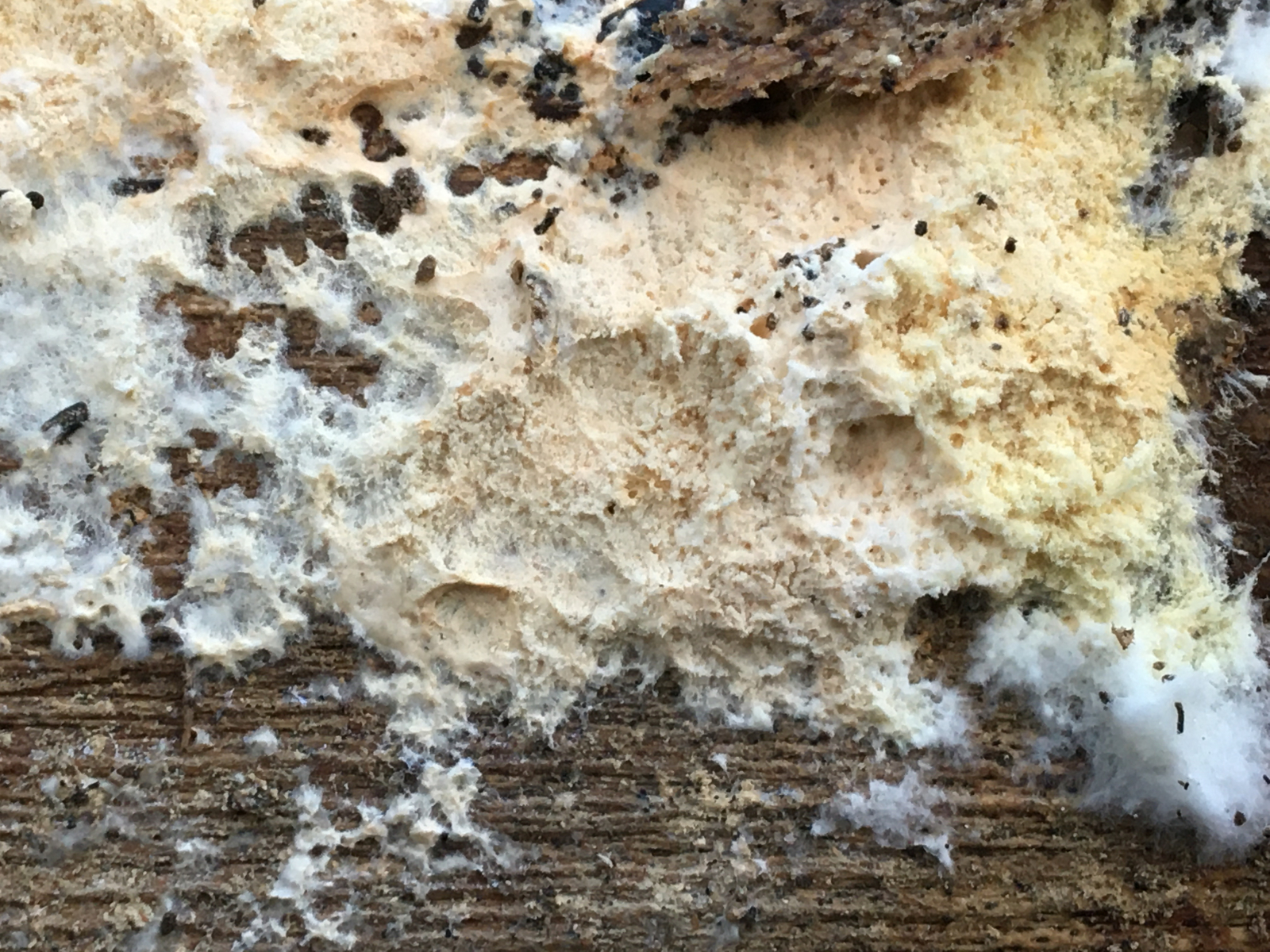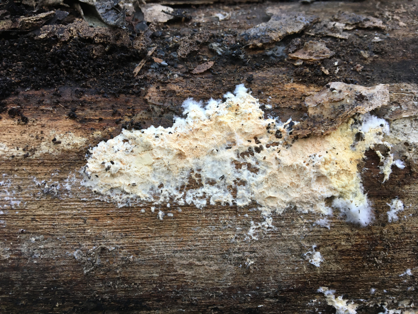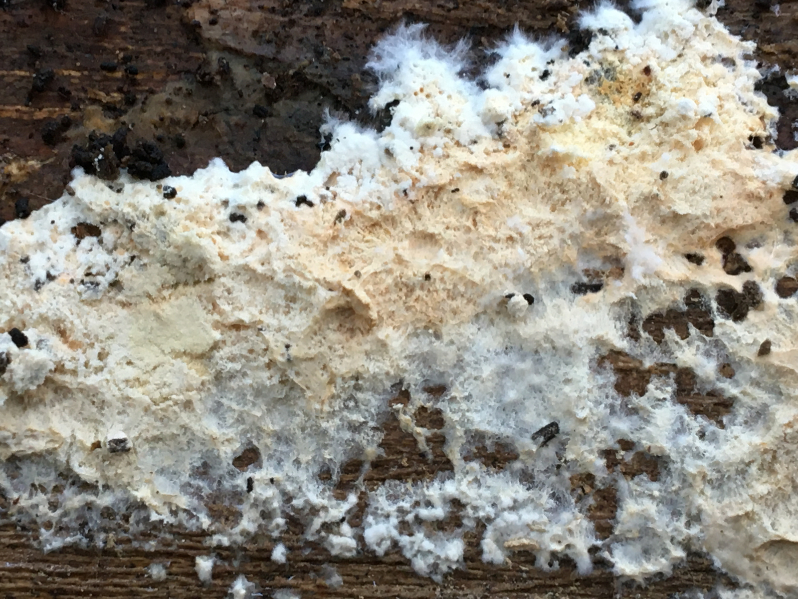 5. Dann fand ich noch einen gelblichen Rindenpilz, der mich an Coniophora puteana erinnert, weil er sich älter nach graubraun verfärbt.