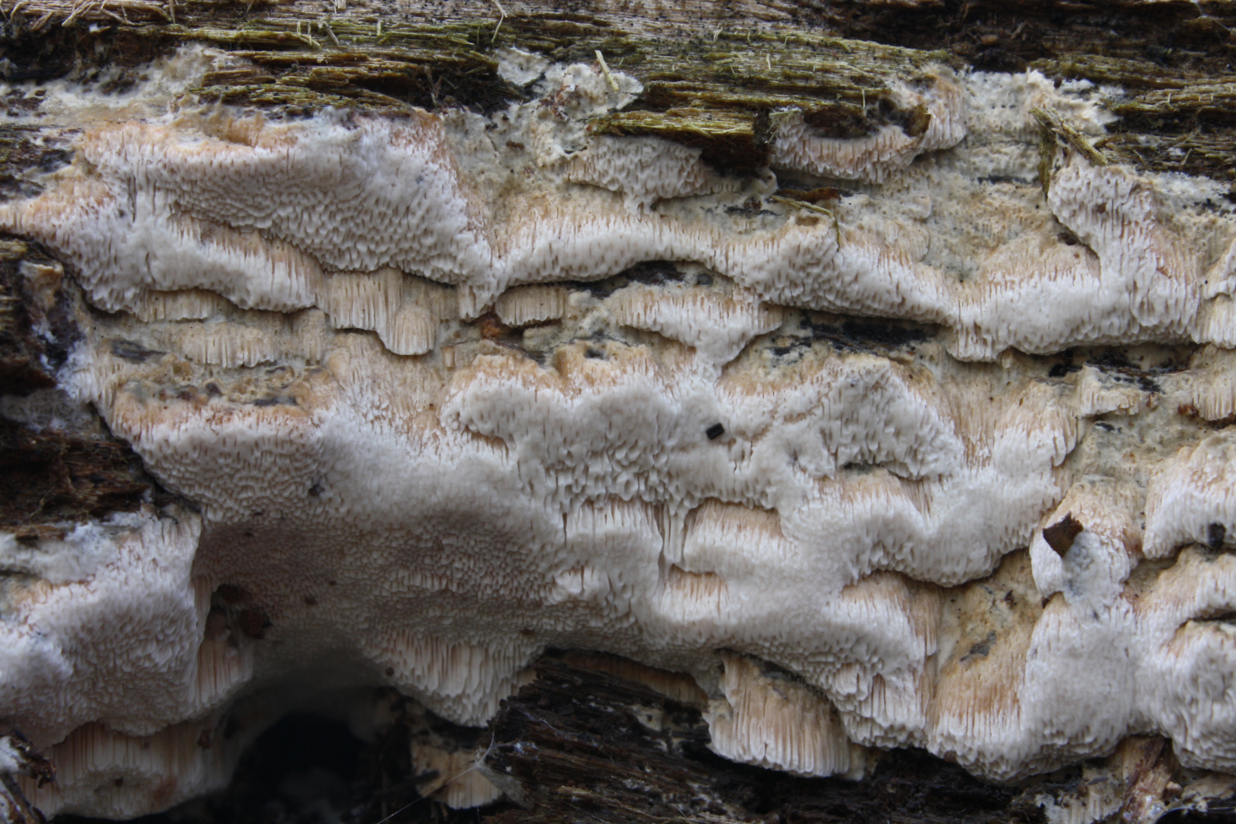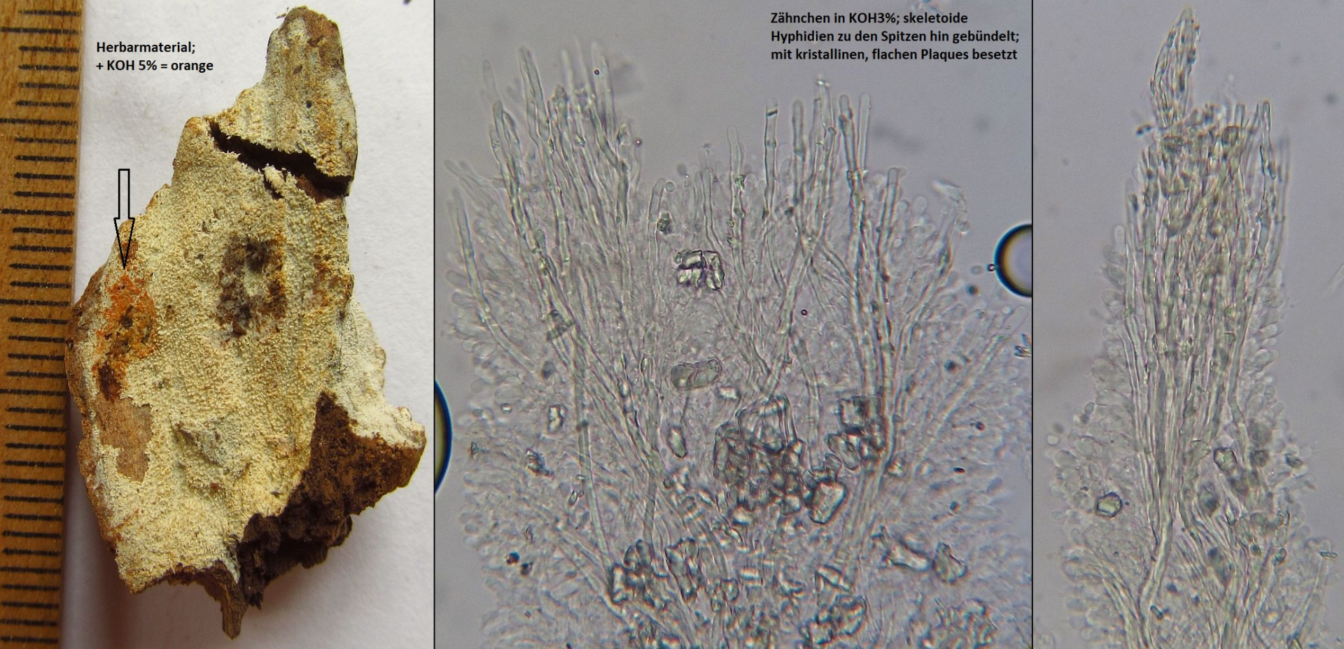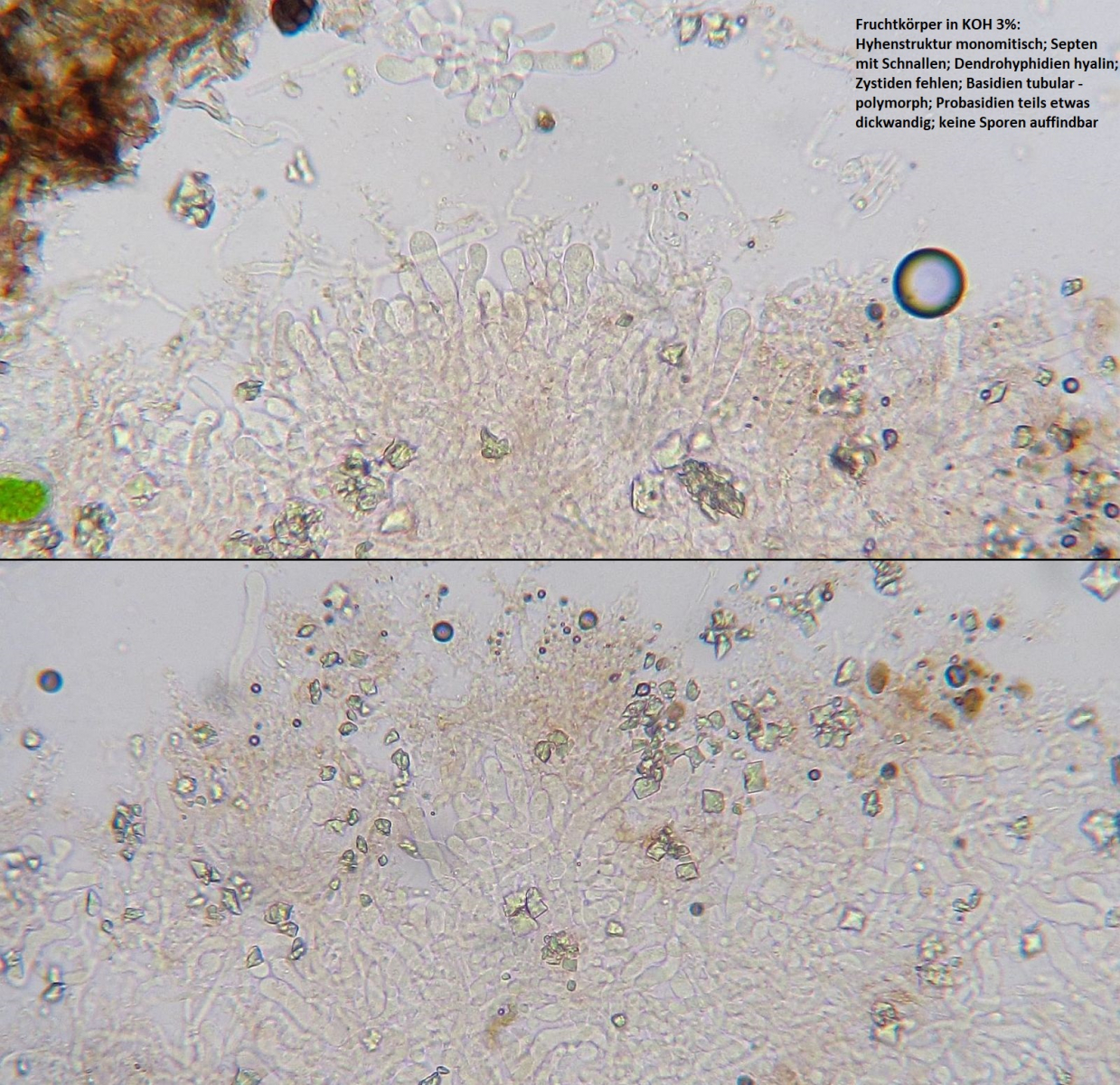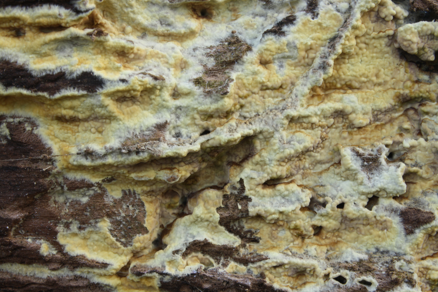 5. Dann fand ich noch einen gelblichen Rindenpilz, der mich an Coniophora puteana erinnert, weil er sich älter nach graubraun verfärbt.
