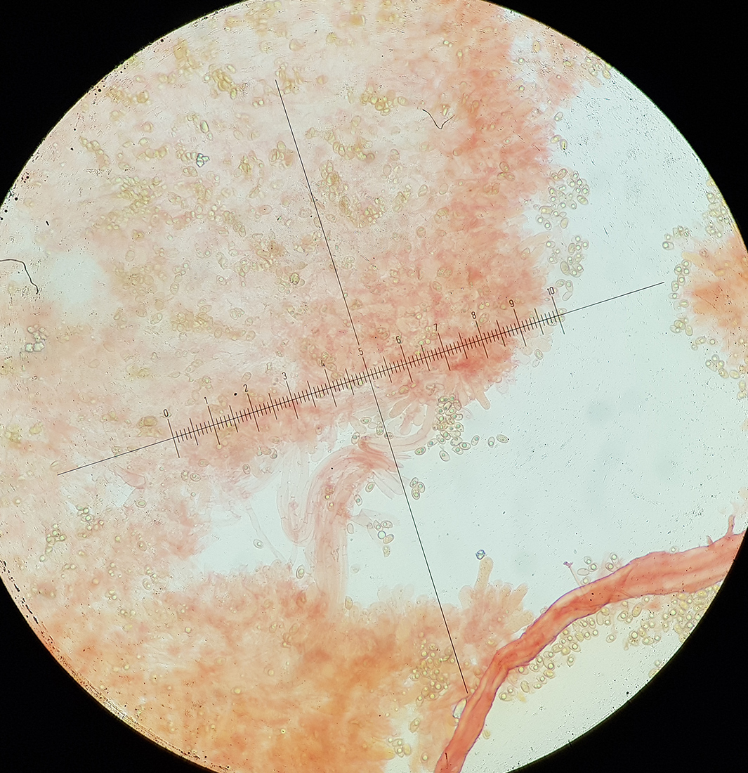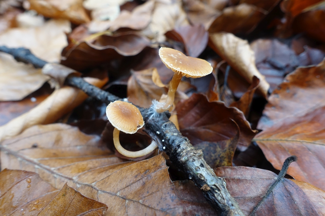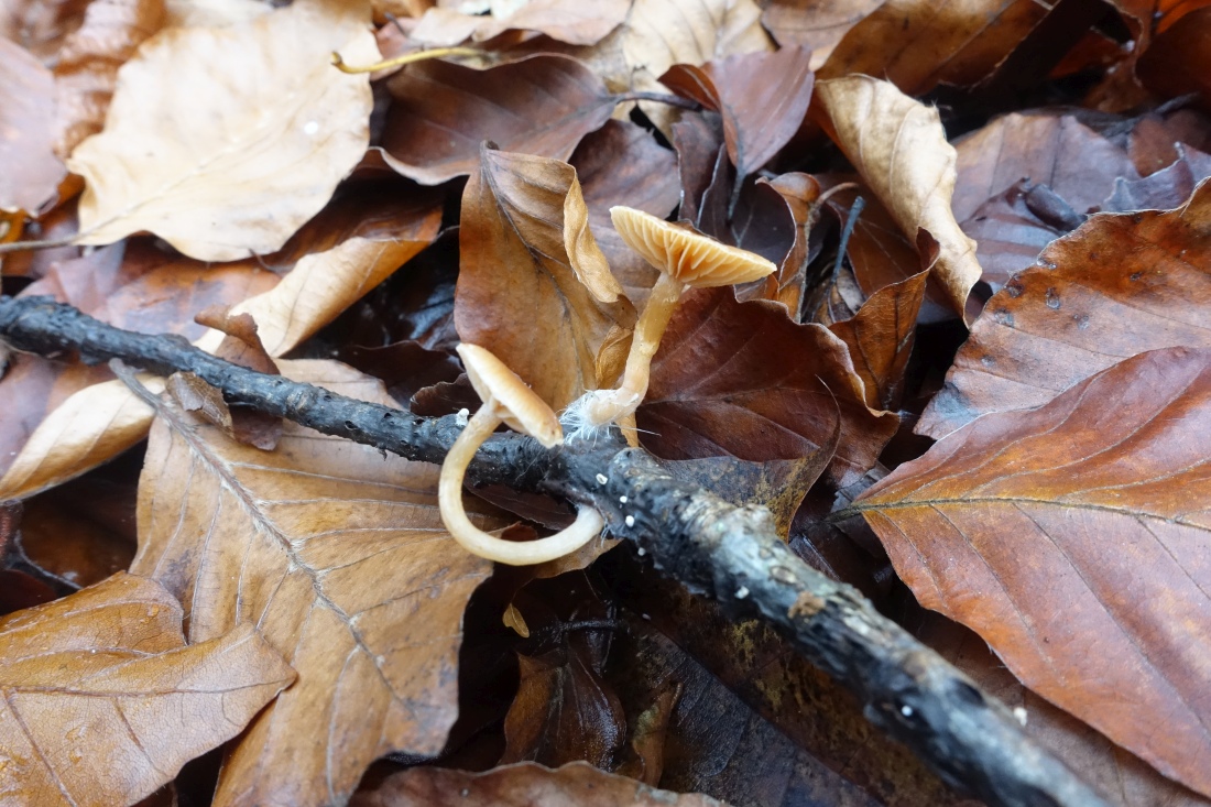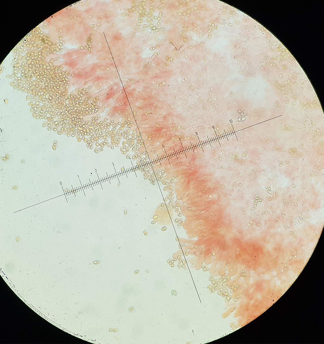 Diesen Fund machte ich ebenfalls im Laubwald auf Kalk. Auf einem Ästchen (vermutlich Buche?) fand ich diese kleinen Kerlchen. Von der Wuchsform her kam mir schnell die Gattung Tubaria in den Sinn, und ich habe mich mal ans Schlüsseln gemacht. Zudem habe ich den Fund genutzt um meine ausbaufähigen Fähigkeiten am Mikroskop zu trainieren. In einem Lamellen-Quetschpräparat fand ich reichlich braune Sporen mit bis zu 9,5 Mirkometer Länge, dazu viele Cheilozystiden, teils sehr kopfig.