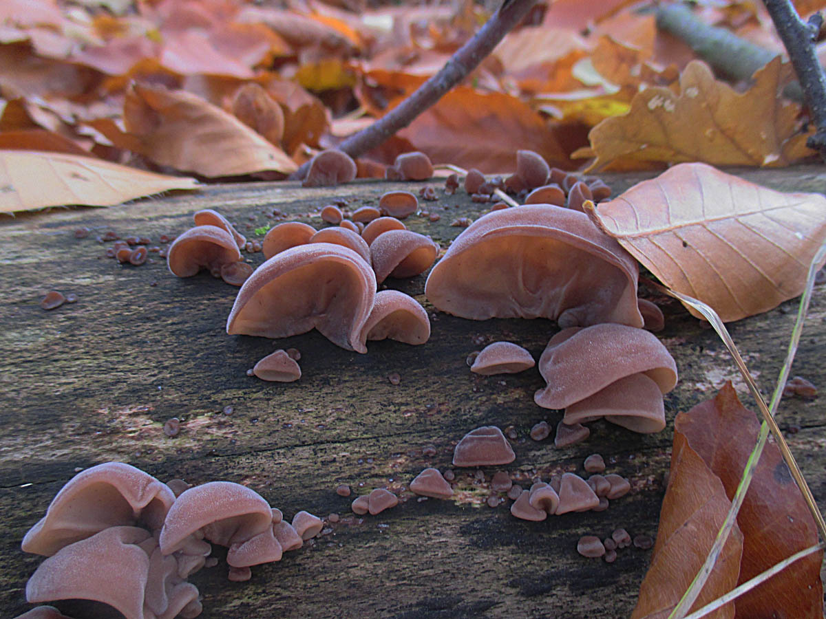 dein unbekannter violetter Pilz ist aus der Gattung Ascocoryne. Ich nehme an, dass es Ascocoryne sarcoides ist, denn diese bildet eine keulige Nebenfruchtform aus, wie du sie uns zeigst. Der Doppelgänger Ascocoryne cylichnium bildet meines Wissens keine Nebenfruchtform, sondern nur hübsche violette Becher. Völlige Sicherheit bringt nur die Betrachtung der Sporen im Mikroskop - die Sporen von A. sarcoides haben maximal drei Septen, die von A. cylichnium haben 5 - 7 Septen.