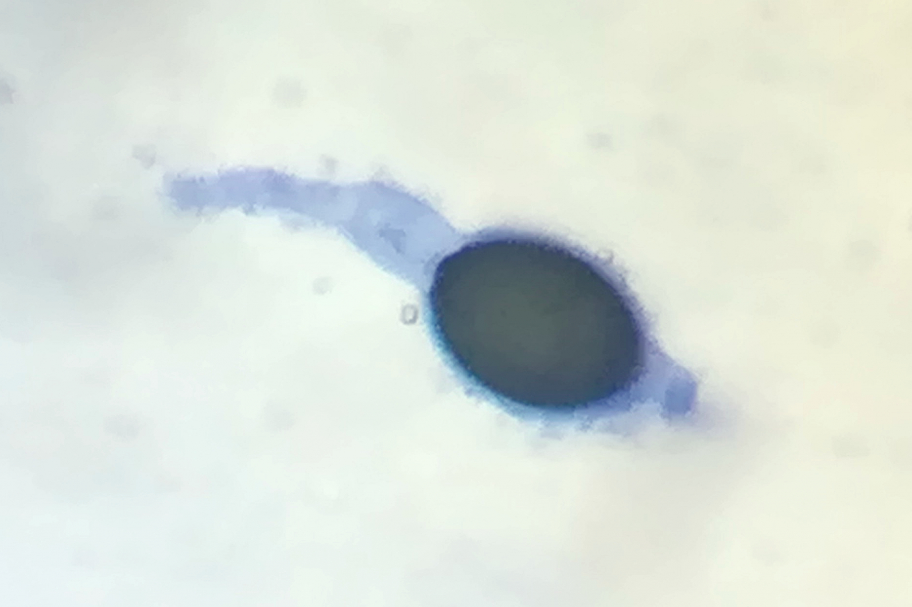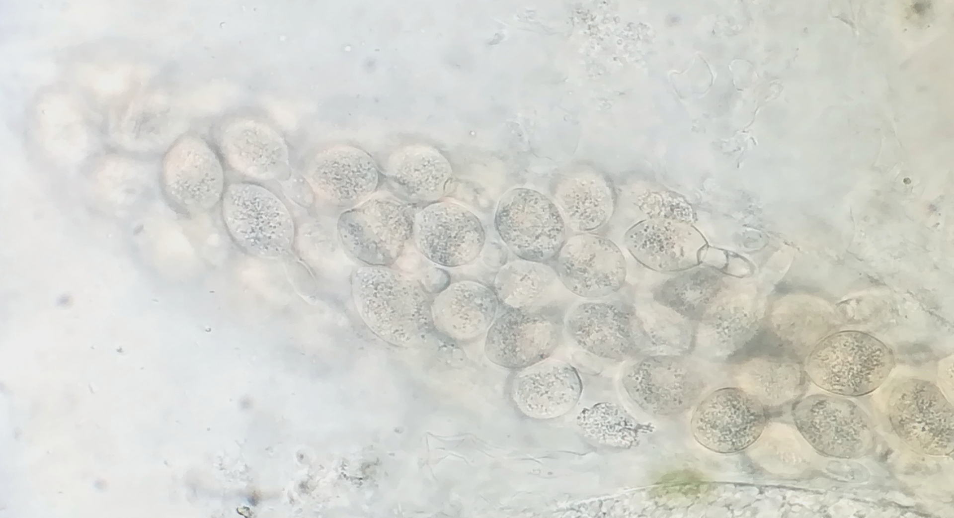 Sporen 19 - 21 x 12 - 13 µm, umgeben von einer dünnen Gelhülle, die auf beiden Seiten dünn ausläuft, dabei auf der einen Seite zweigeteilt