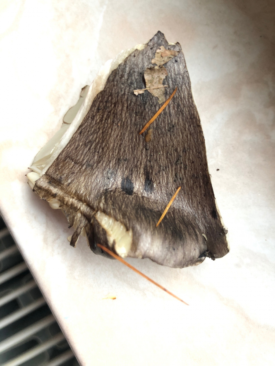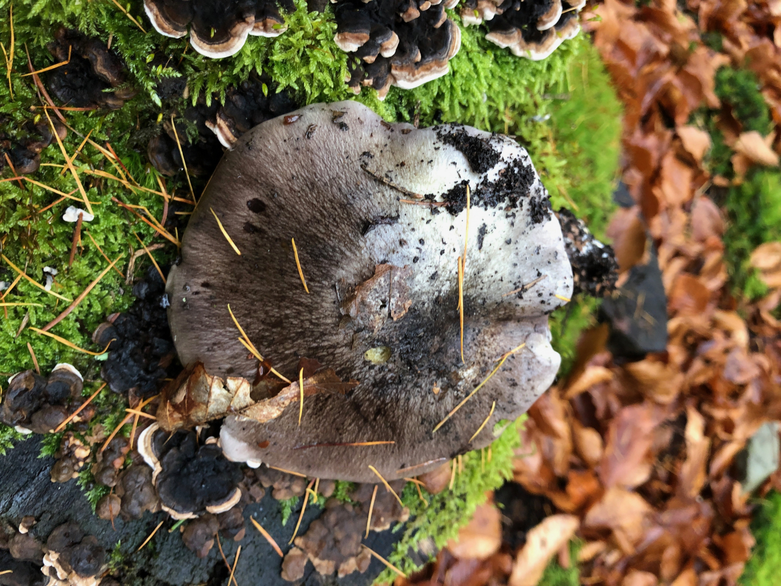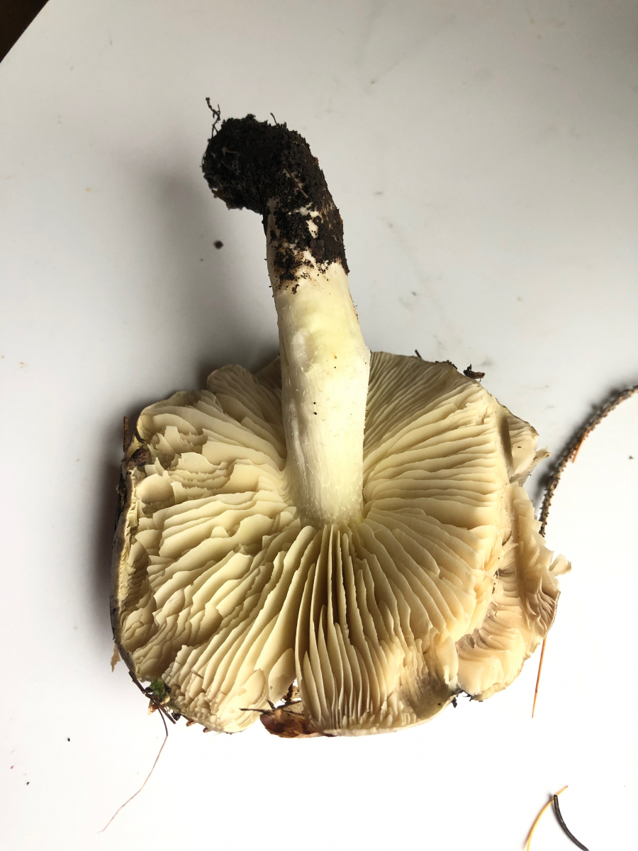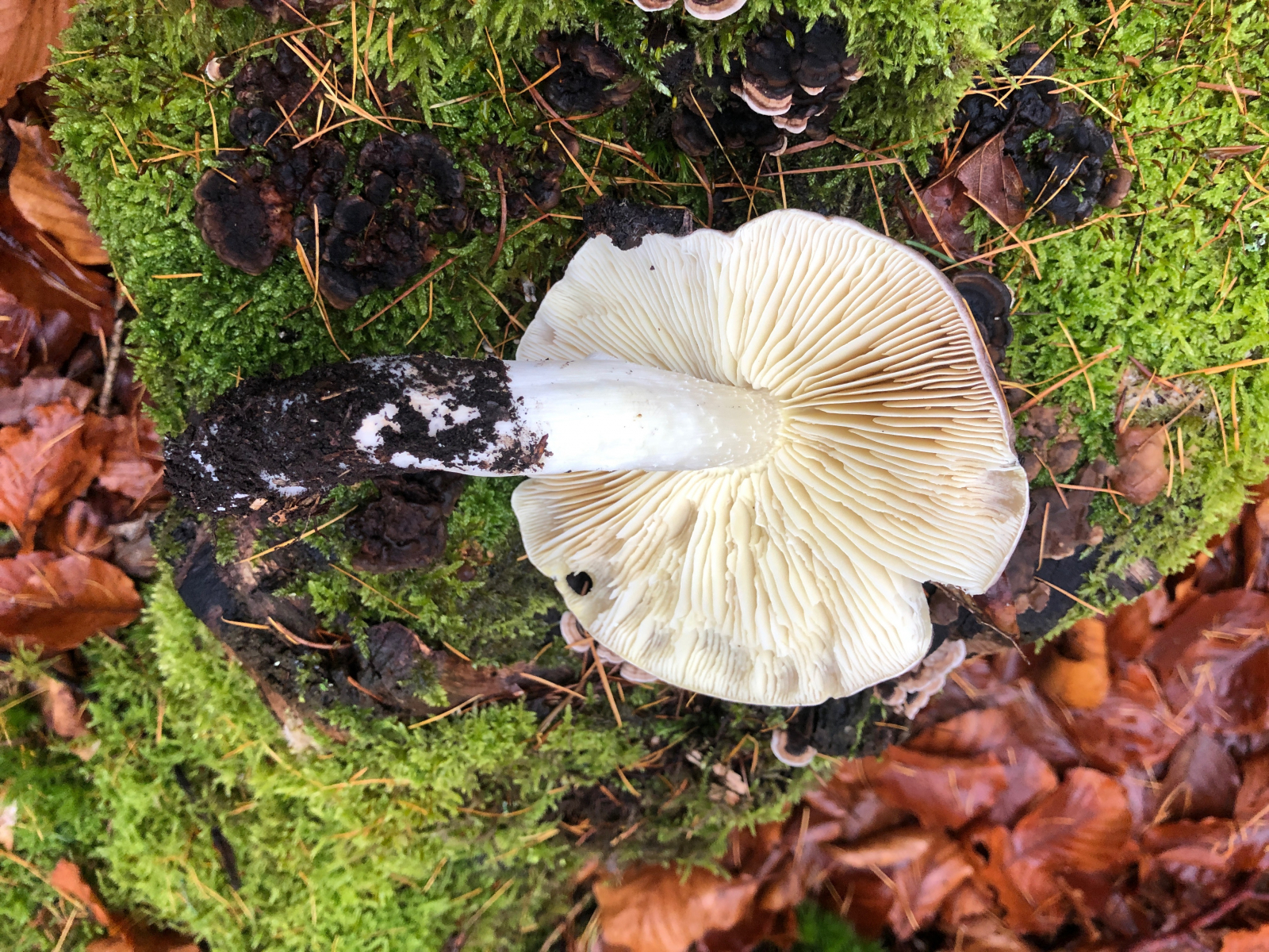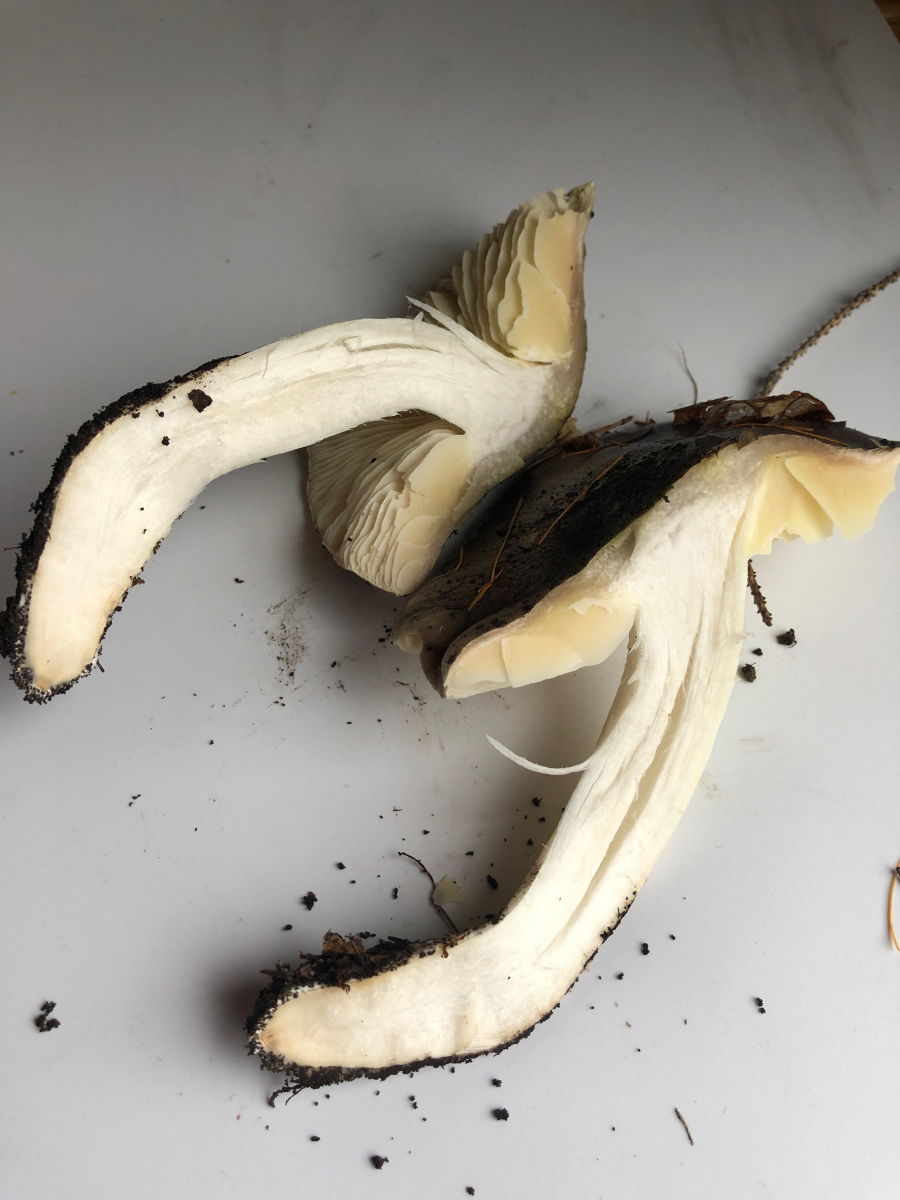 Die Huthaut war schwarzfaserig, die Unterseite gleichmäßig cremeweiß, am Folgetag mit einem Farbstich ins gelb-grünliche, was ich auf den Alterungsprozess zurückführe. Der Stiel war längsfaserig, die Lamellen mit Burggraben breit am Stiel angewachsen.