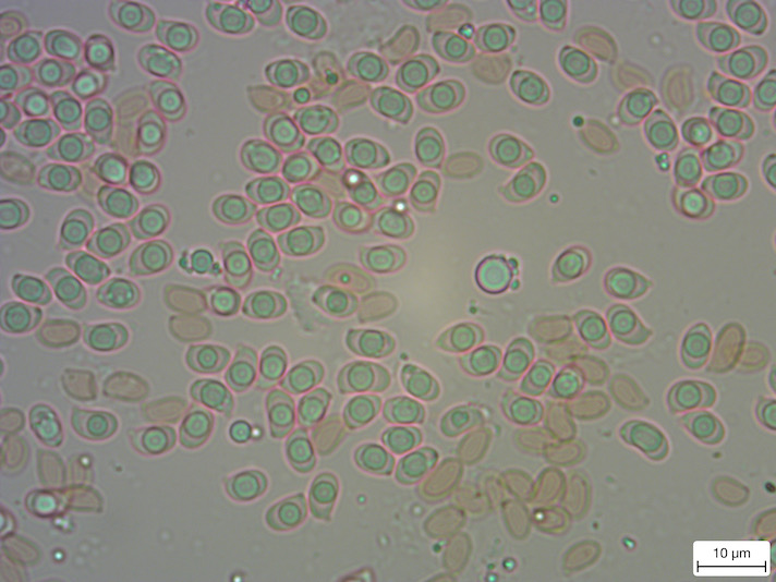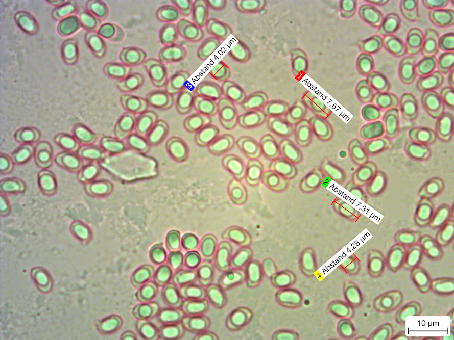 Allerdings passen Geruch und Geschmack, wie ich sie wahrnehme, nicht so richtig und ich bin mir auch immer noch ein bisschen unsicher, weil die Sporenmaße und der Öltropfen für den Schneeritterling - nicht passen, jedenfalls nach Pilze der Schweiz. Demnach sollten die Sporen kleiner sein, keine Öltropfen vorhanden sein und die Basidien 2-4 Sterigmien haben. Diese hier haben nur 2. Darf der das? Bzw. wurde die Art aufgesplittet?