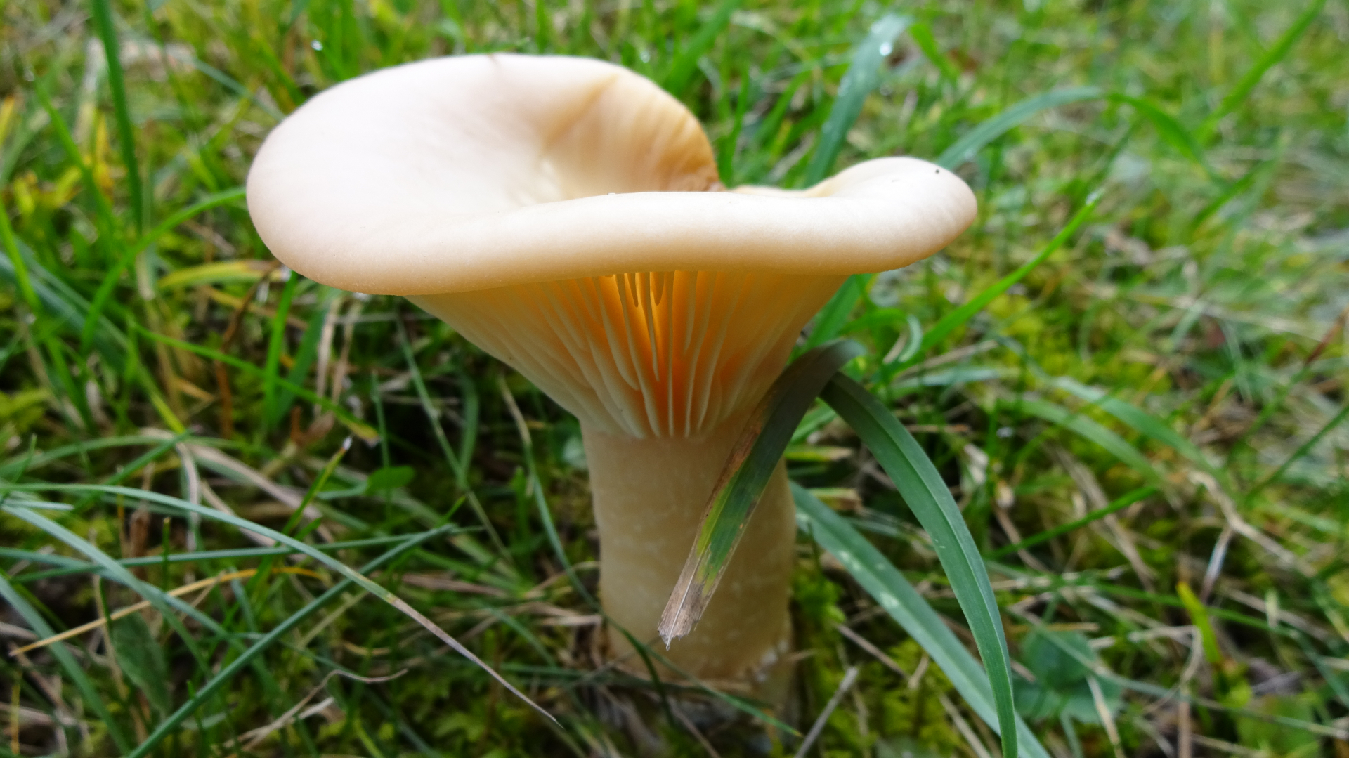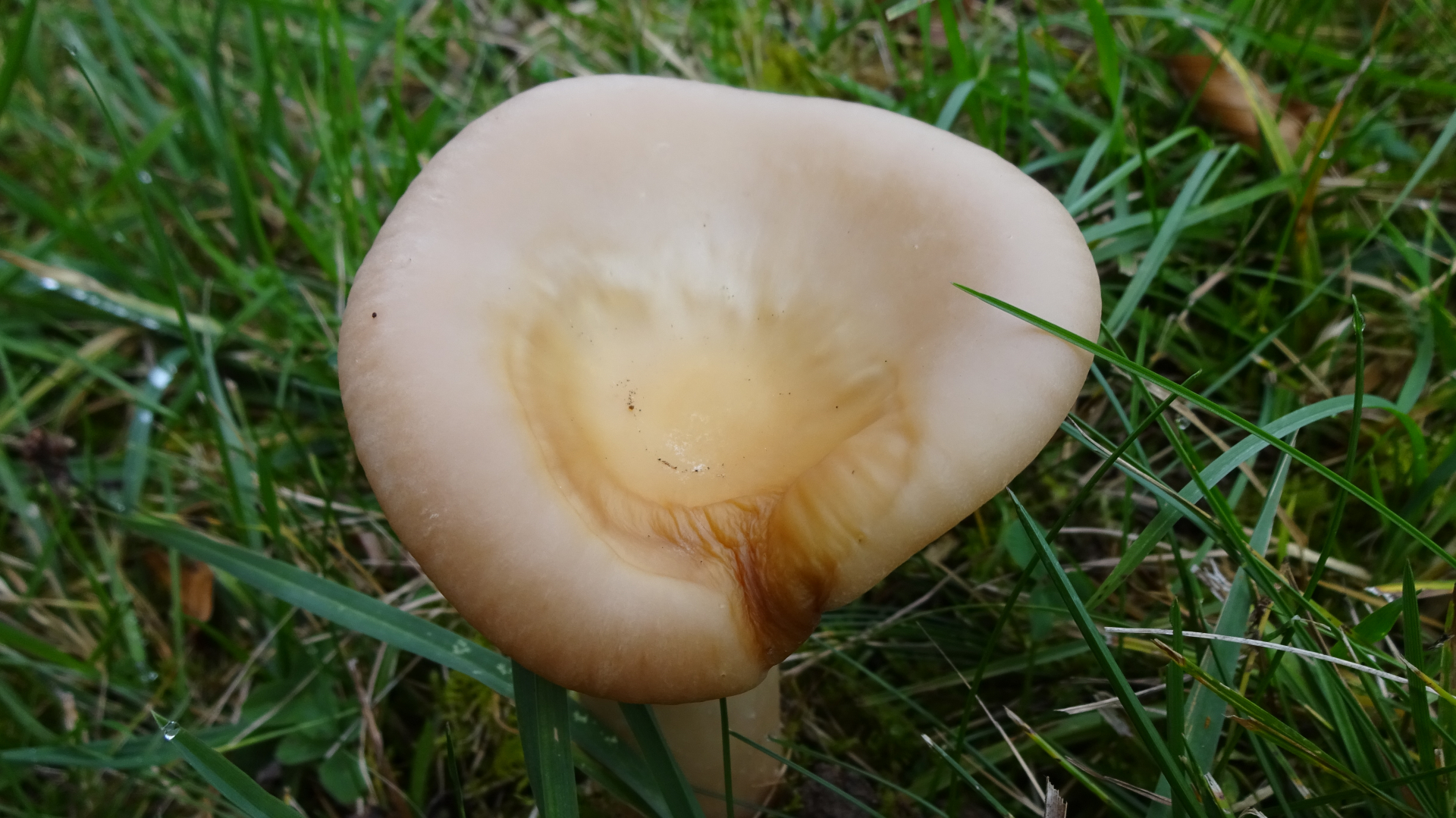 Ich finde, der sieht sehr komisch aus für einen Mönchskopf. So glatt auf dem Hut, so speckig, vielleicht sogar hygrophan? Jedenfalls wäre das eine arg ungewöhnliche Erscheinung für Infundibulicybe geotropa.