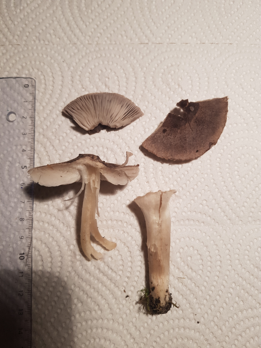 2. Standort war unter Erlen (in Kiefernnähe). Geruch ähnlich zum ersten Pilz, Stiel auch. Hut ist trocken und fein filzig. Lamellen weißlich-hellgrau. Ebenfalls keine Farbänderungen.
