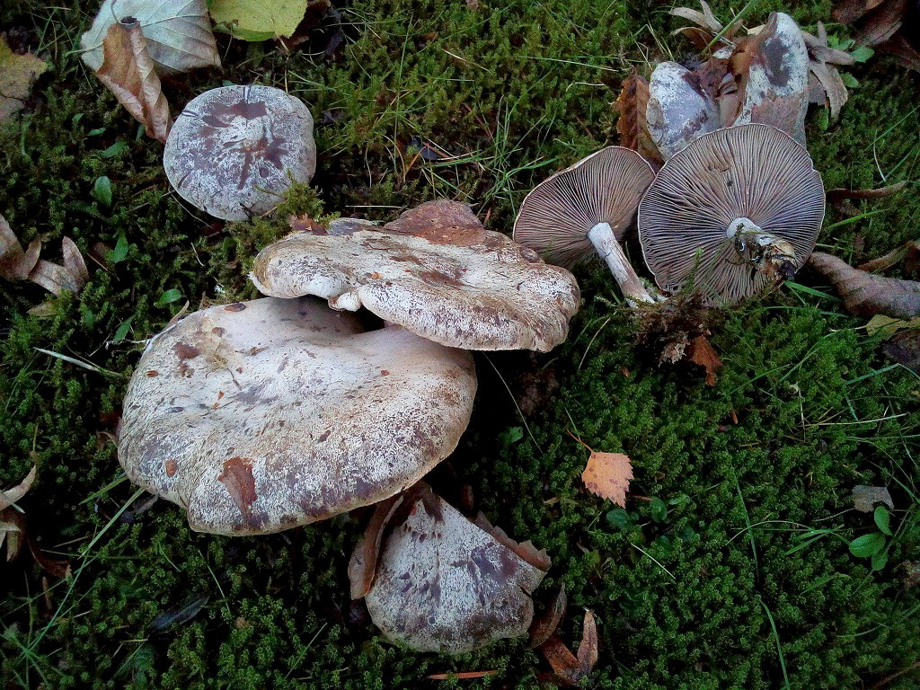 Ebenfalls mit den befirnist wirkenden, teilweise gefleckten Hüten und für einen Weißsporer auffallend (dunkel-)grauen Lamellen.