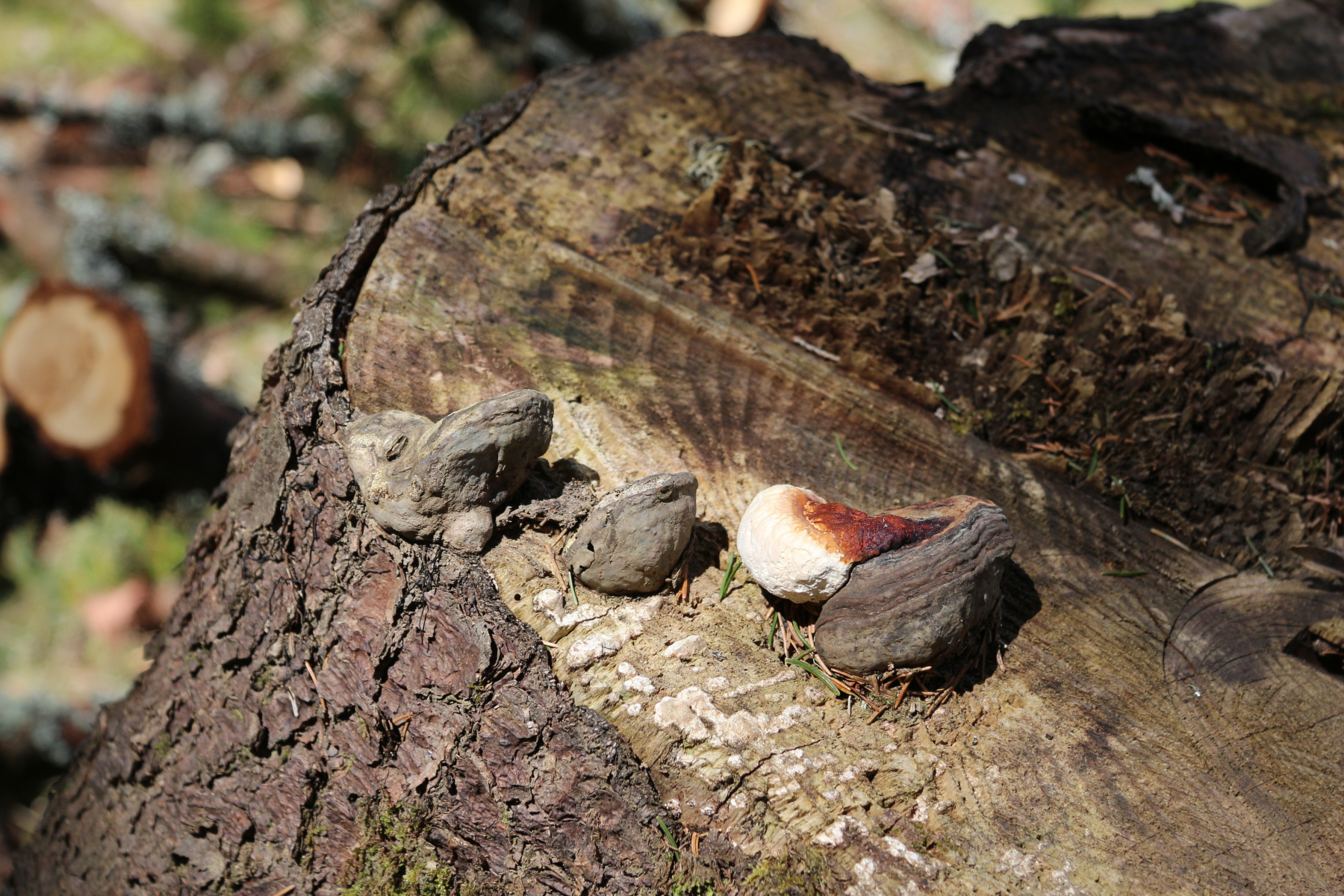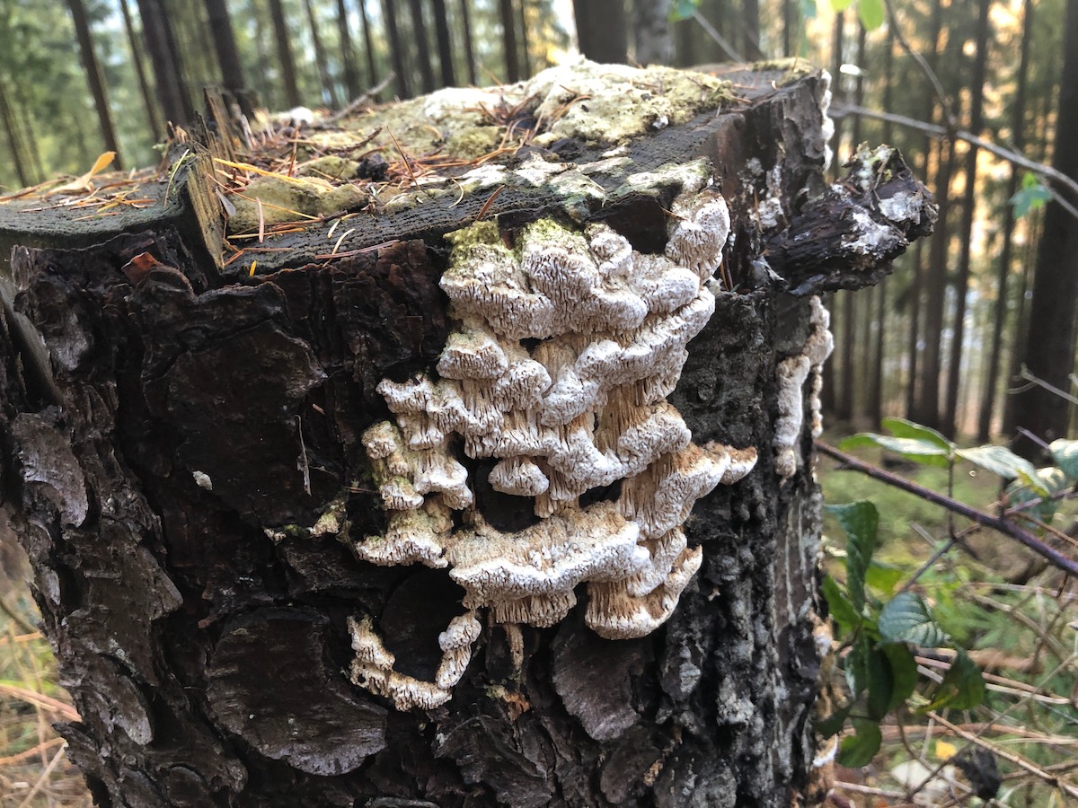 Der erste "Pablopilz" an dem Fichtenstumpf schaut sehr interessant aus. Das sollte Antrodia heteromorpha sein.
