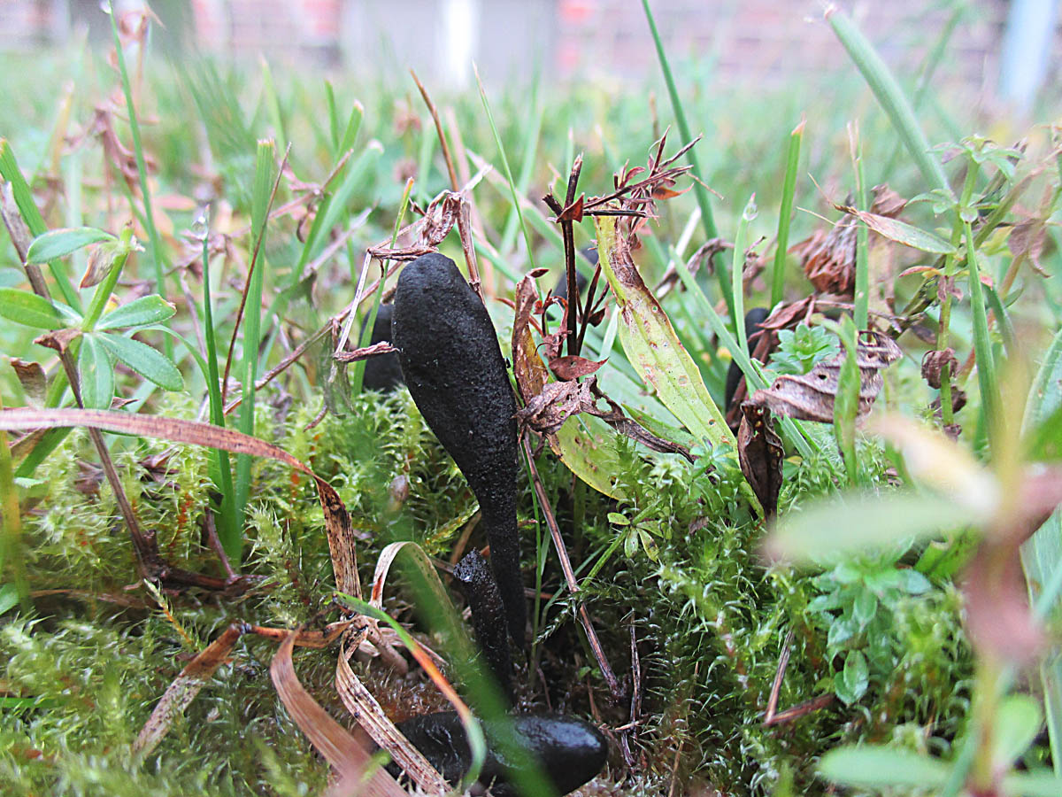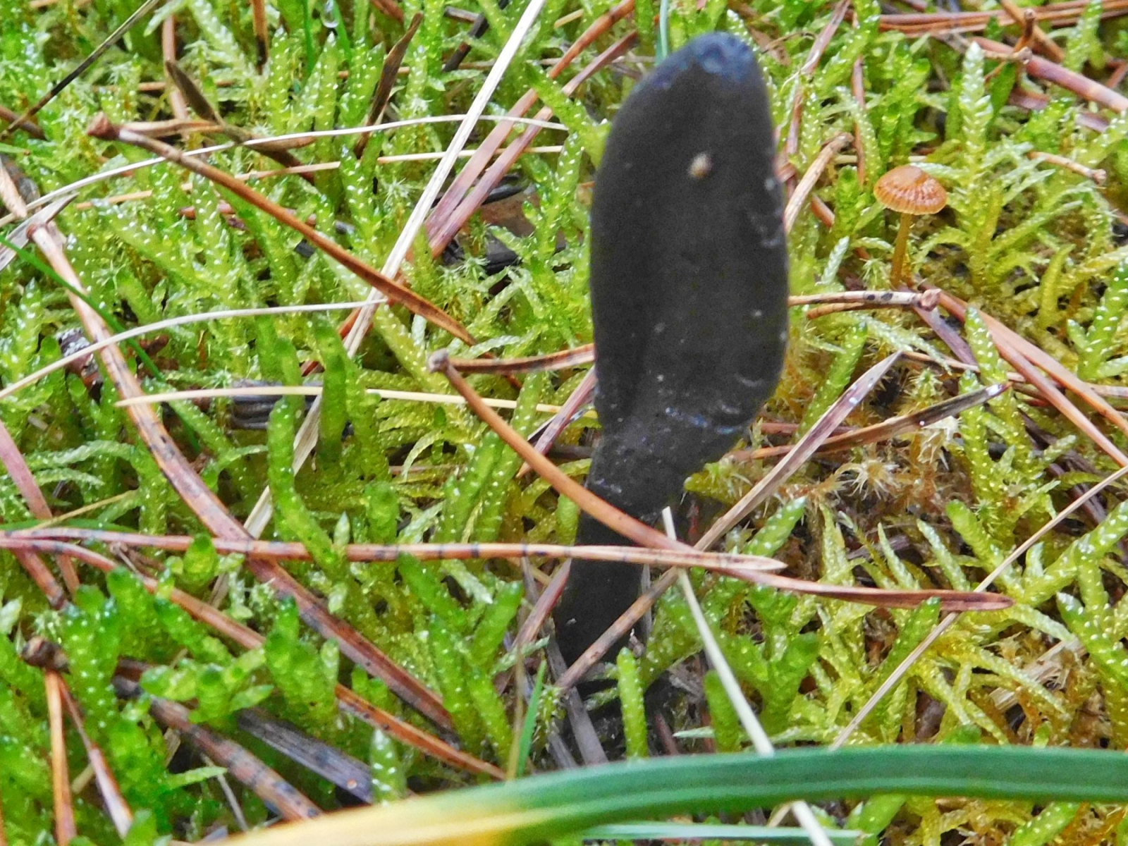 • Heute waren wir mal an die Ostsee gefahren. Auf dem Rückweg im sandigen Kiefernwald kleine keulenartige Pilze. Es fehlte nur das Holz für eine Holzkeule. Also etwas Interessantes! Kein Pilzmesser dabei. Mit den Fingern aus dem Moos gebuddelt. Der Pilz ist leicht biegsam und weich. Innen auch schwarz.