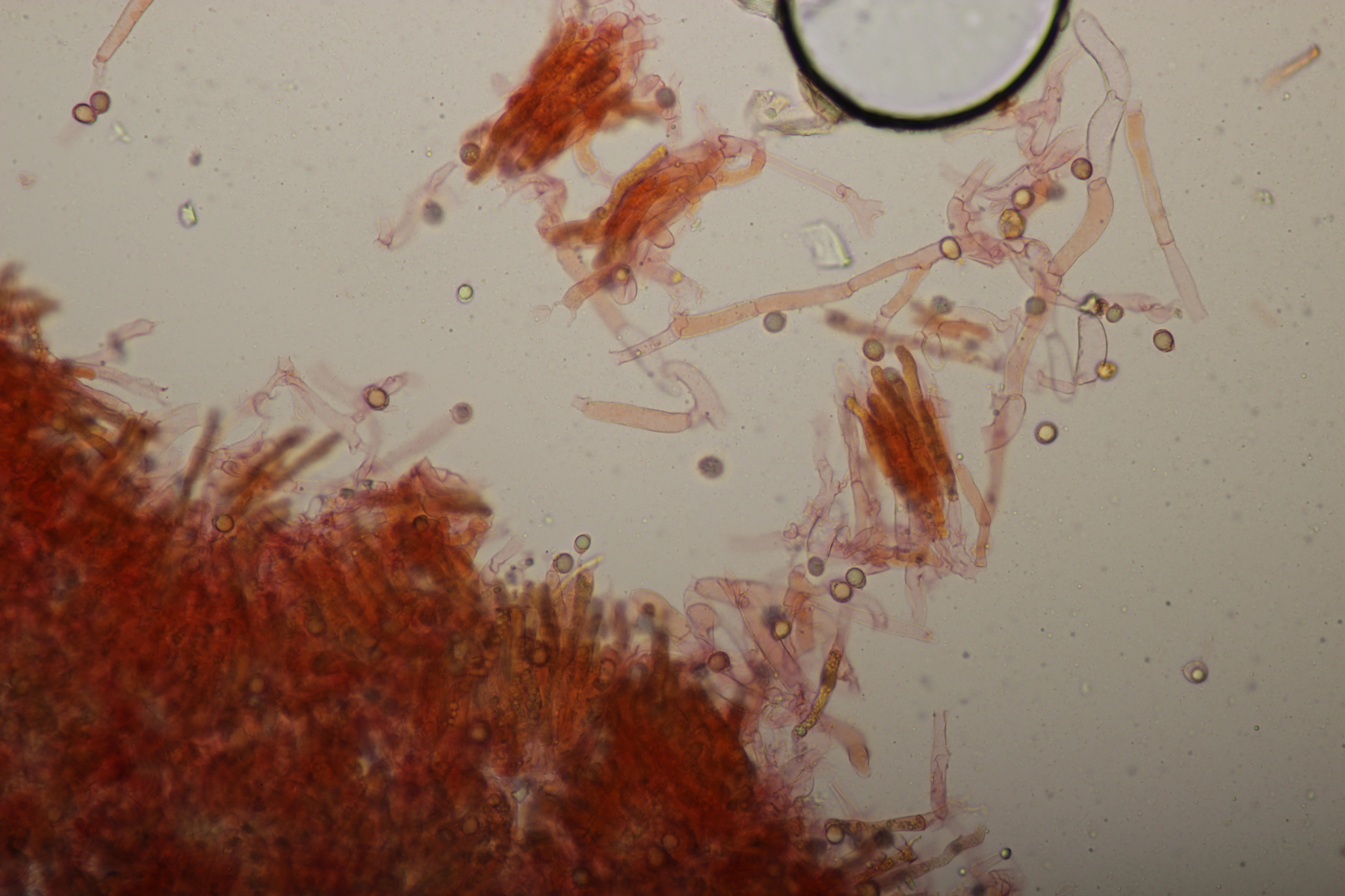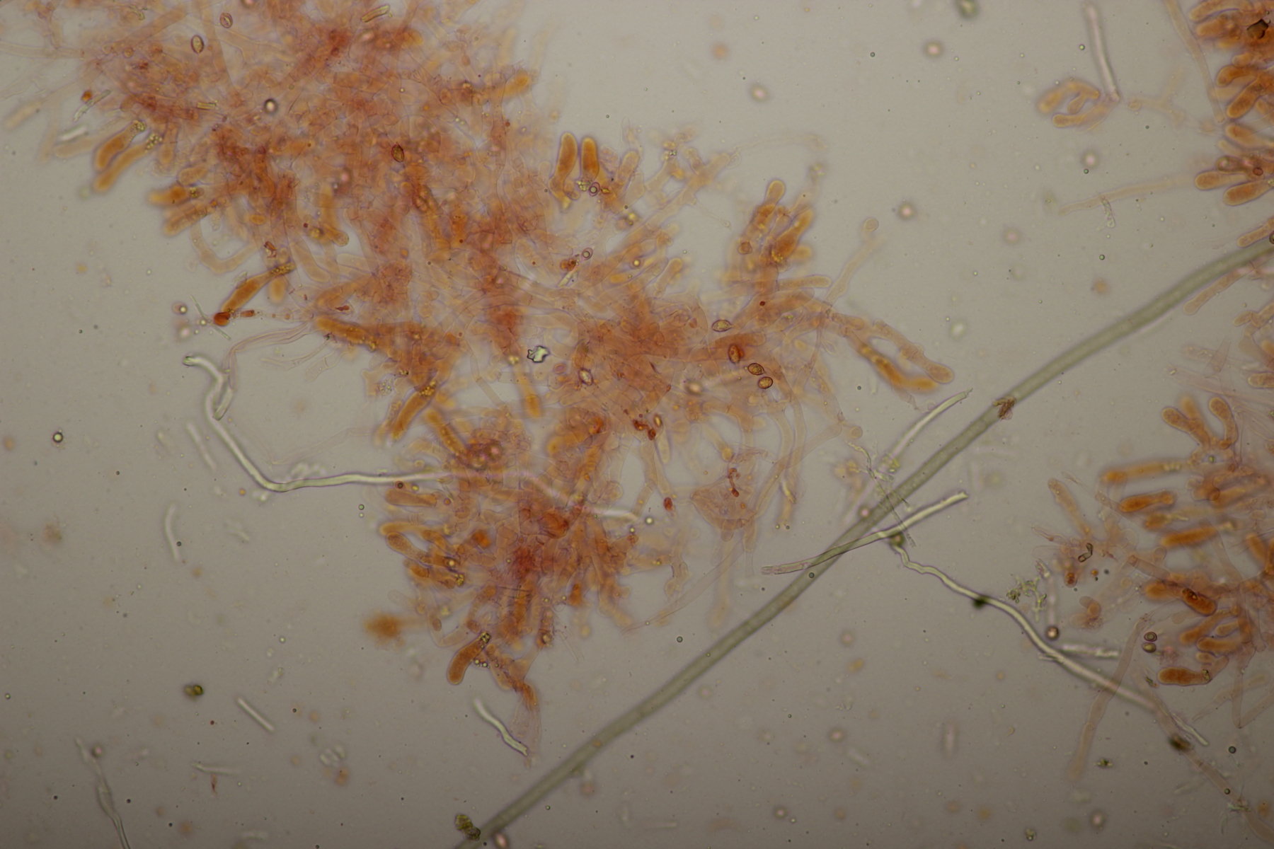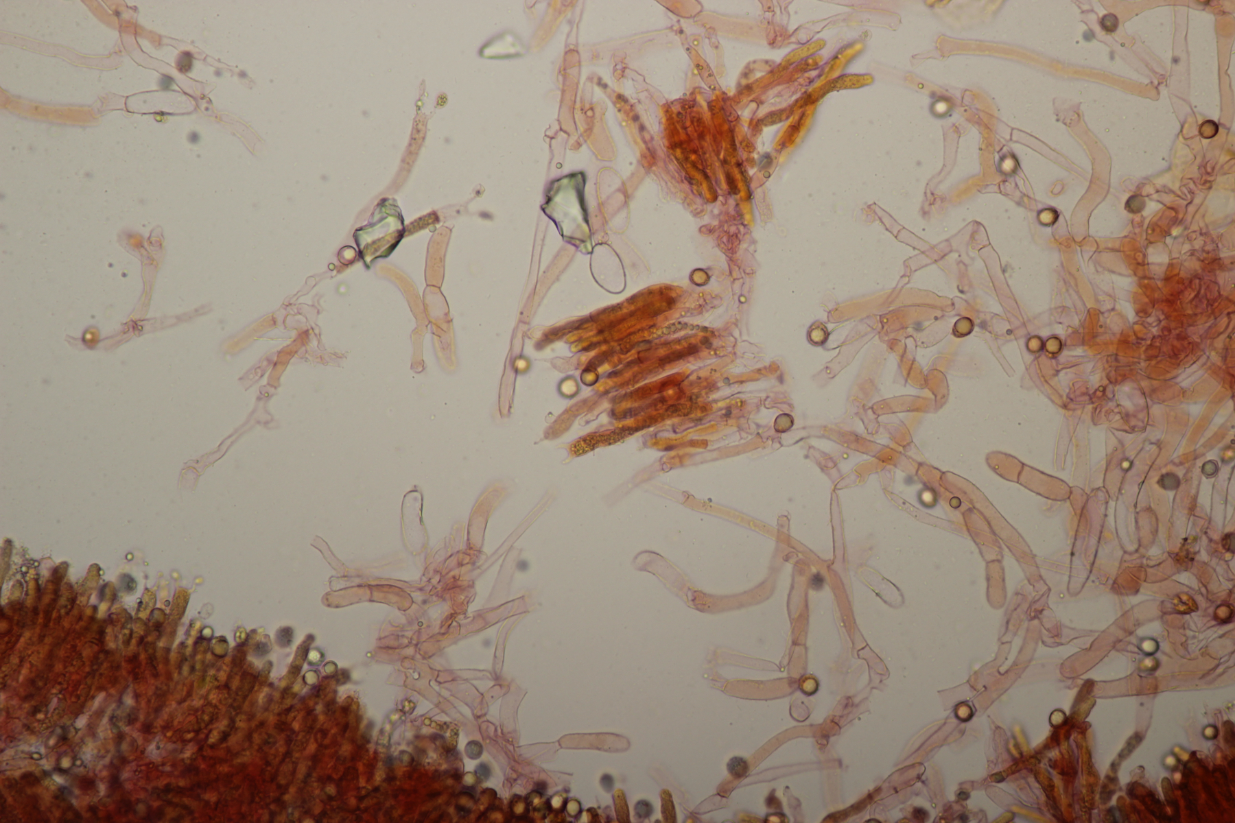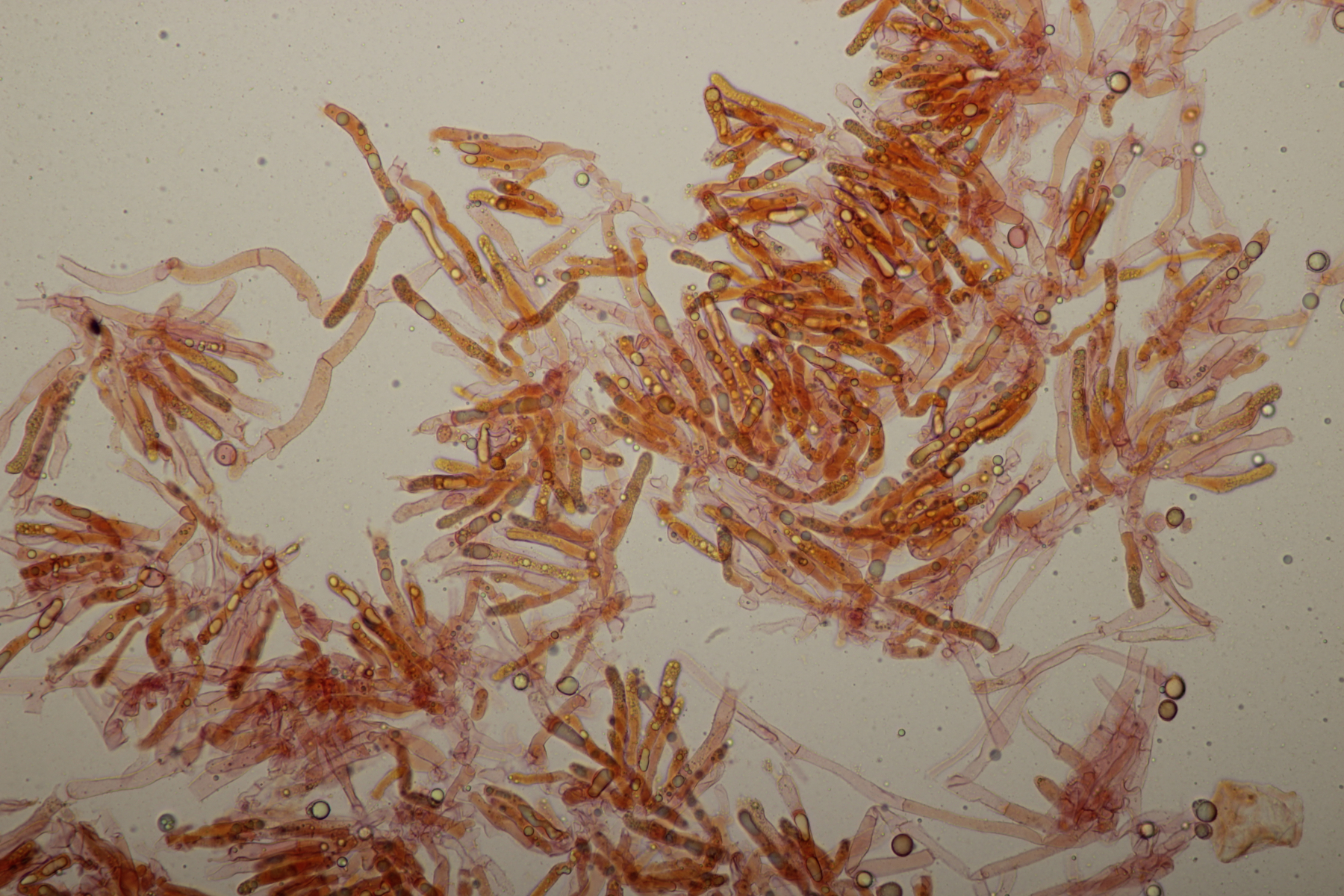 9. Ein unbekannter gelber Rindenpilz, der zwar an den Hyphen keine Schnallen hatte, dafür aber Basalschnallen an den Basidien aufwies. Zystiden waren keine zu erkennen. Ob die dickwandigen Hyphen, die sich mit Kongorot teilweise sehr pink verfärbten (bzw. Belag daran), dazugehören oder einfach nur zum Porling, der überwachsen wurde, gehören, kann ich nicht sicher sagen.