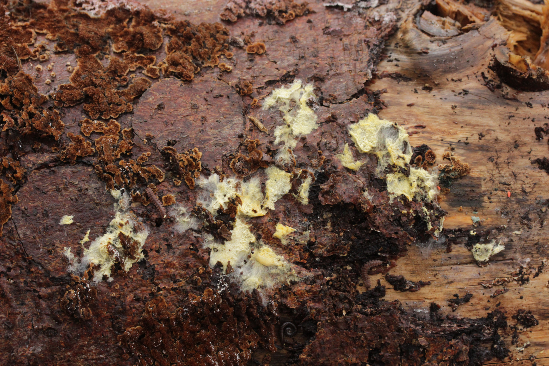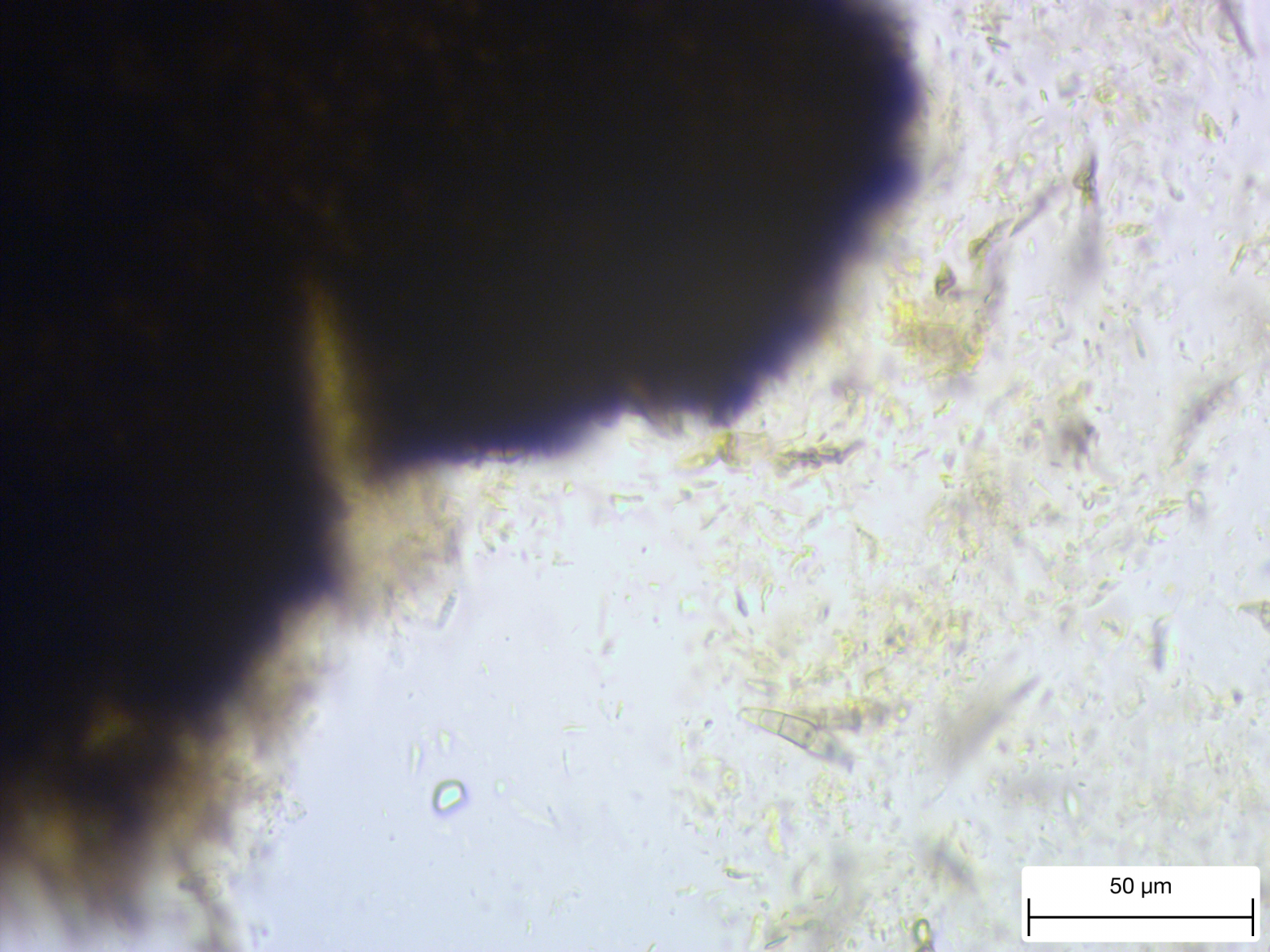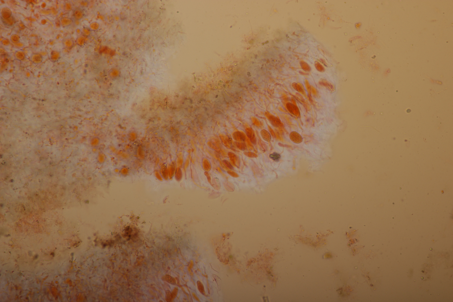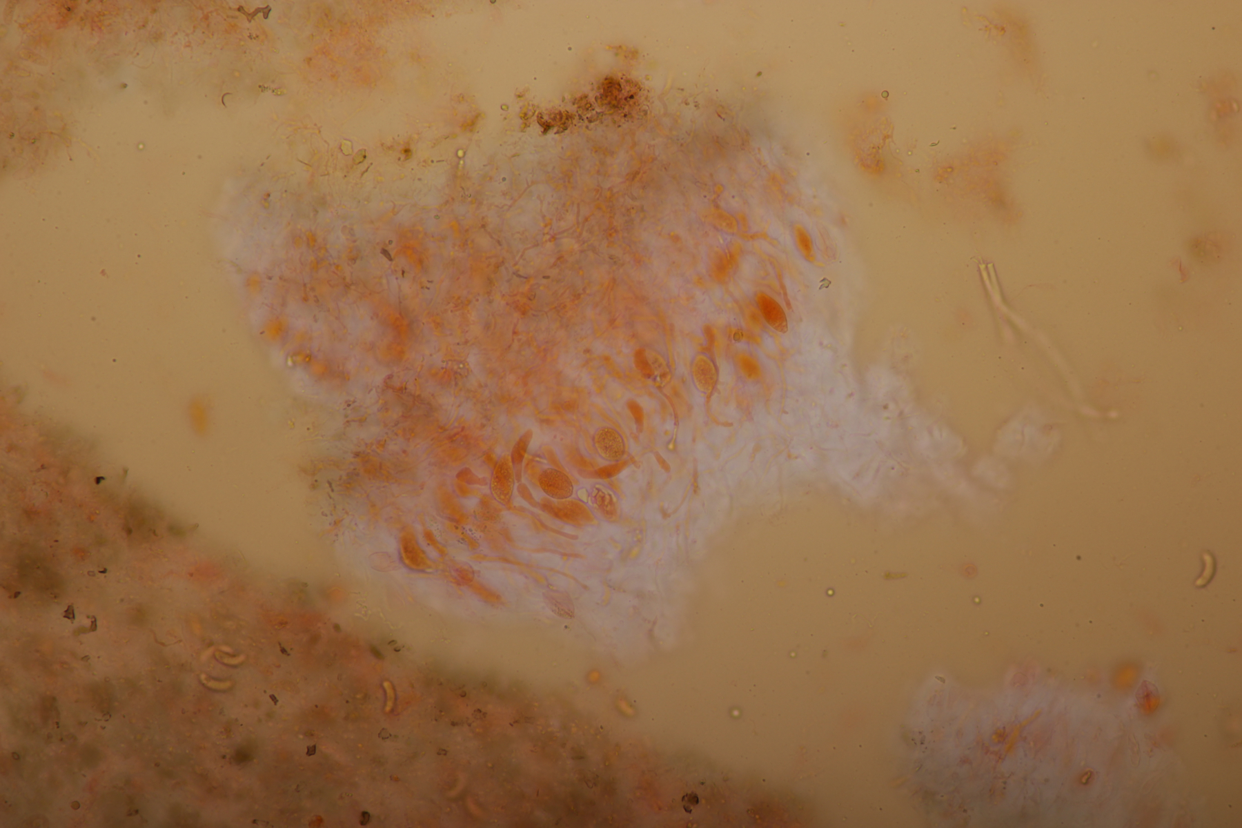9. Ein unbekannter gelber Rindenpilz, der zwar an den Hyphen keine Schnallen hatte, dafür aber Basalschnallen an den Basidien aufwies. Zystiden waren keine zu erkennen. Ob die dickwandigen Hyphen, die sich mit Kongorot teilweise sehr pink verfärbten (bzw. Belag daran), dazugehören oder einfach nur zum Porling, der überwachsen wurde, gehören, kann ich nicht sicher sagen.