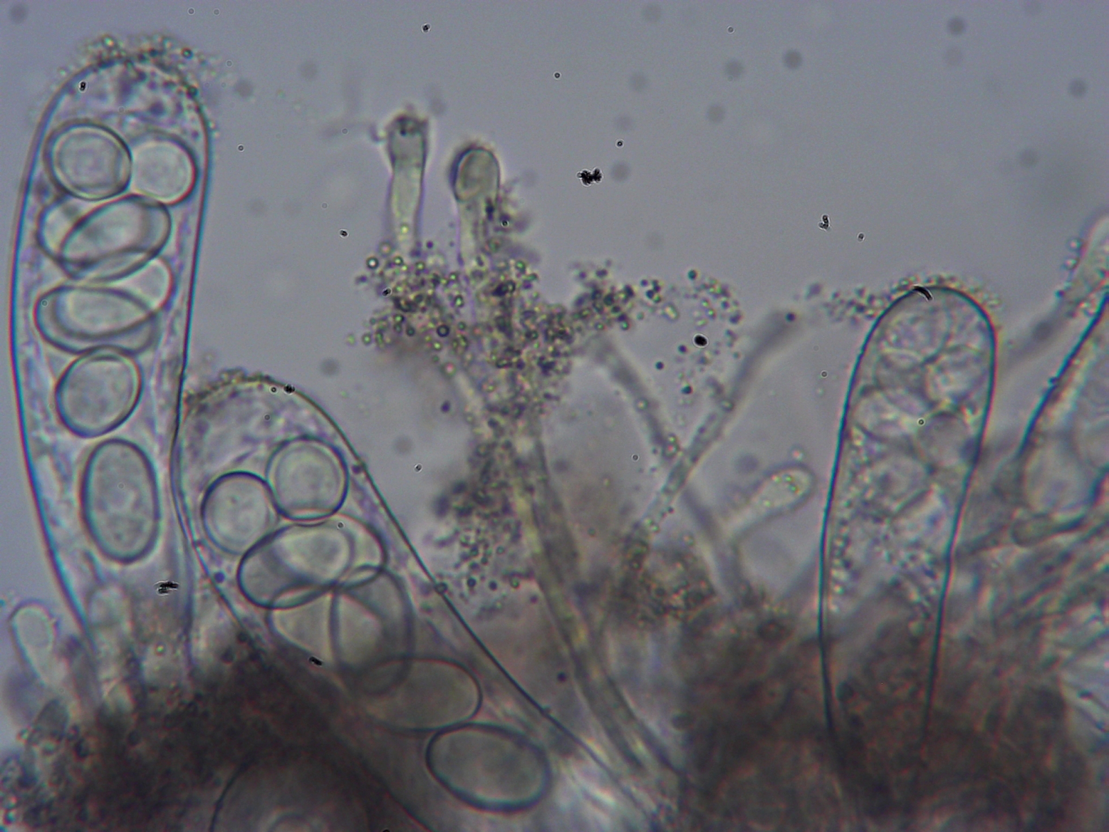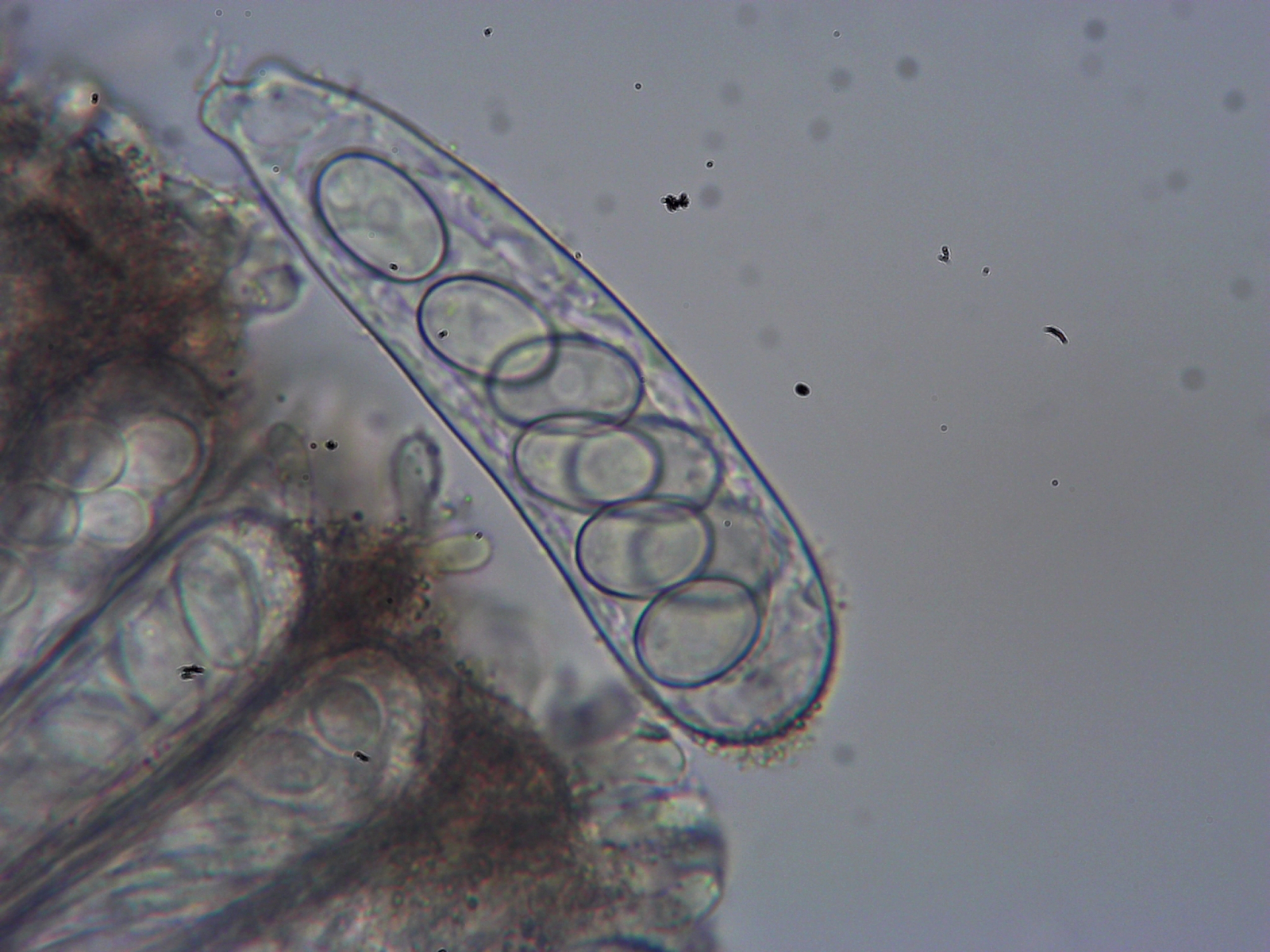 Unter dem Mikroskop zeigten sich auffallend dicke operculate 8-sporige Asci mit breiter Basis und negativer Reaktion auf Melzer und JKJ. Die Sporen waren glatt, ellipsoid, hyalin und 15-18 µm groß.