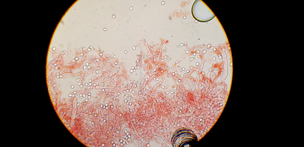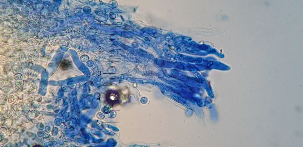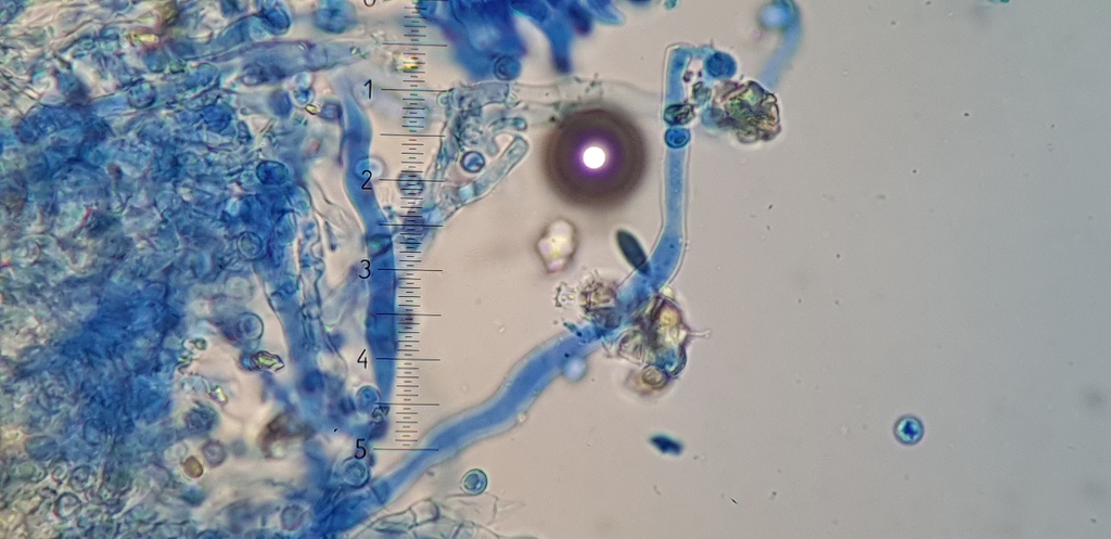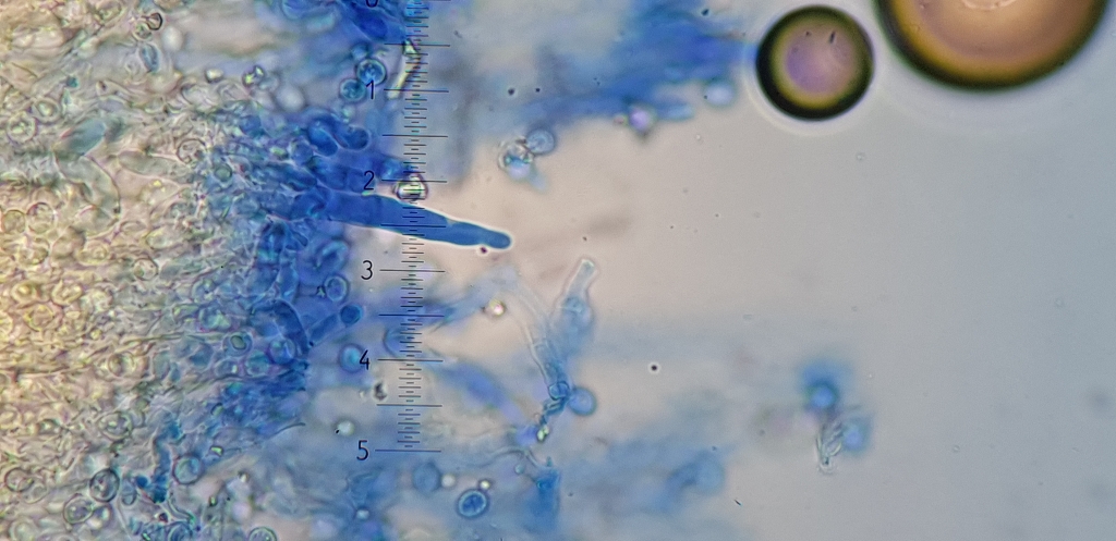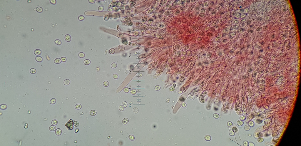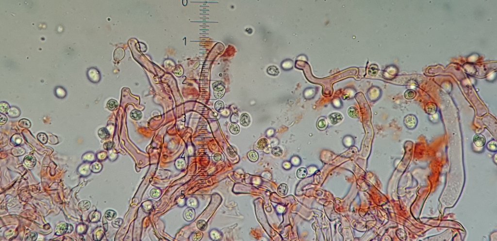 Das Hyphensystem ist monomitisch mit schnallen, aus dem Hymenium ragen sehr langen Zystiden heraus, ich denke Gloeozystiden, SV-.