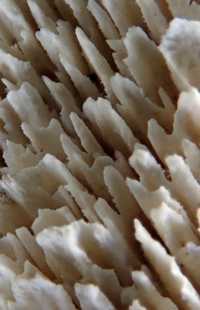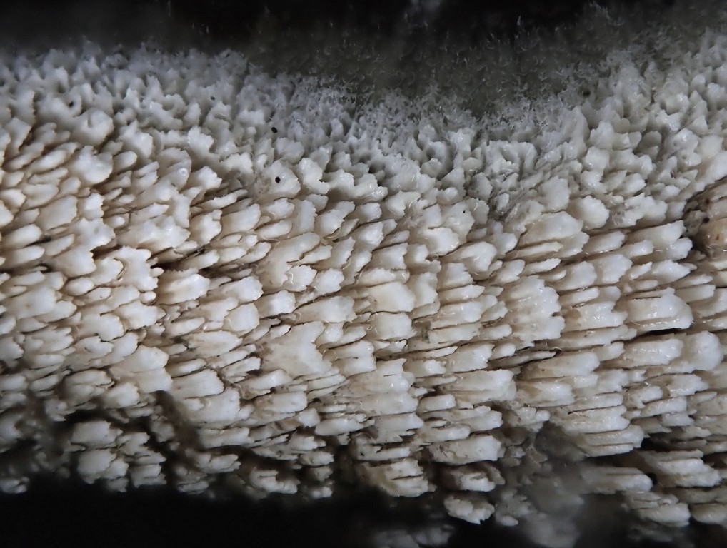 Hymenium mit langen unregelmäßigen Zähnchen, insgesamt weich und leicht vom Substrat ablösbar.