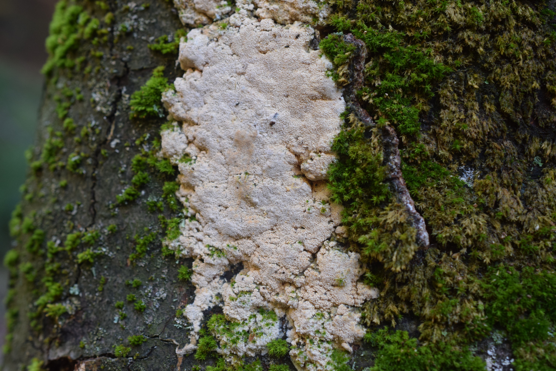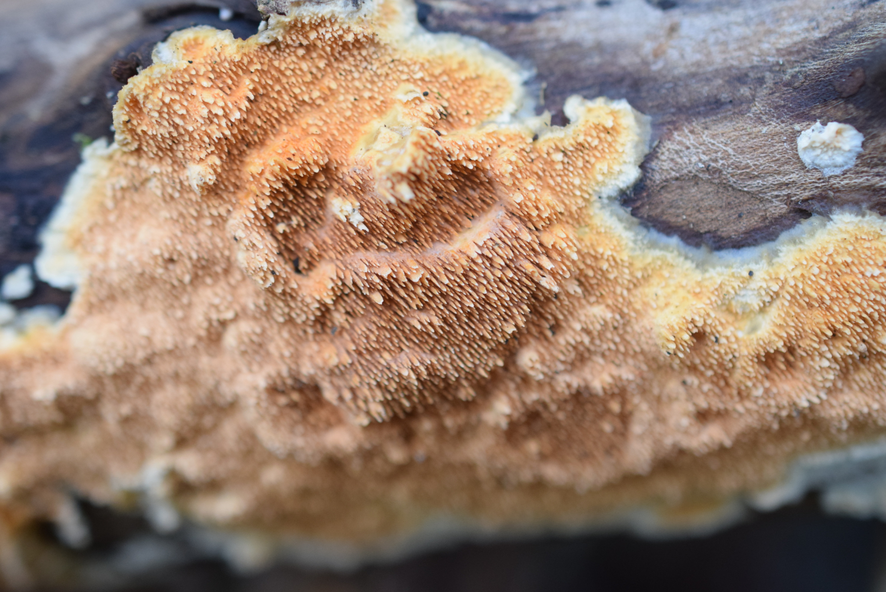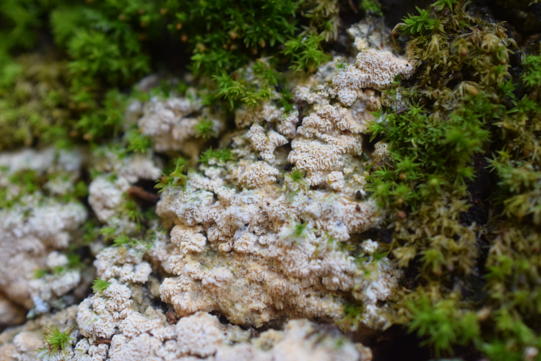 1. An liegende Laubbaum Ast , nur Laubwald , weit und breit keine Nadelbaum ca 90 m ü NHN , ein Steccherinum ?