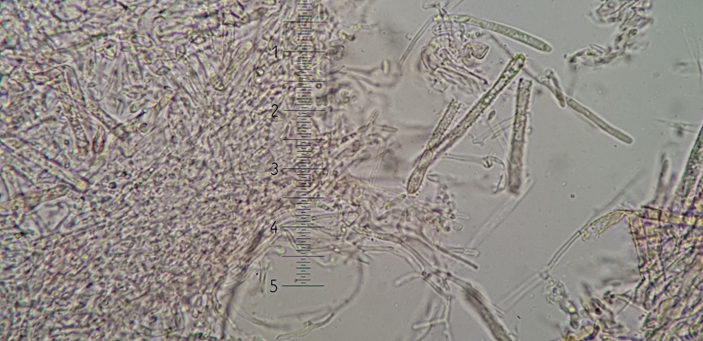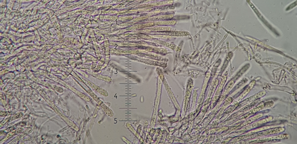 Haare kaum über 60 lang (kann man schon am Makro so vermuten, die Dasyscyphella wäre etwas wuscheliger), apikal verschiedengestaltig, aber nie stark keulig, apikal granuliert, schmale Paraphysen, diese kaum über die Asci ragend und mit nur unauffälligem gürteligen Inhalt, Asci mit Haken und Sporen nicht über 7,5 in der Länge und nur selten über 2,1 in der Breite und ohne auffällige Öltropfen.