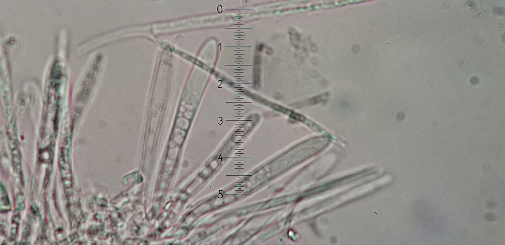 Haare kaum über 60 lang (kann man schon am Makro so vermuten, die Dasyscyphella wäre etwas wuscheliger), apikal verschiedengestaltig, aber nie stark keulig, apikal granuliert, schmale Paraphysen, diese kaum über die Asci ragend und mit nur unauffälligem gürteligen Inhalt, Asci mit Haken und Sporen nicht über 7,5 in der Länge und nur selten über 2,1 in der Breite und ohne auffällige Öltropfen.